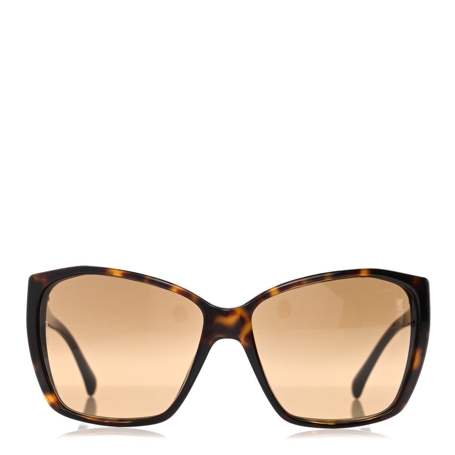 This is an authentic pair of CHANEL Acetate CC Sunglasses 5203 in Tortoise. These sunglasses have classic frames with dark brown lenses. The arms are thick and feature a gold Chanel CC logo at the temples.
