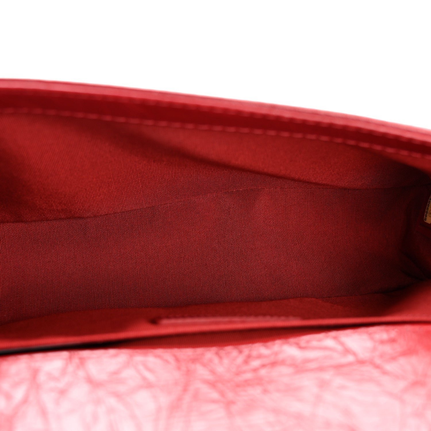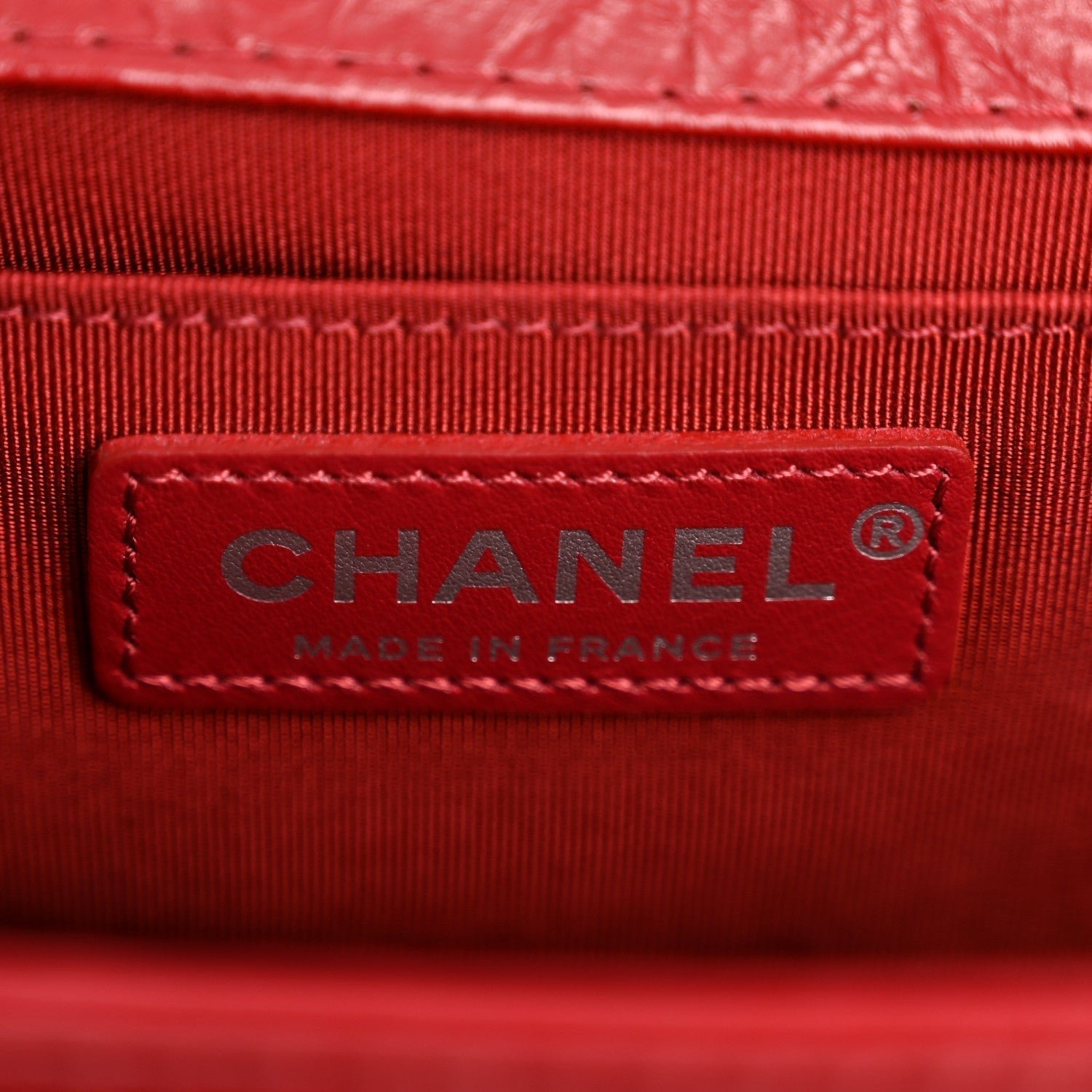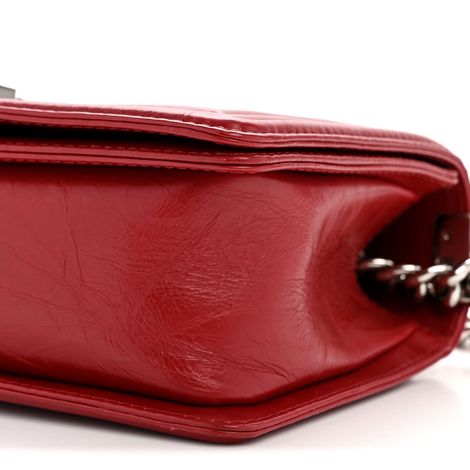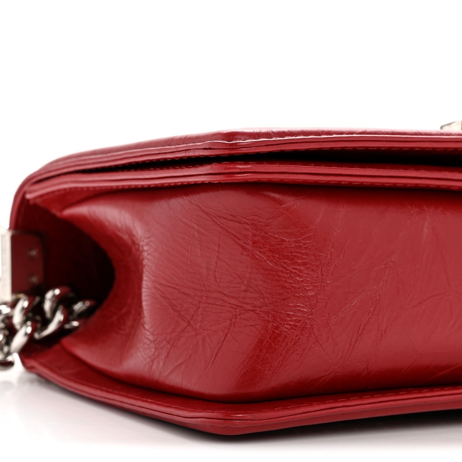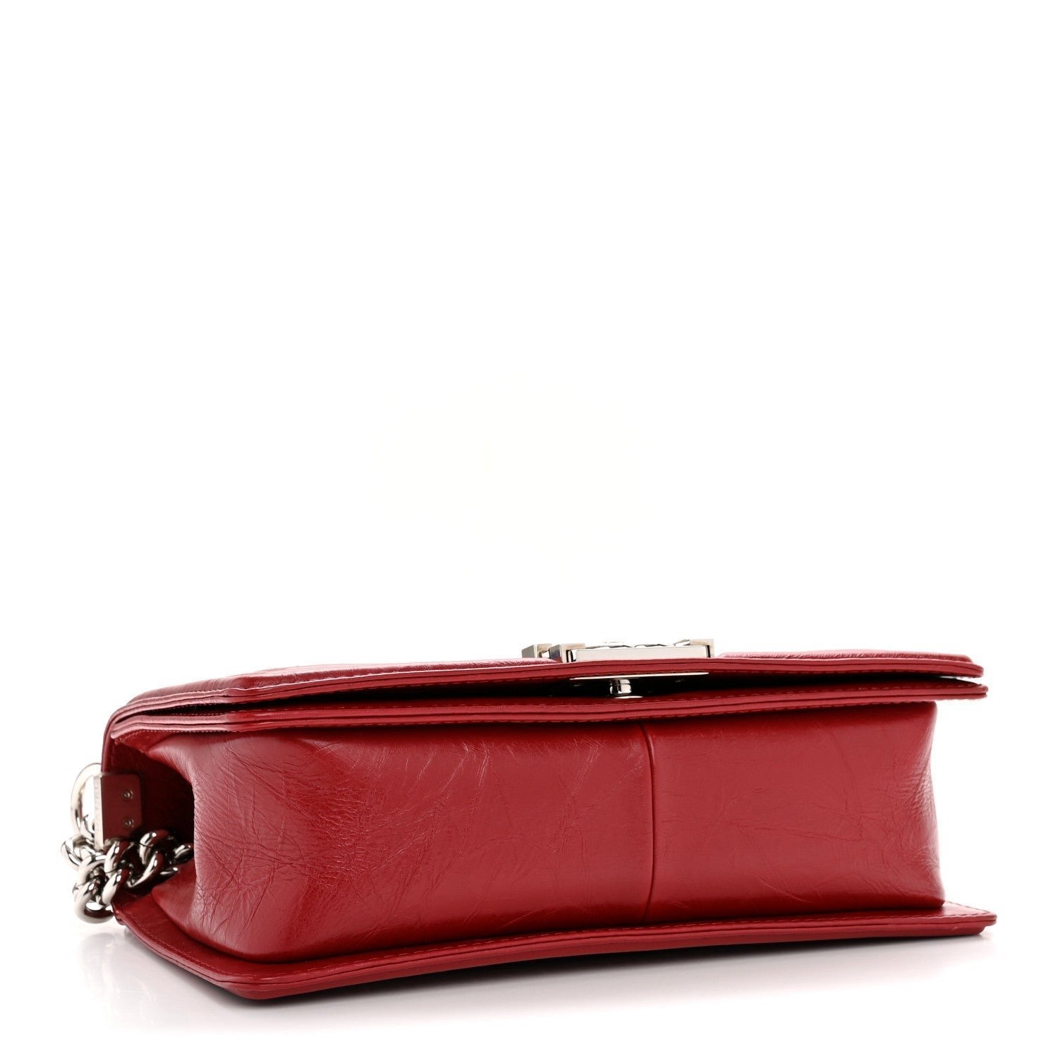 The bag is designed with a masculine-feminine allure, featuring the iconic graphic double C push-button clasp and a robust gourmette chain strap. It is accented with aged gold-tone metal hardware (or silver-tone depending on the specific seasonal run), which complements the “lived-in” luxury of the distressed calfskin. This combination of heritage tailoring details and the edgy Boy silhouette makes it a standout piece, blending the comfort of the House’s ready-to-wear codes with modern accessory design.