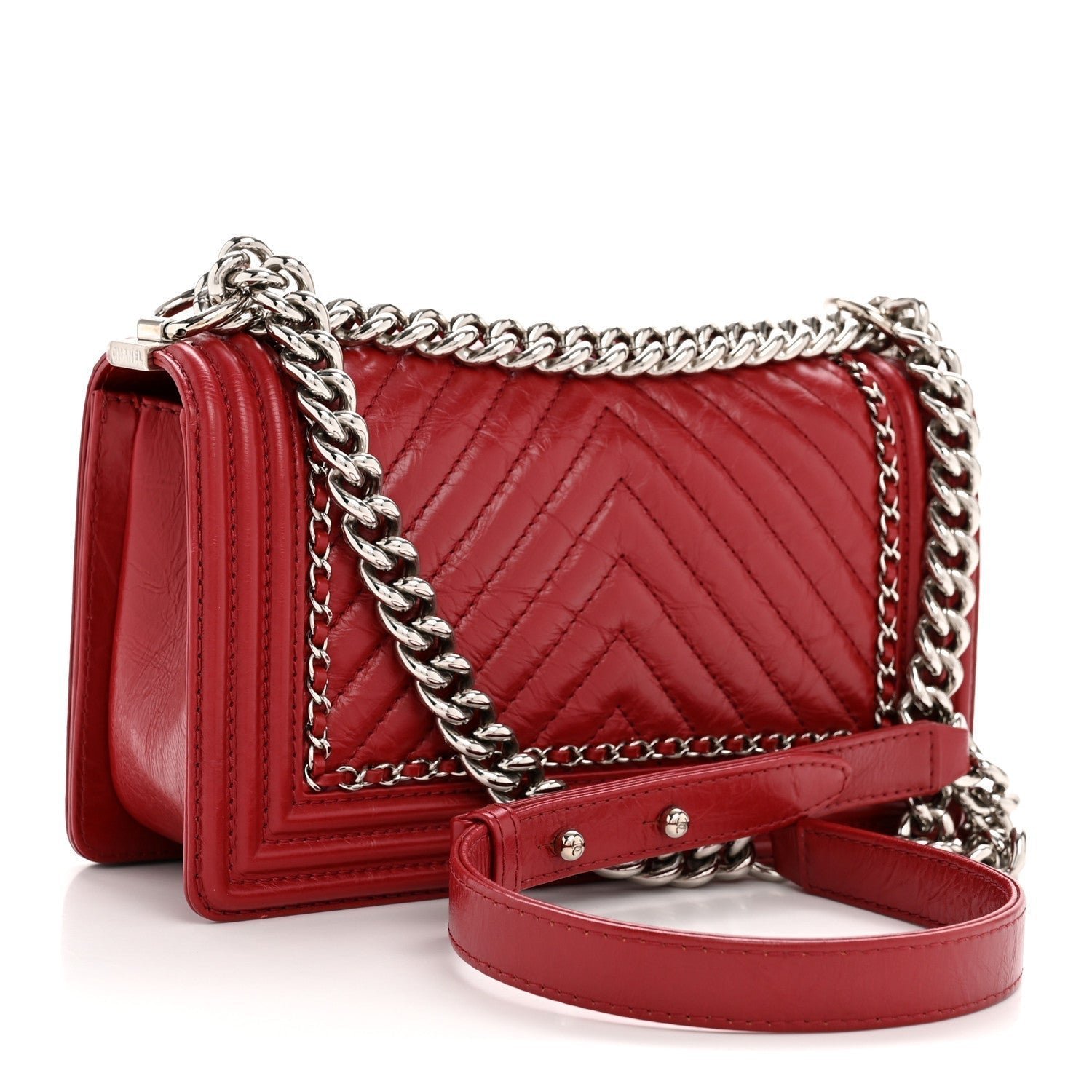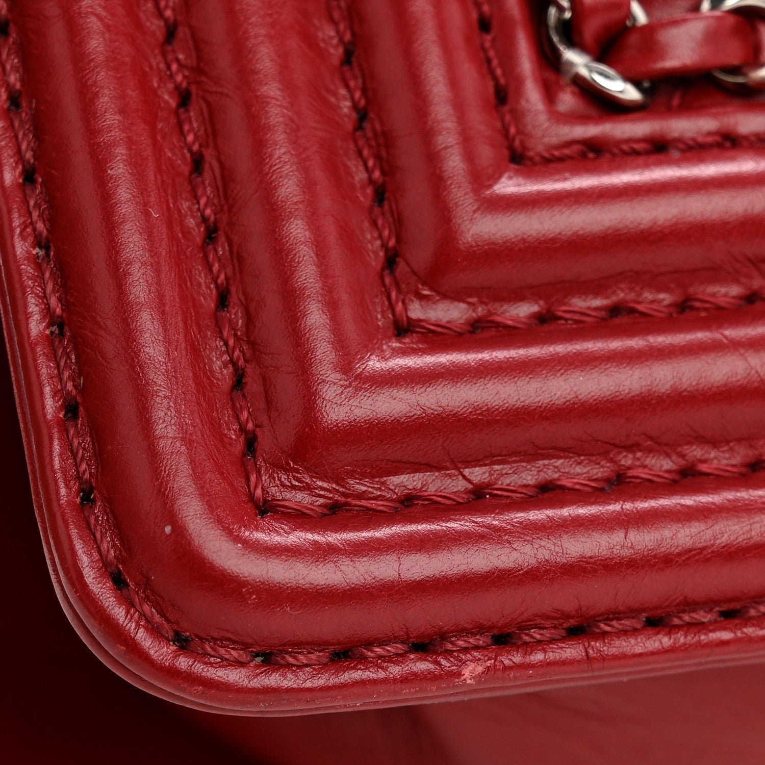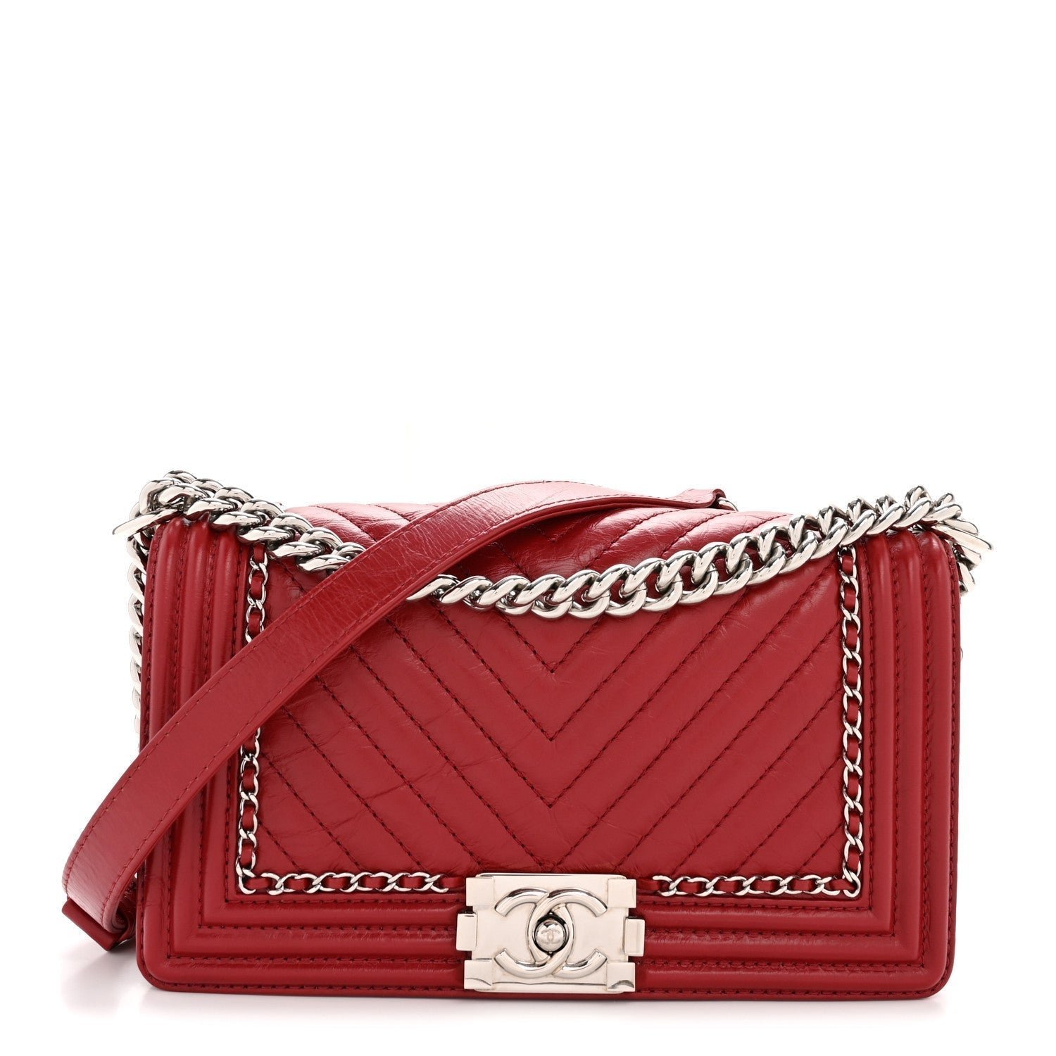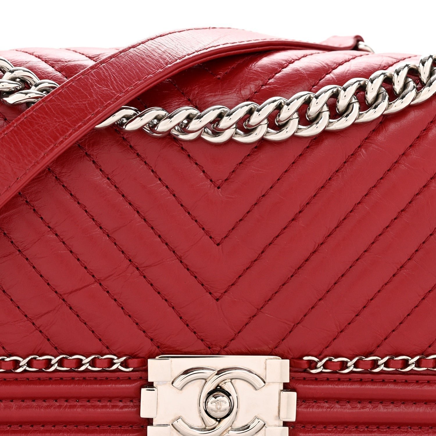 This specific model, often referred to as the “Jacket” Boy Flap due to its unique architectural detailing, is crafted from aged red calfskin leather. It features the collection’s signature chevron quilting pattern, which offers a dynamic, V-shaped alternative to the traditional diamond motif. The signature design element is the “Jacket” trim, characterized by a chain detail interwoven between the chevron pattern and framed by thick, linear quilting that mimics the braided edges of a classic Chanel tweed jacket.