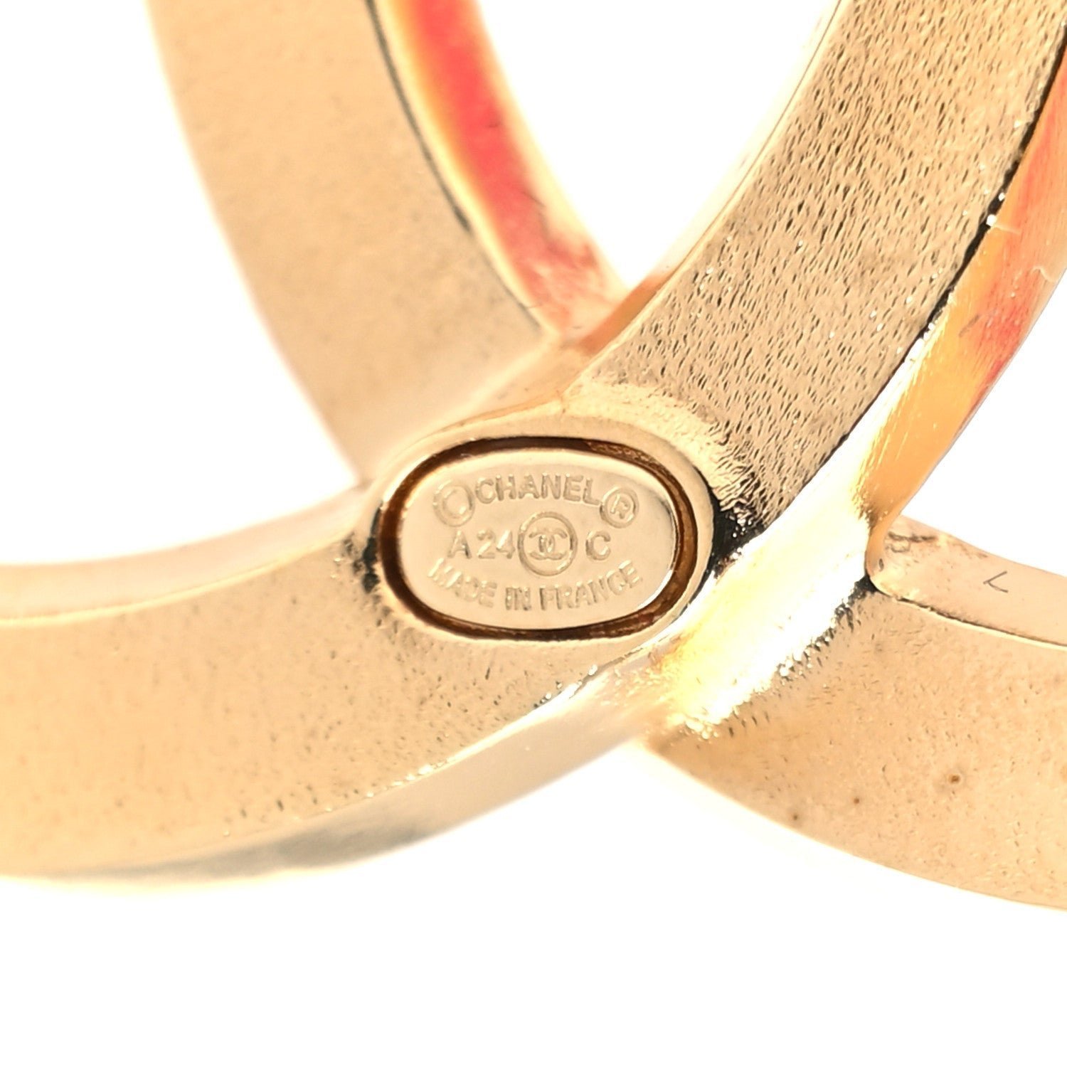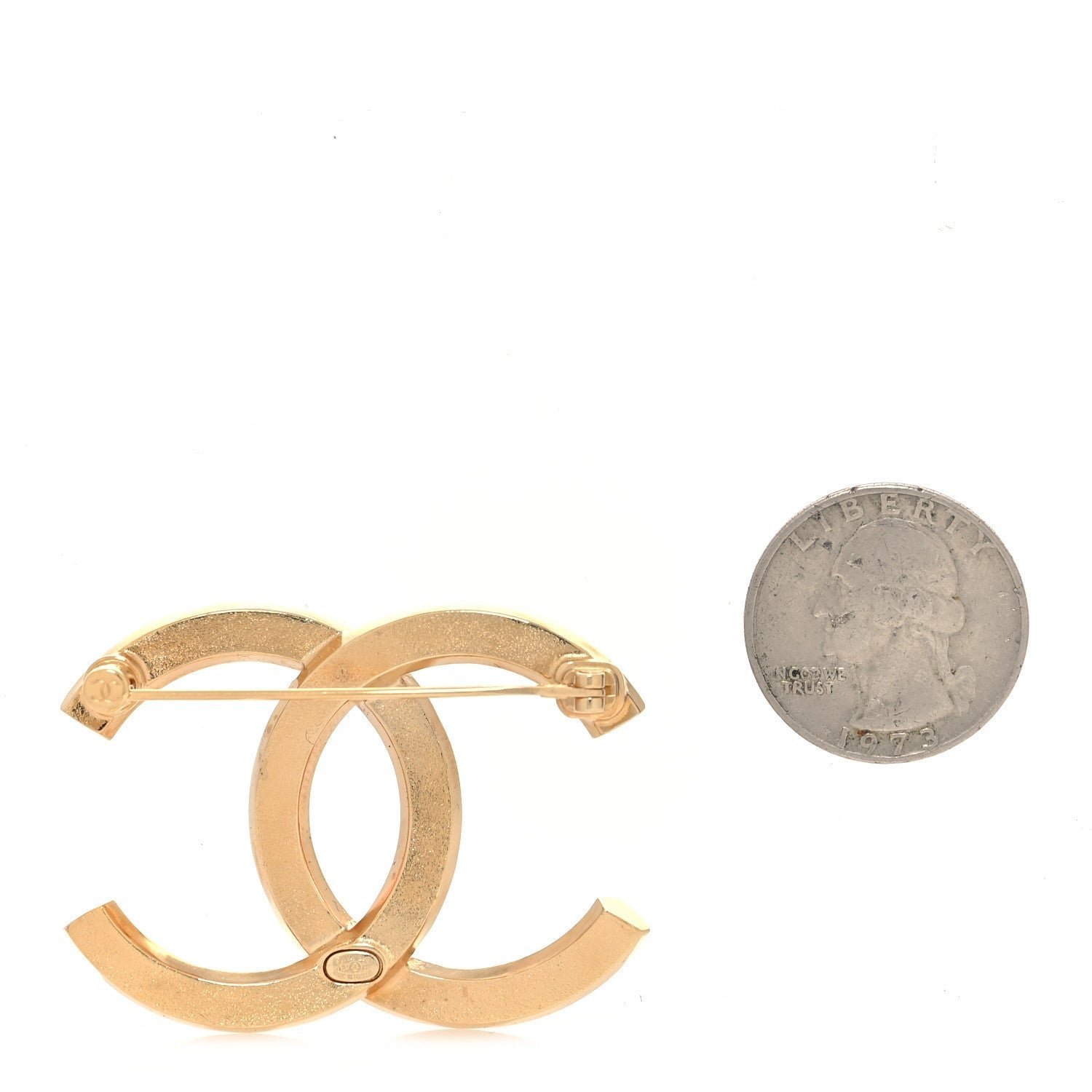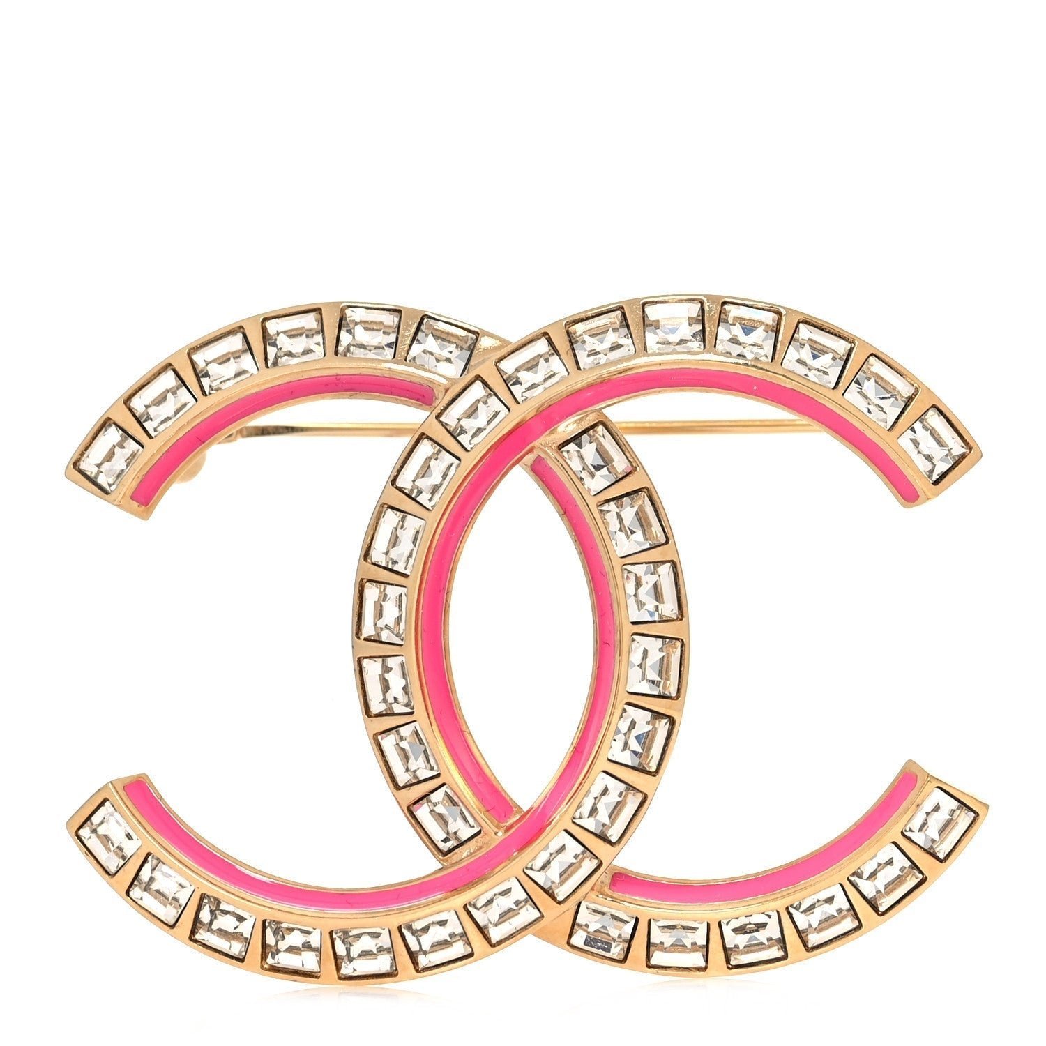 This is an authentic CHANEL Baguette Crystal CC Brooch in Gold and Pink. This brooch is a large gold Chanel CC logo lined with baguette crystals.