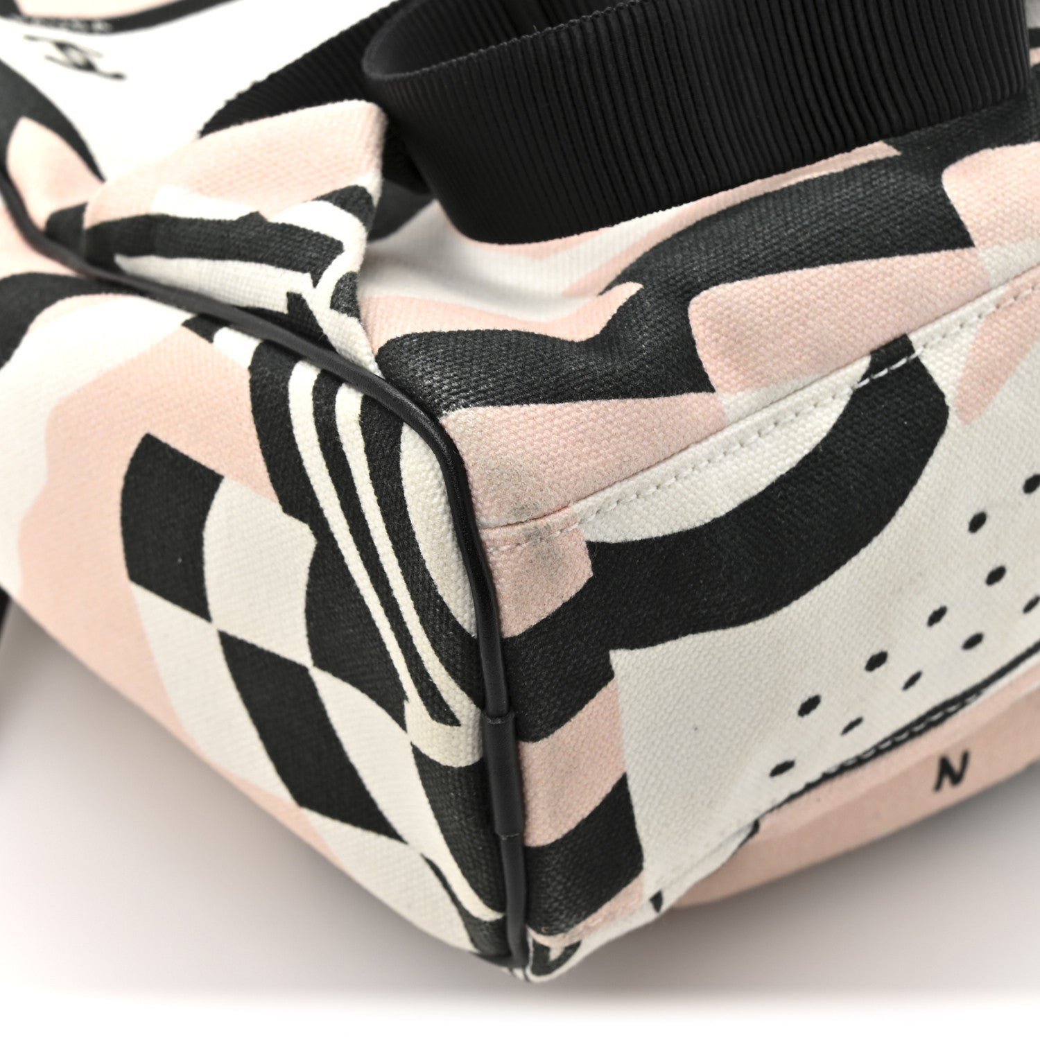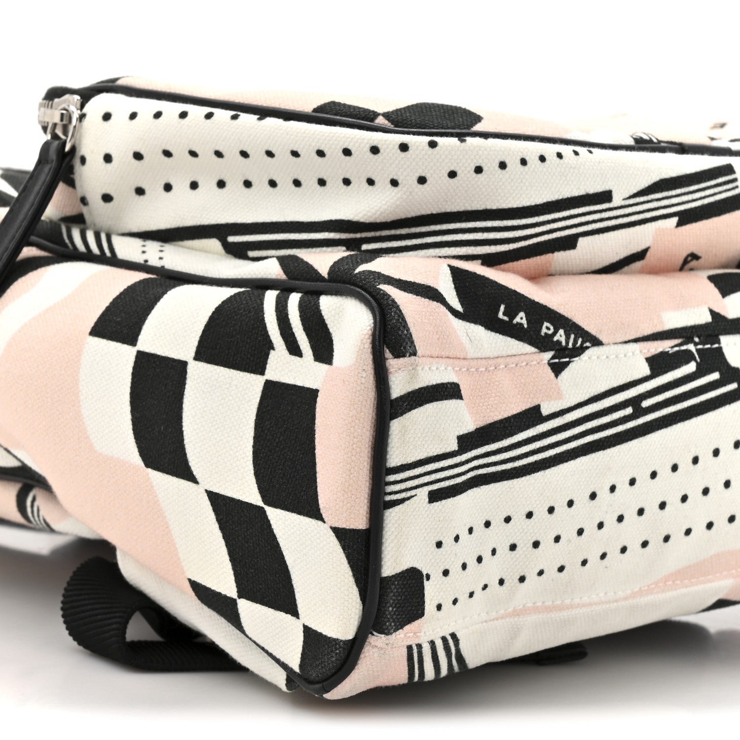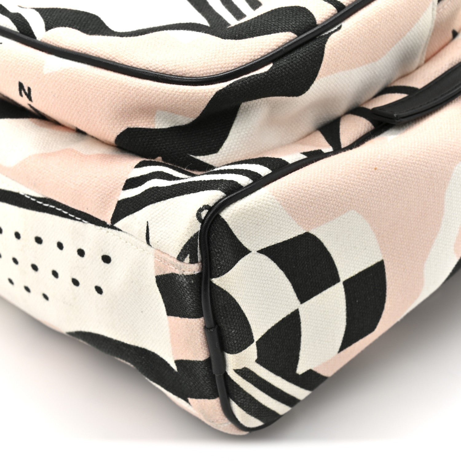 Designed for a sporty yet high-fashion holiday aesthetic, this backpack features a black leather top handle and adjustable black canvas shoulder straps for comfort. The functional wrap-around zipper opens to a spacious pink fabric interior that includes a secure zipper pocket for smaller essentials. Often released as a limited edition piece, this canvas version provides a durable and lightweight alternative to the collection’s vinyl counterparts, making it ideal for travel and resort excursions.