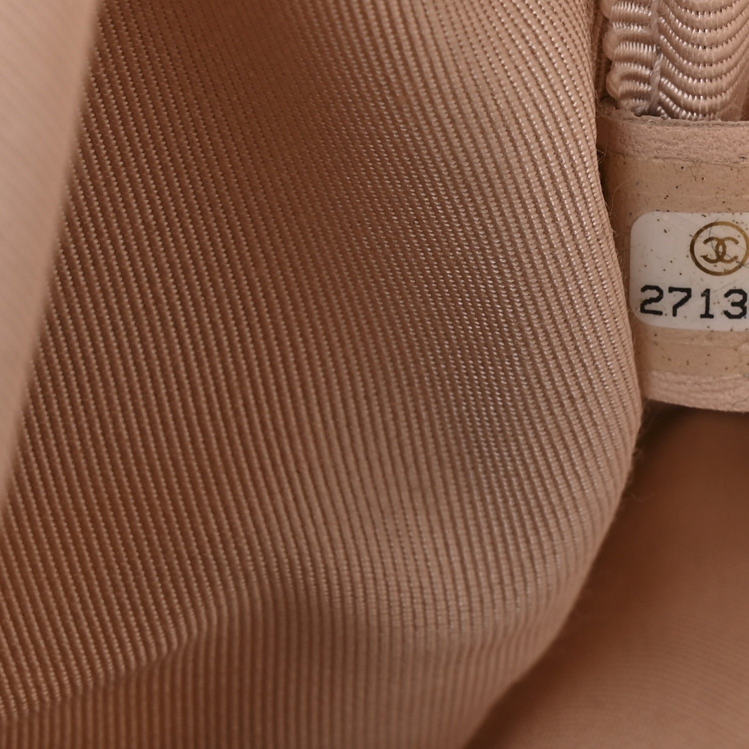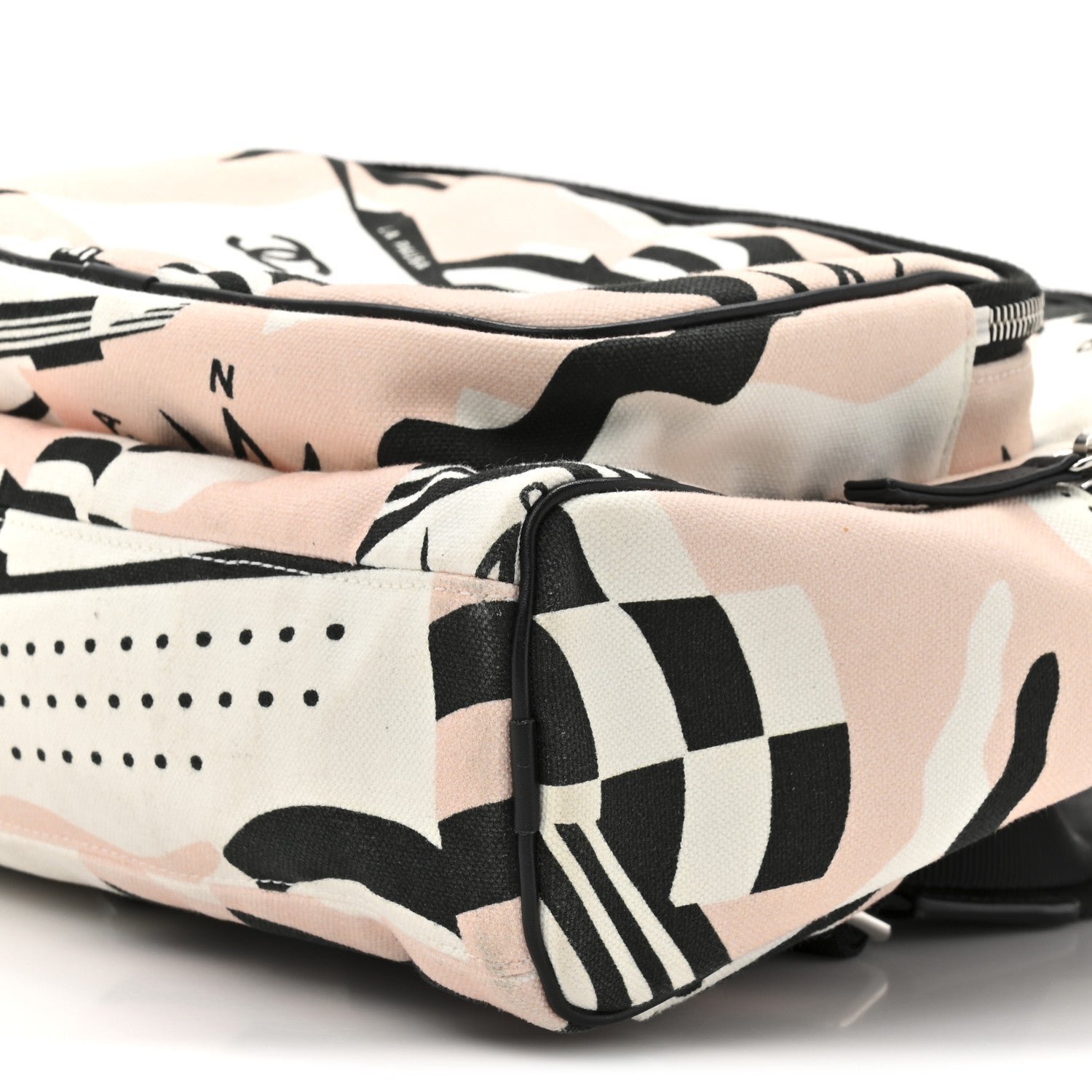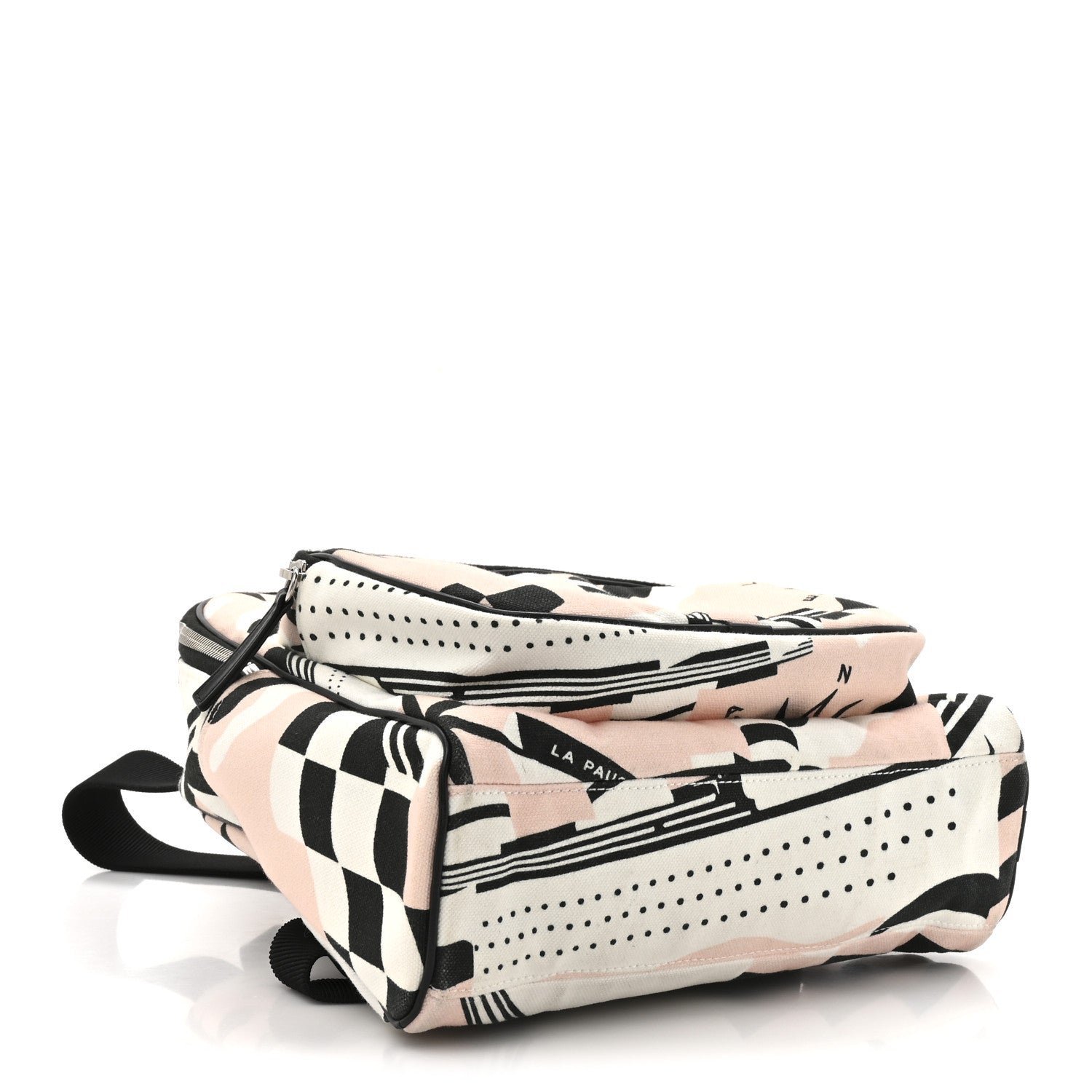 Designed for a sporty yet high-fashion holiday aesthetic, this backpack features a black leather top handle and adjustable black canvas shoulder straps for comfort. The functional wrap-around zipper opens to a spacious pink fabric interior that includes a secure zipper pocket for smaller essentials. Often released as a limited edition piece, this canvas version provides a durable and lightweight alternative to the collection’s vinyl counterparts, making it ideal for travel and resort excursions.