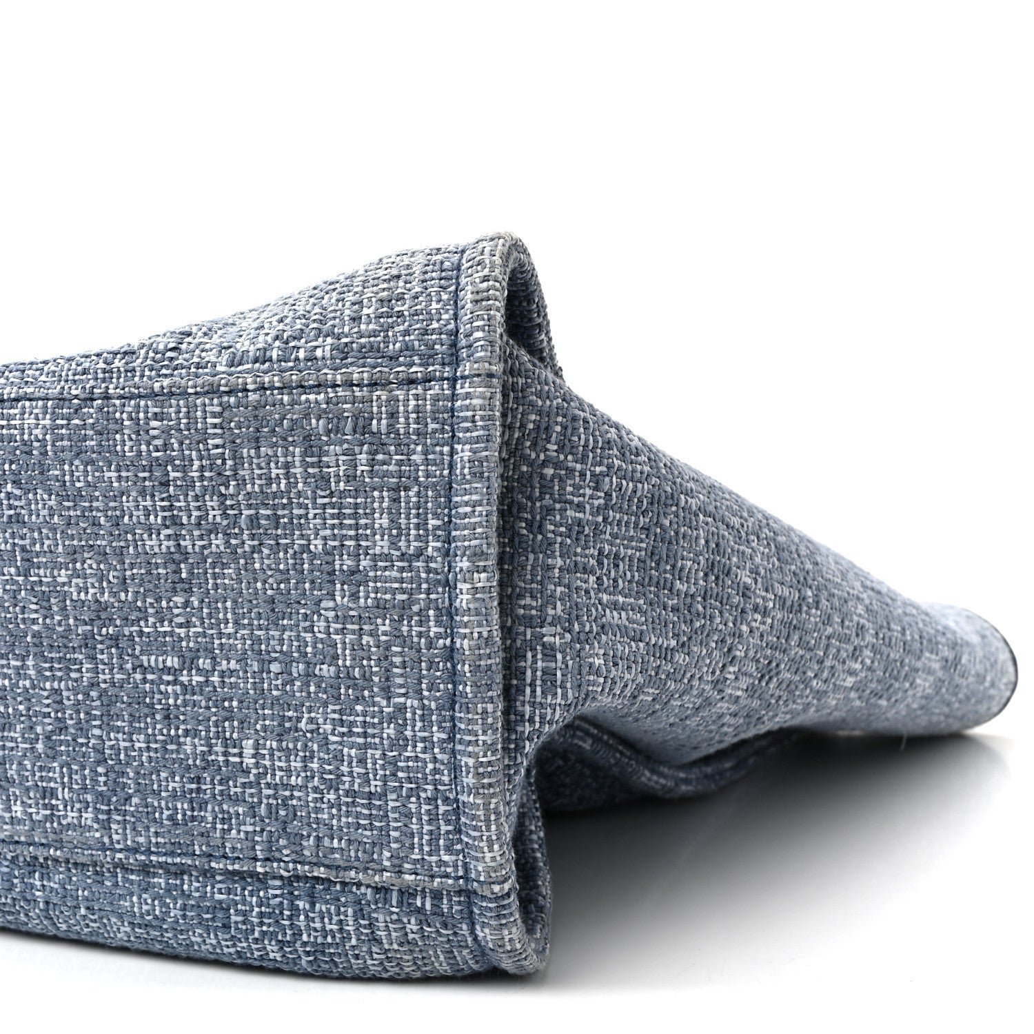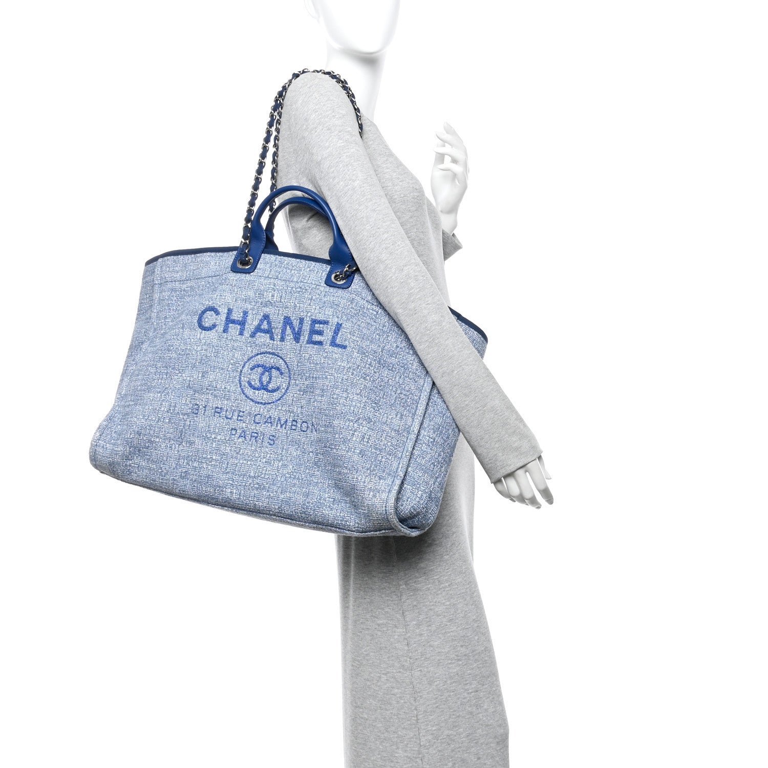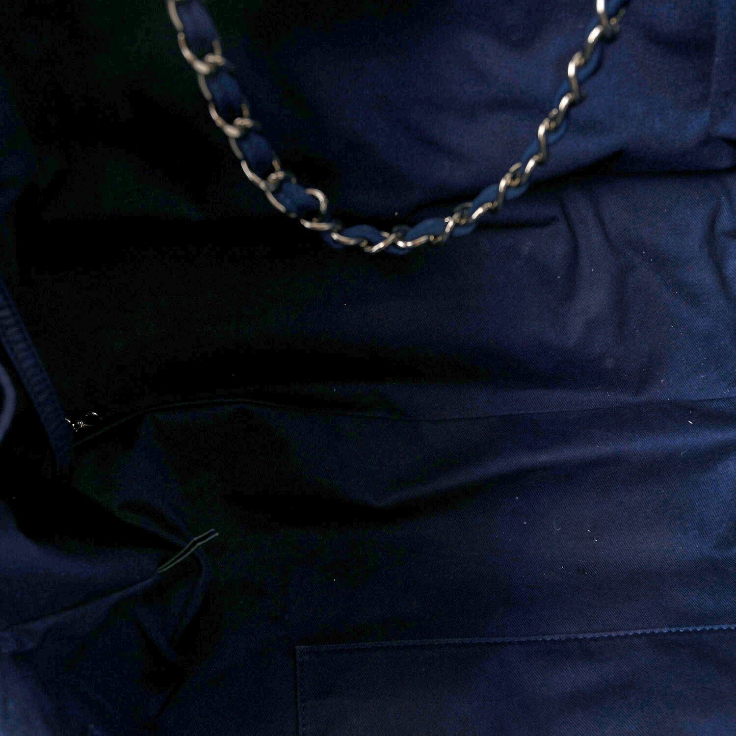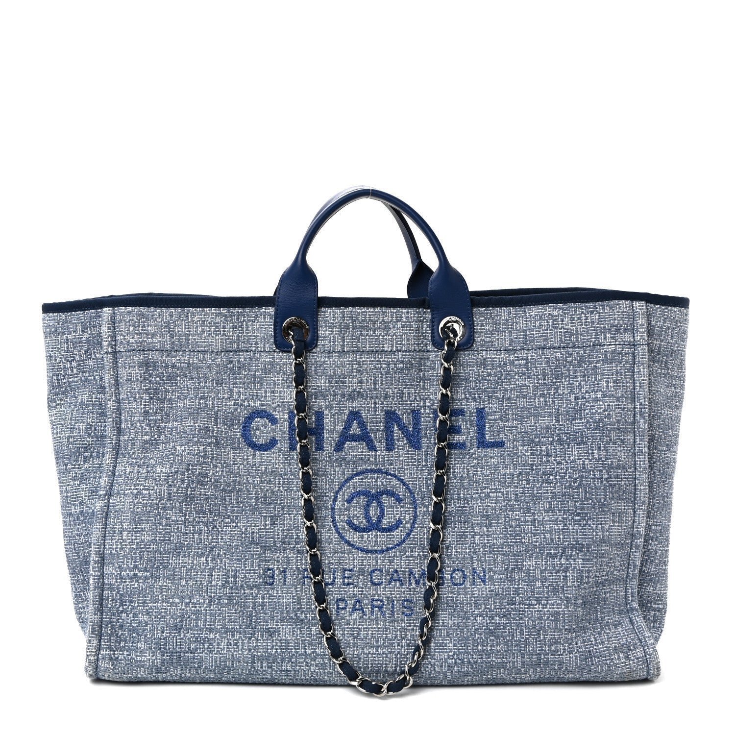 This specific model is crafted from a durable blue woven canvas, featuring the House’s signature “jacquard” style texture that balances a relaxed resort aesthetic with high-fashion structure. Originally introduced in the Spring/Summer 2012 collection, the Deauville line is named after the French seaside resort where Coco Chanel opened her first boutique. The defining design element is the large “CHANEL” branding and the 31 Rue Cambon address printed prominently on the front in a contrasting blue hue.