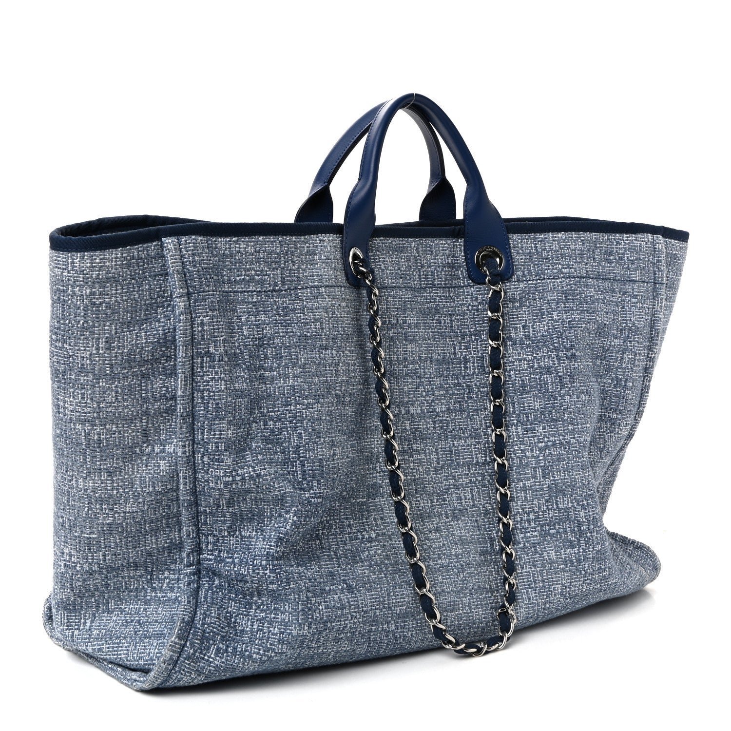 Designed for maximum utility, the Extra Large version (often referred to as the XL or XXL) is the most spacious in the Deauville family, making it an ideal choice for travel, beach days, or as a sophisticated “everything” bag. It features dual rolled leather top handles for hand carry and longer interwoven silver-tone chain and fabric straps for comfortable shoulder wear. The bag secures with a magnetic stud closure and opens to a spacious tonal fabric interior equipped with two large zipper pockets and multiple slip compartments to keep essentials organized.
