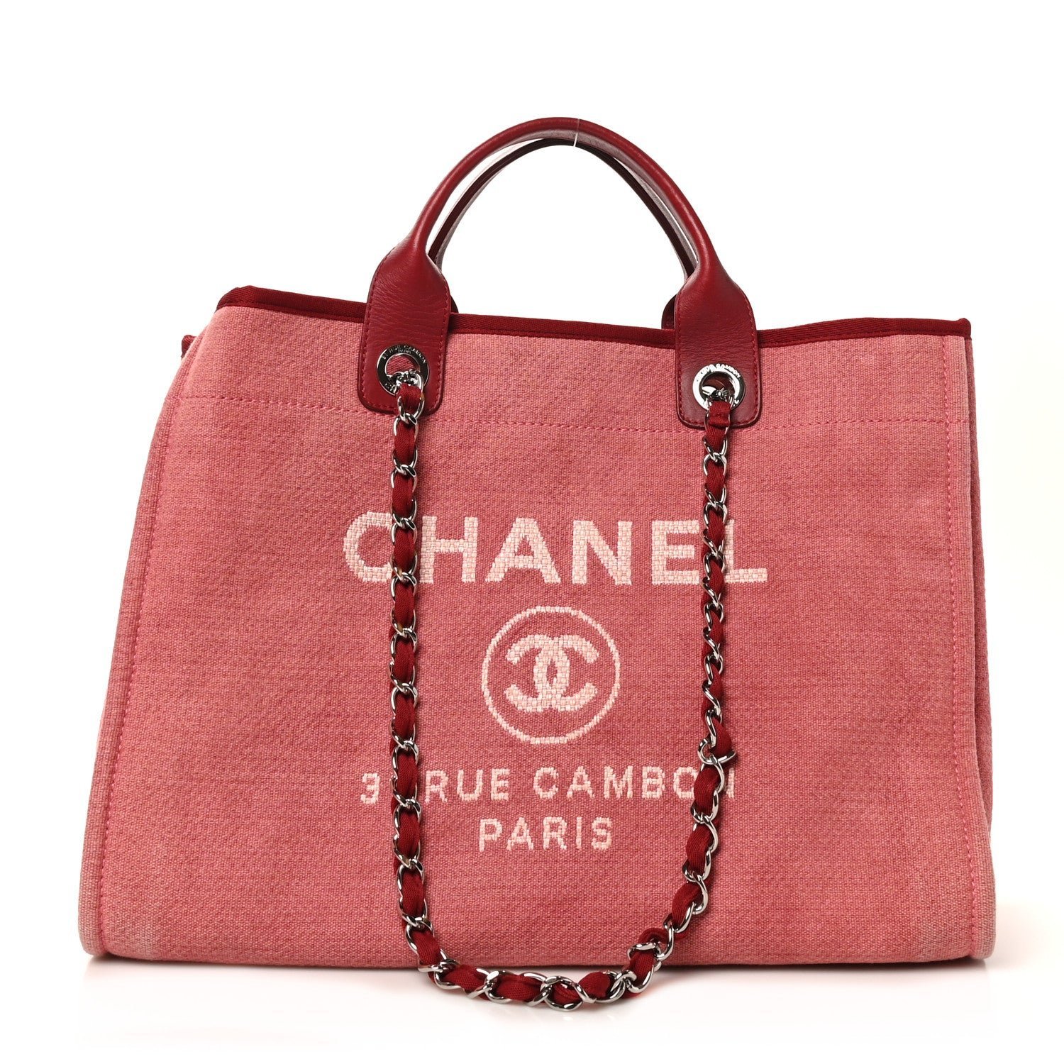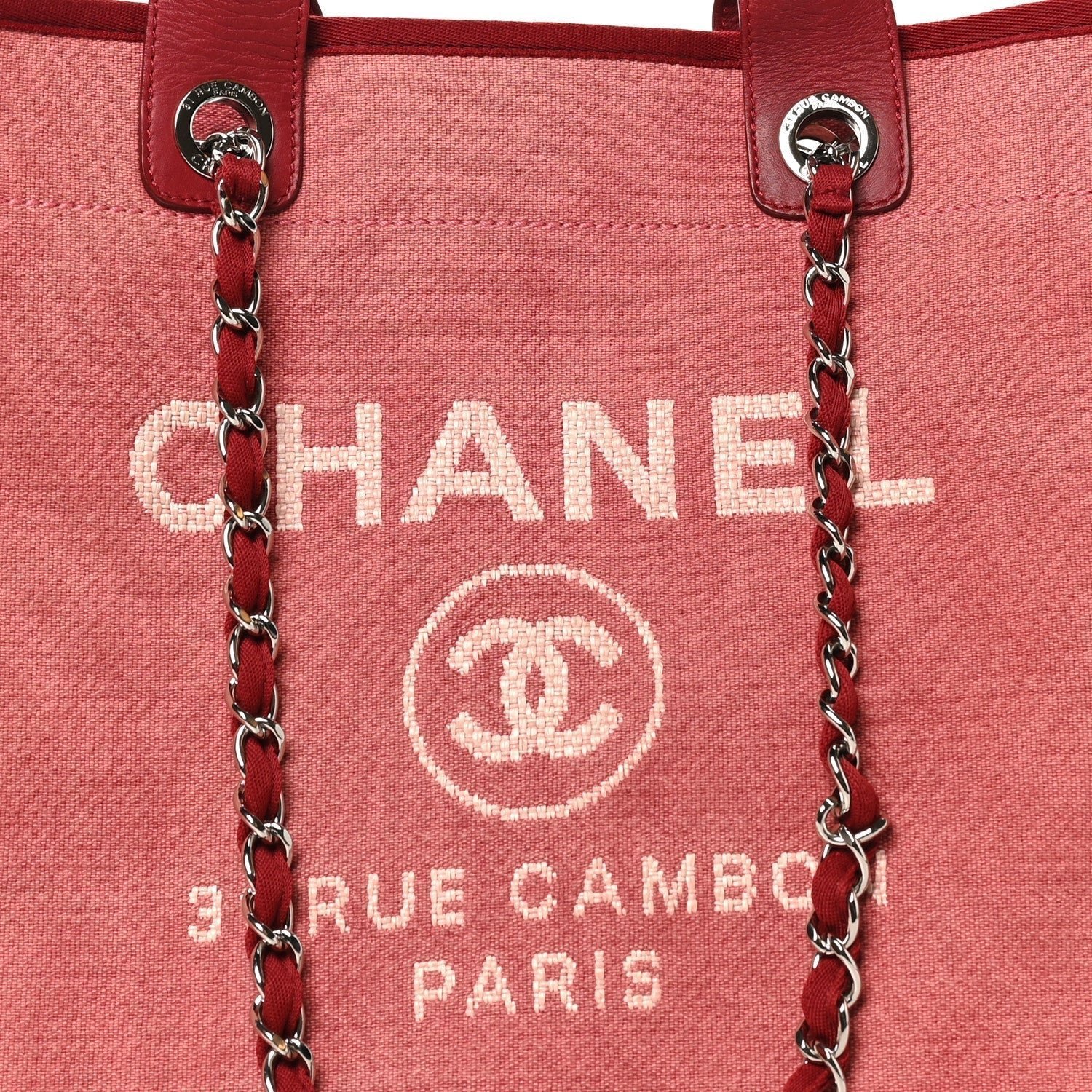This specific model is crafted from red woven canvas, featuring a rich, textured finish that is both durable and lightweight. Part of the iconic Deauville family, this medium-sized version is designed for those who need a practical daily bag that doesn’t compromise on the House’s classic elegance. The defining design element is the large “CHANEL” branding and the 31 Rue Cambon address printed on the front in a contrasting white or tonal red hue.