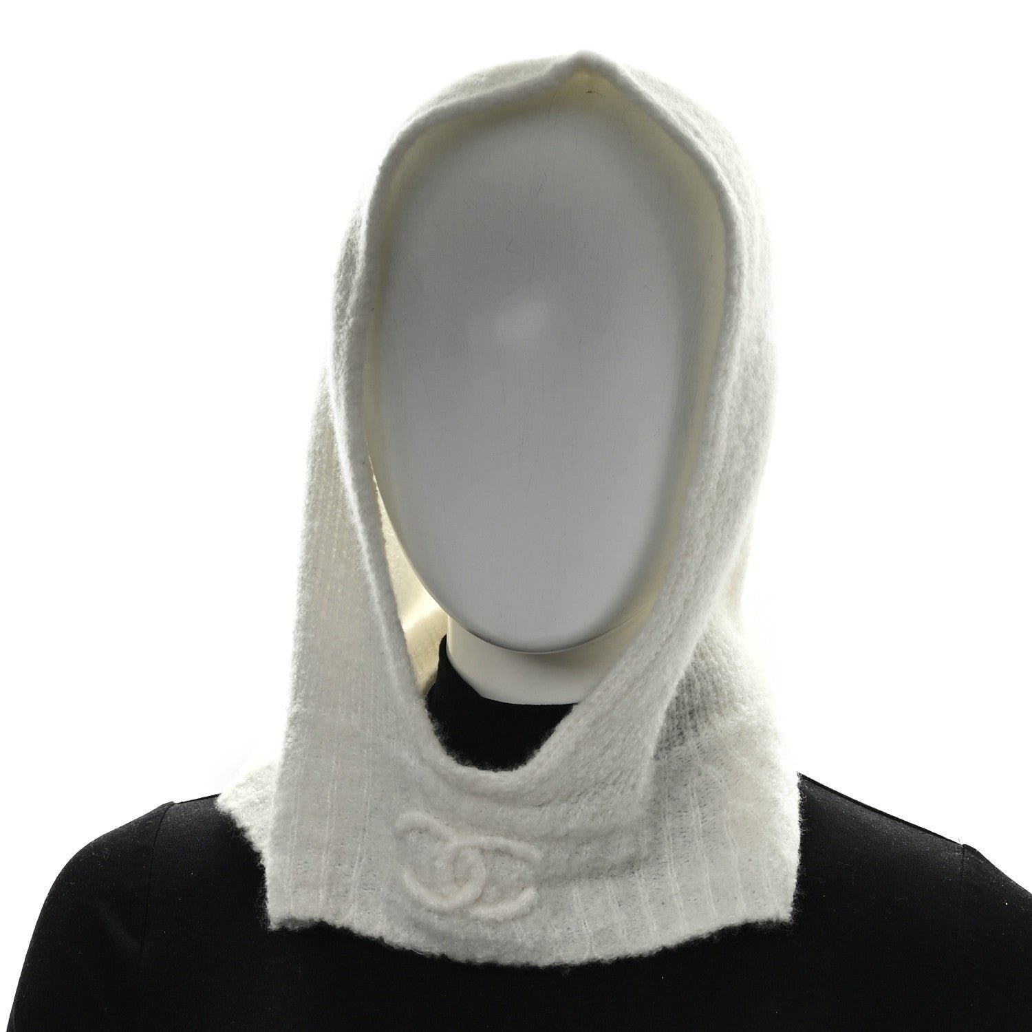 This is an authentic CHANEL Cashmere Balaclava in White. The hat is crafted of cashmere blend fabric with a matching CC logo.