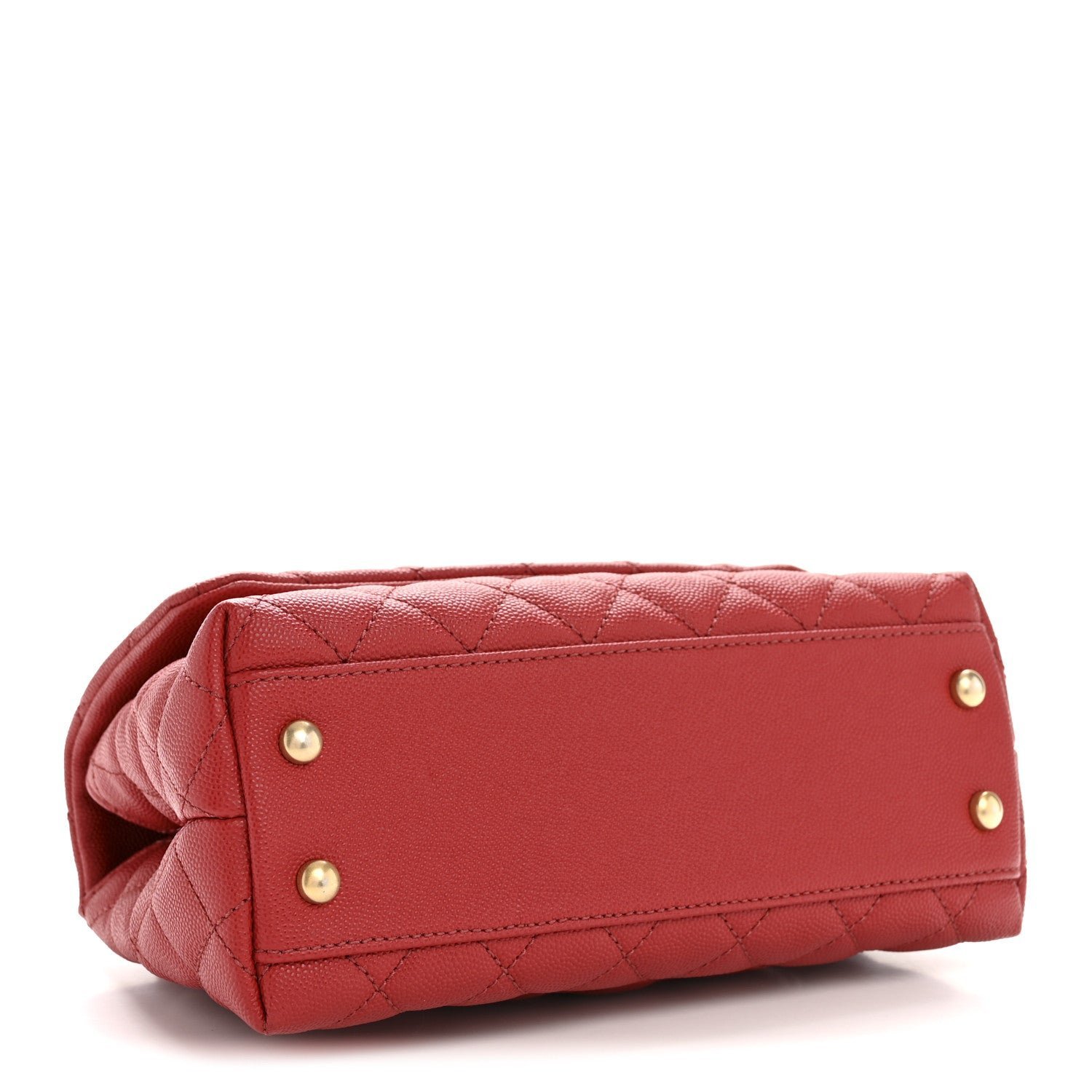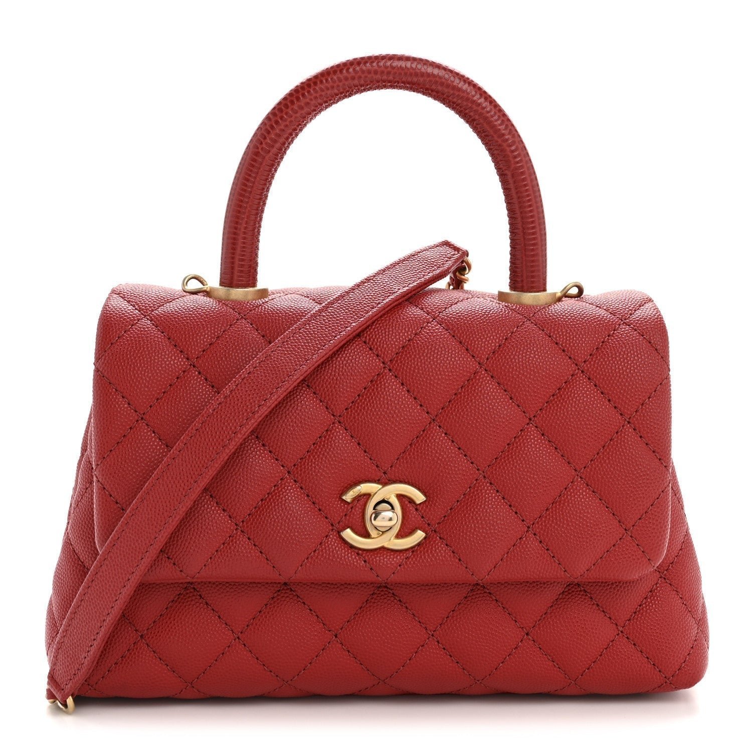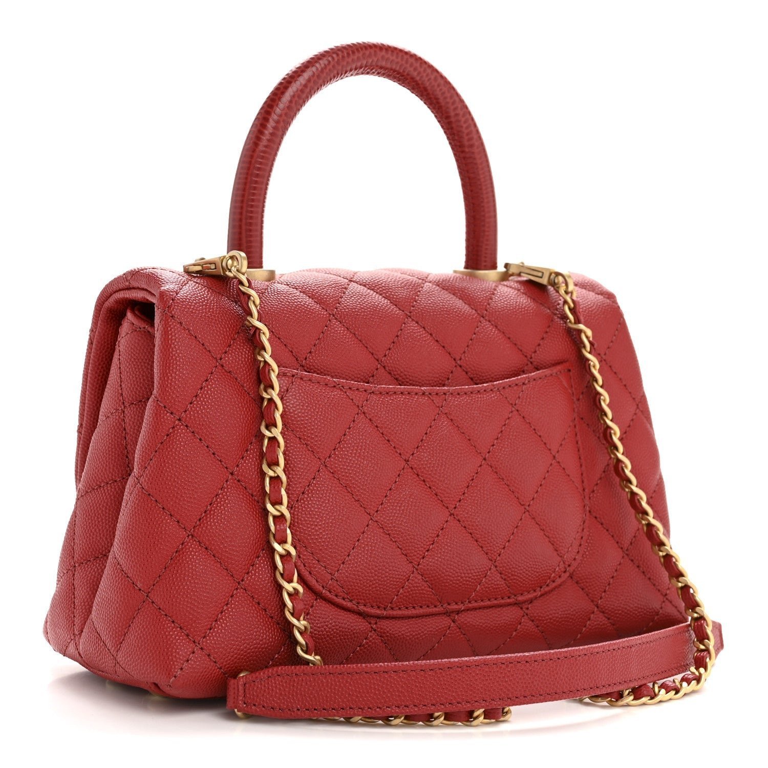 This specific model is crafted from red caviar leather, a highly durable and pebbled calfskin prized for its resistance to scratches and its ability to hold a structured shape over time. A standout feature of this edition is the lizard-embossed leather top handle, which provides a luxurious, exotic texture and a subtle tonal or slight contrast to the main body of the bag. The design is finished with the iconic gold-tone interlocking CC turn-lock and matching hardware.