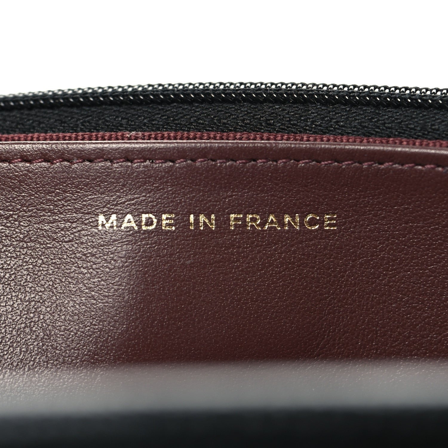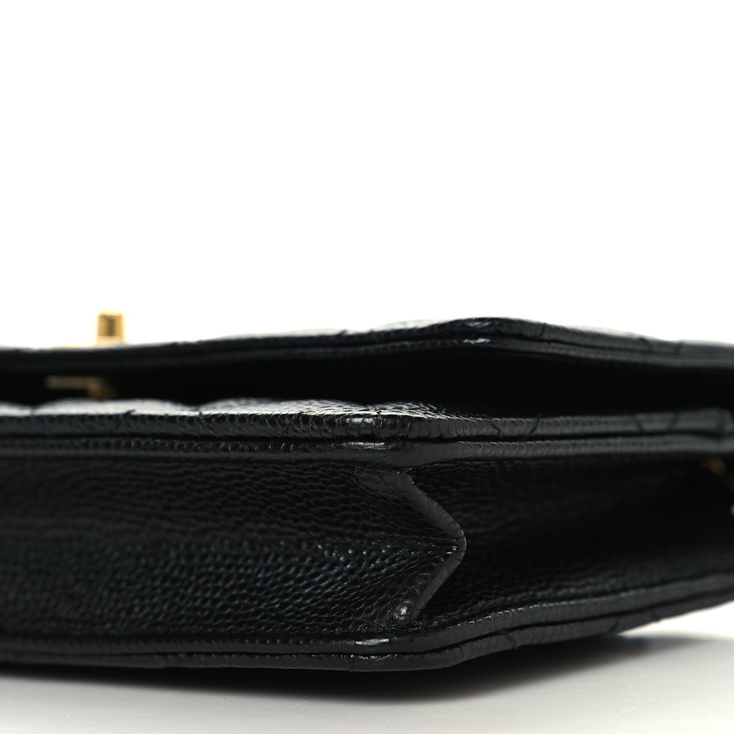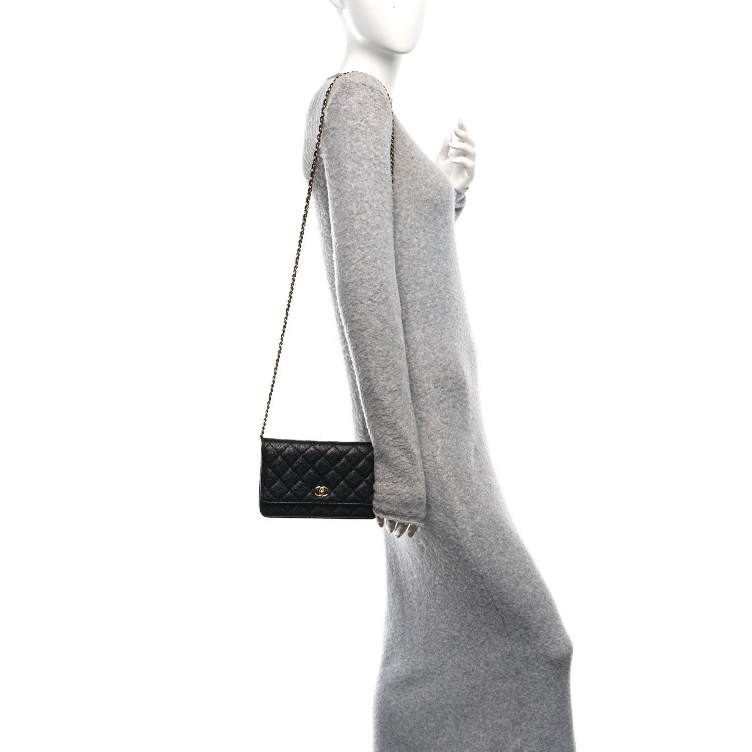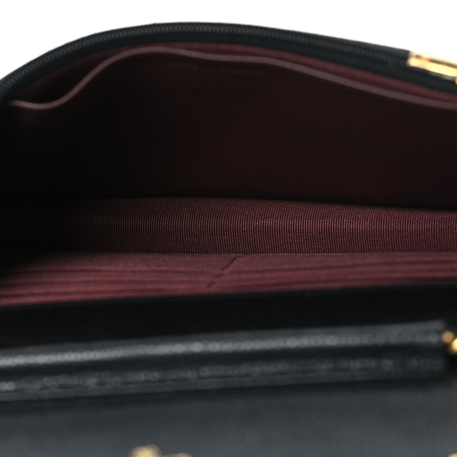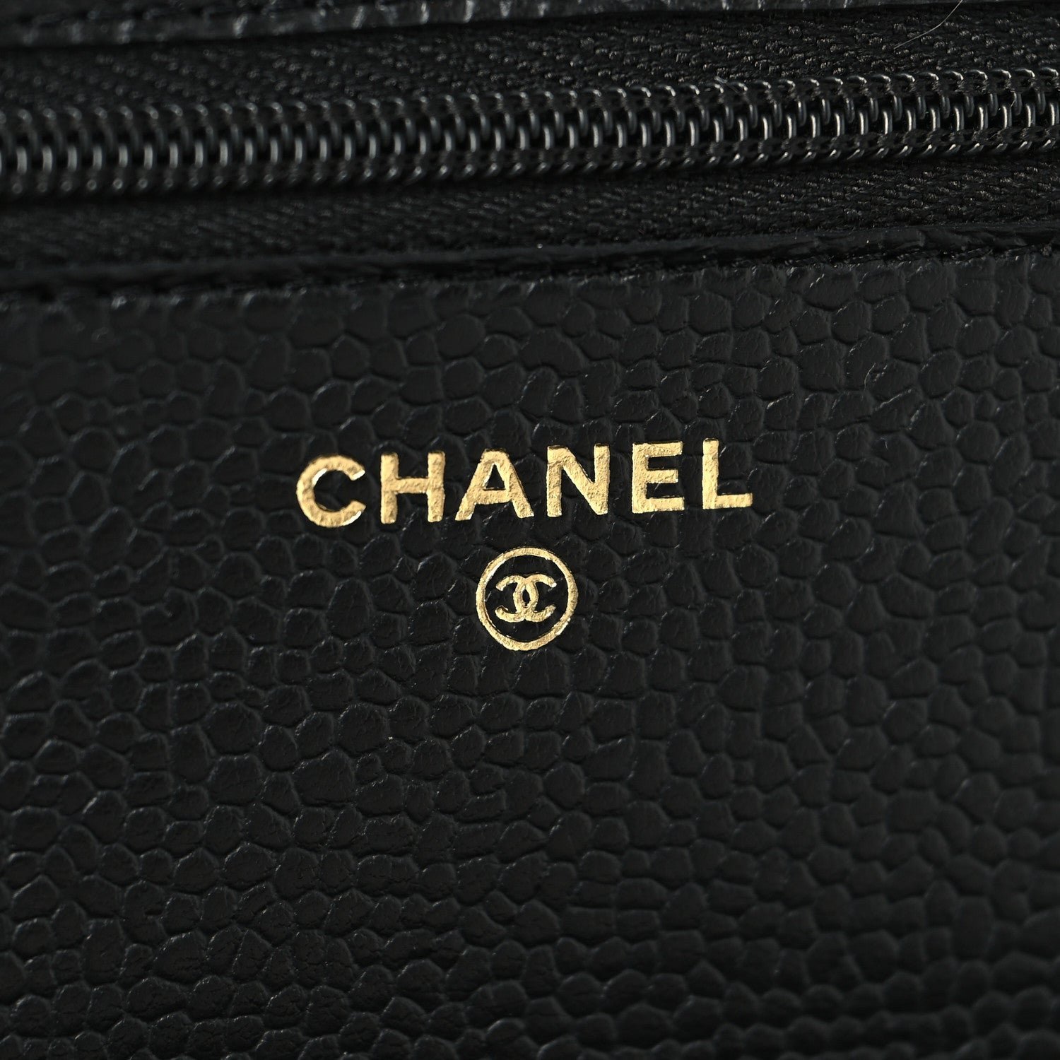 Defining Feature: Unlike the standard WOC which typically uses a snap button, this model is defined by a functional CC turn-lock closure on the front flap. This feature effectively converts the wallet into a “mini bag,” mirroring the look of the larger Classic Flap.