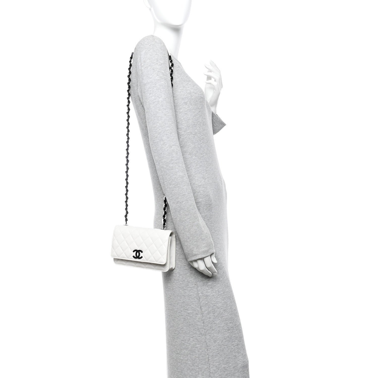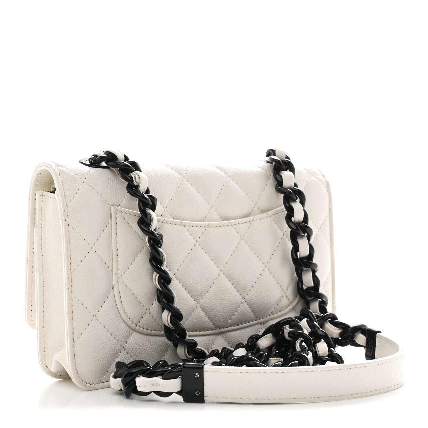 Strap & Carry: Equipped with a chunky interwoven black-tone chain and white leather strap. With a drop of approximately 24 inches, it is designed for both shoulder and crossbody carry.