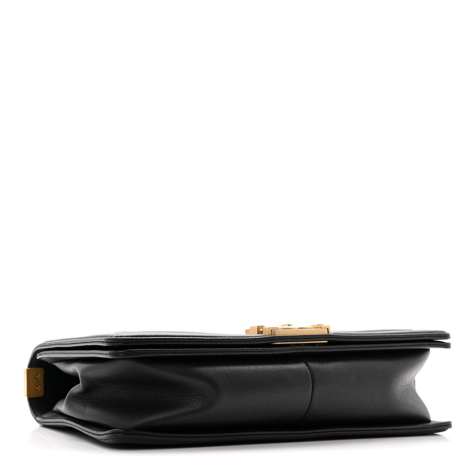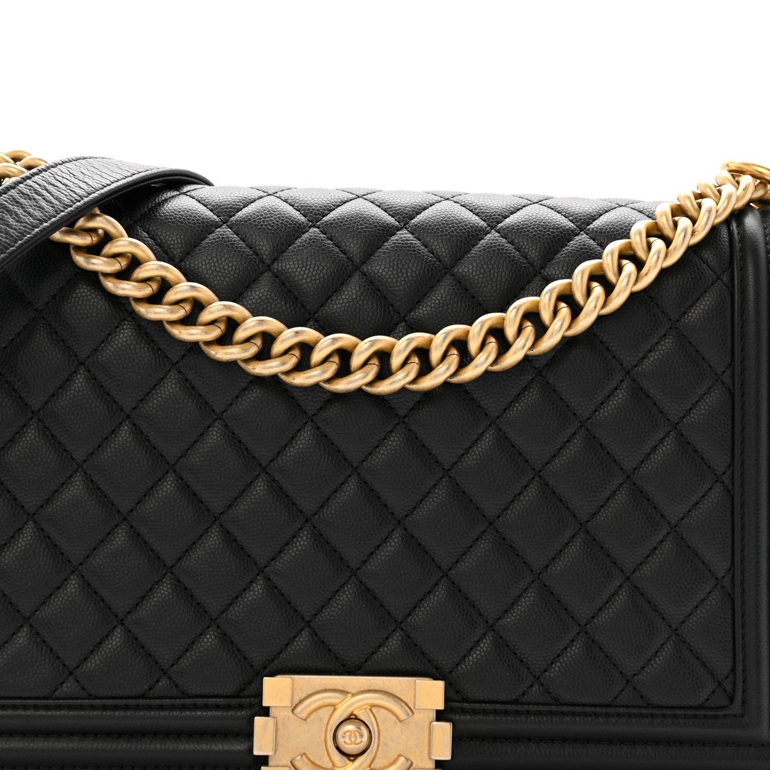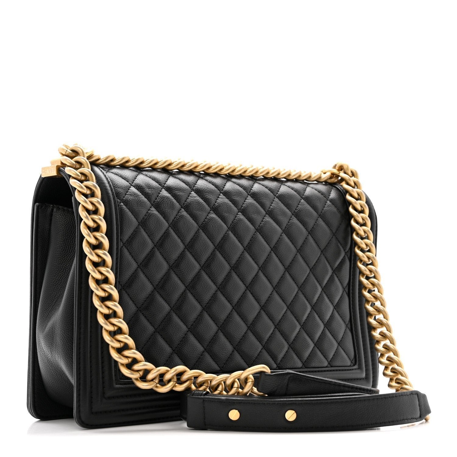 The Chanel Caviar Quilted “New Medium” Boy Flap in Black with Gold Hardware is a modern staple in the Boy collection, designed for those who require more interior space than the original “Old Medium” size. Introduced shortly after the initial launch of the Boy Bag line, this version is frequently referred to as the “Jumbo” in some markets due to its roomier, boxier silhouette.