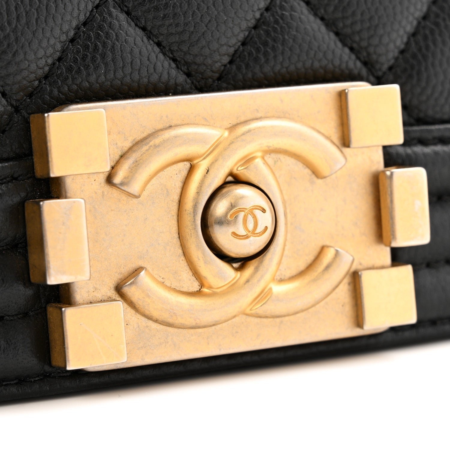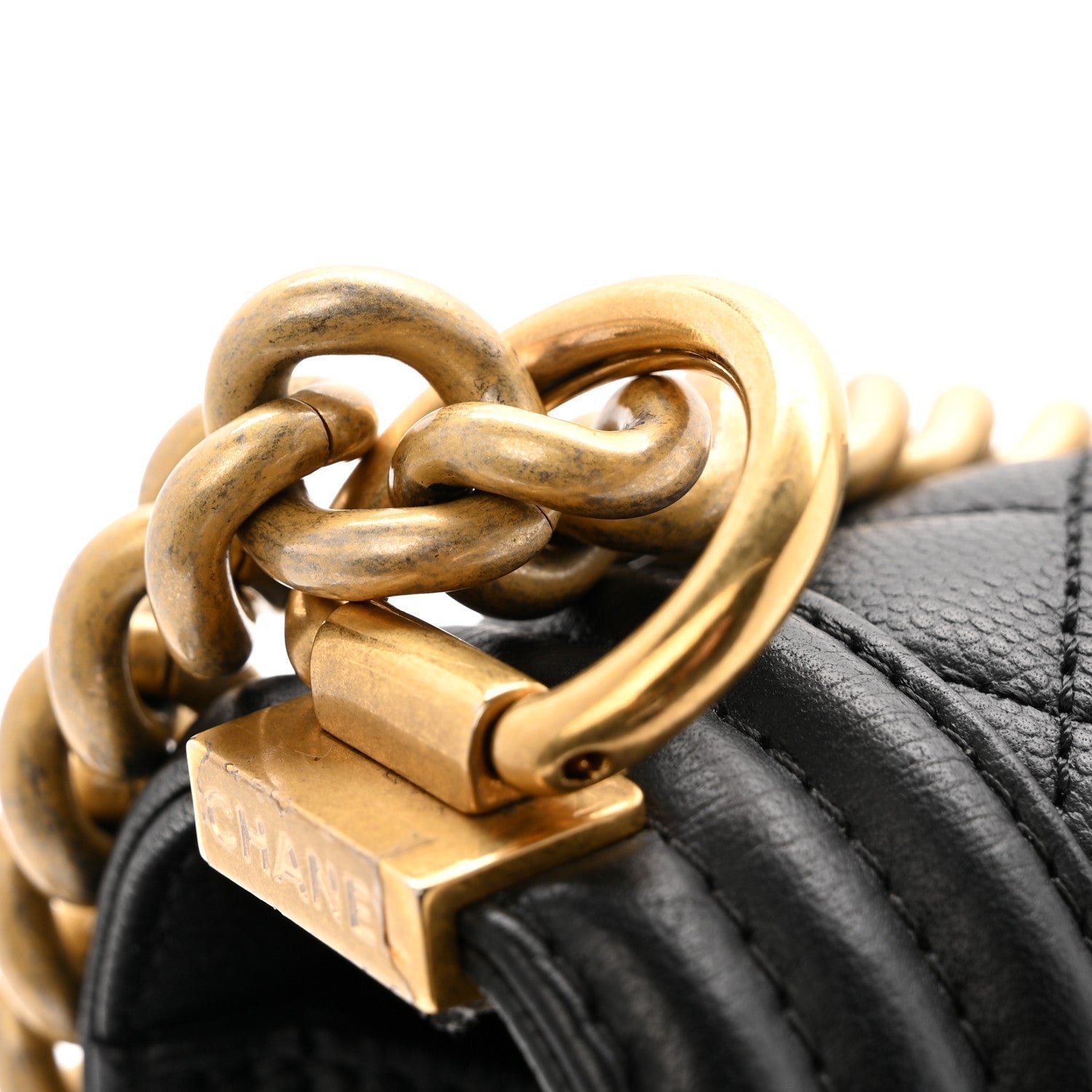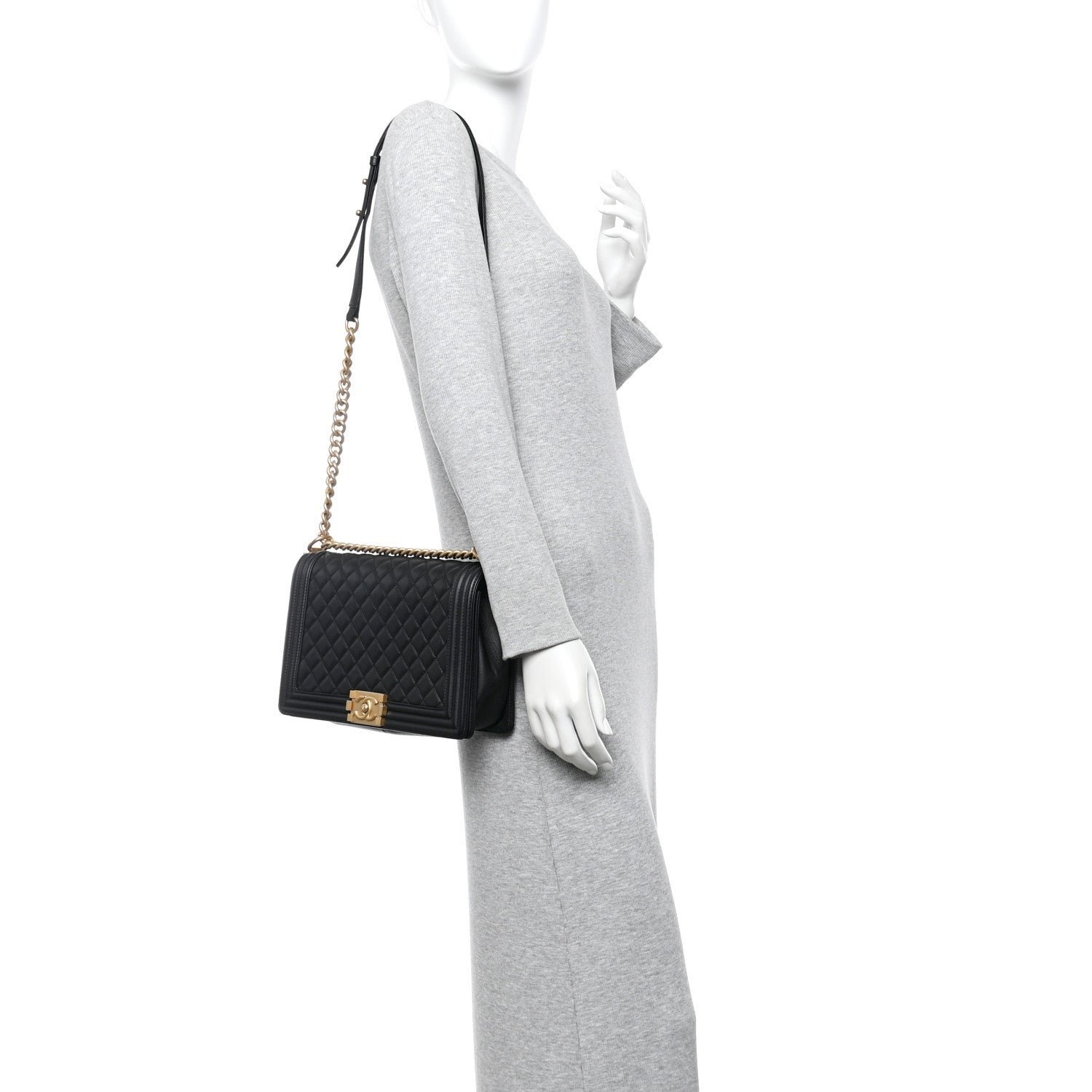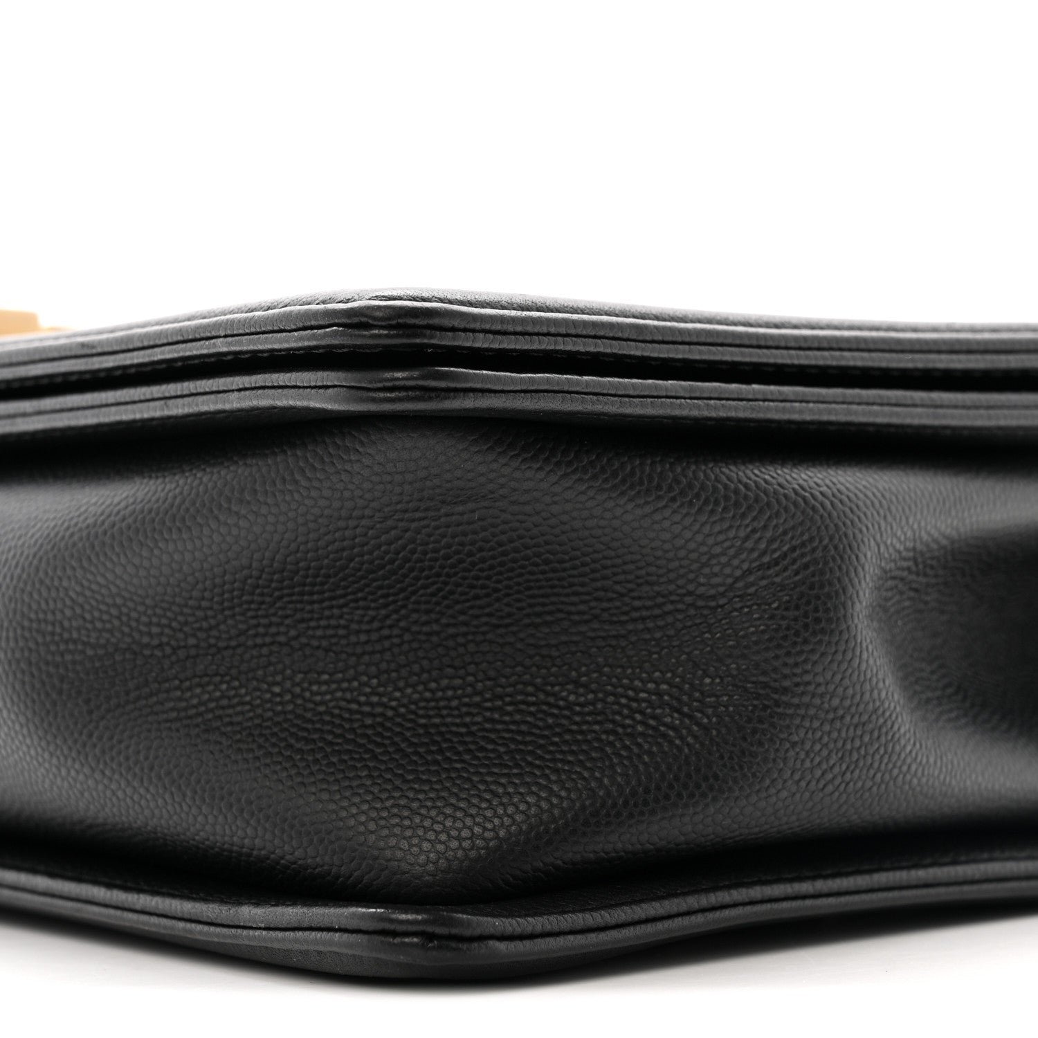 The Chanel Caviar Quilted “New Medium” Boy Flap in Black with Gold Hardware is a modern staple in the Boy collection, designed for those who require more interior space than the original “Old Medium” size. Introduced shortly after the initial launch of the Boy Bag line, this version is frequently referred to as the “Jumbo” in some markets due to its roomier, boxier silhouette.