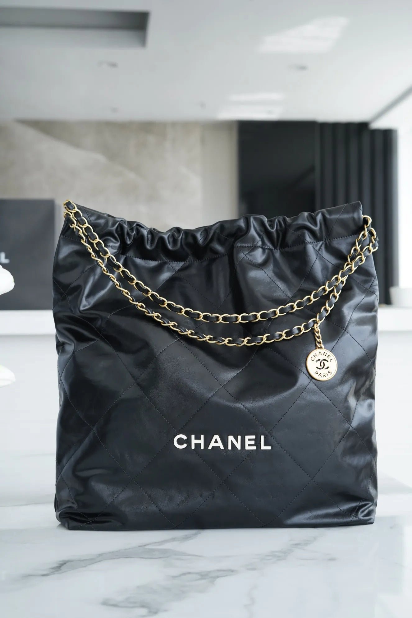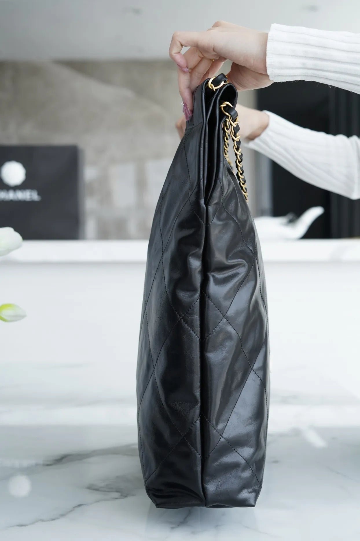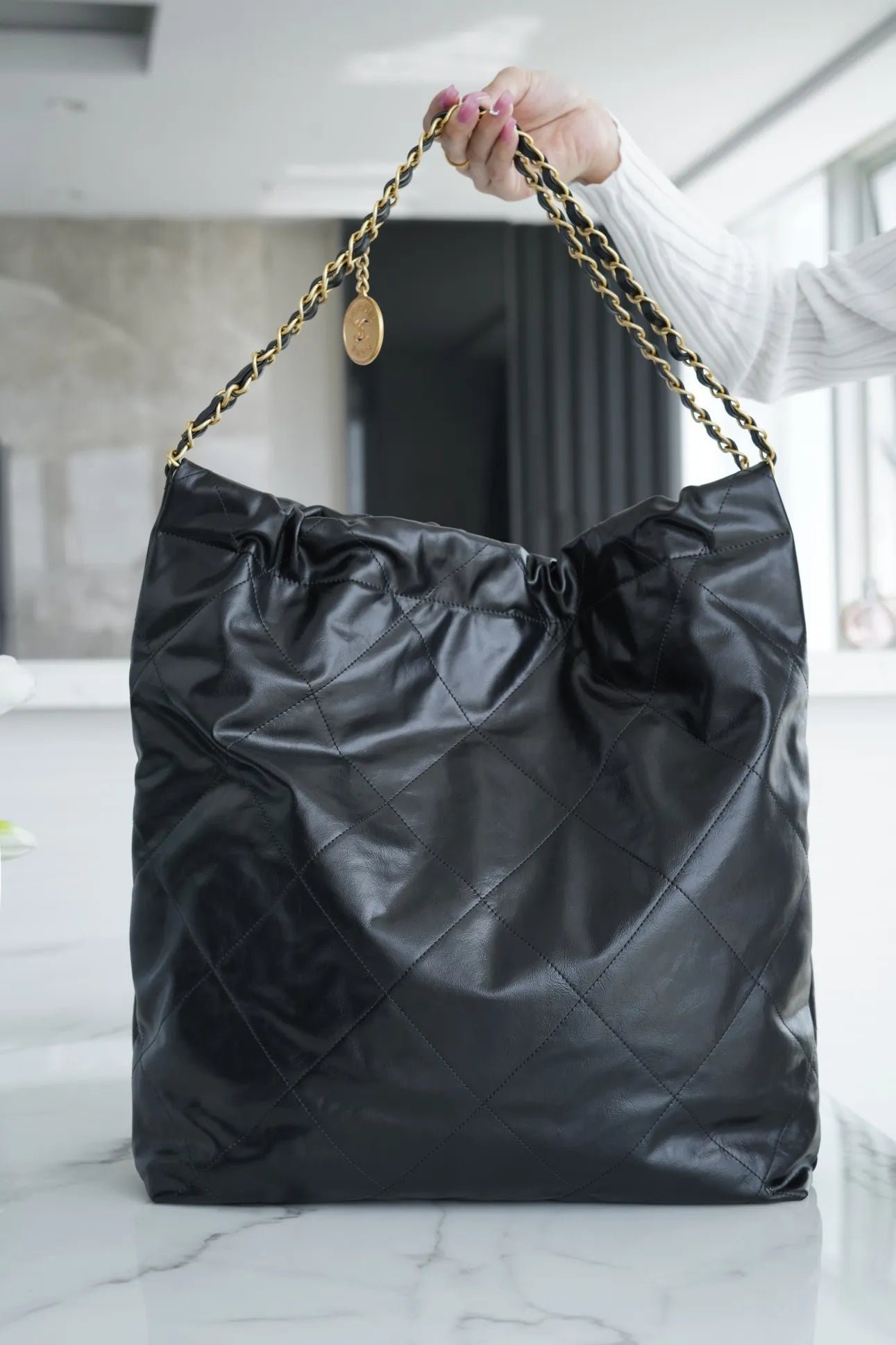 Described as a “genuine ally for daily life,” the CHANEL 22 bag combines a hobo-inspired silhouette with high-fashion codes. It features a practical magnetic button and drawstring closure that creates its characteristic “chic trash bag” aesthetic a playful nod to elevated functionality. The bag is equipped with a long interwoven chain strap that allows for comfortable shoulder wear, and the large version provides a particularly spacious interior, making it ideal for those who need to carry more, including a laptop or daily essentials.