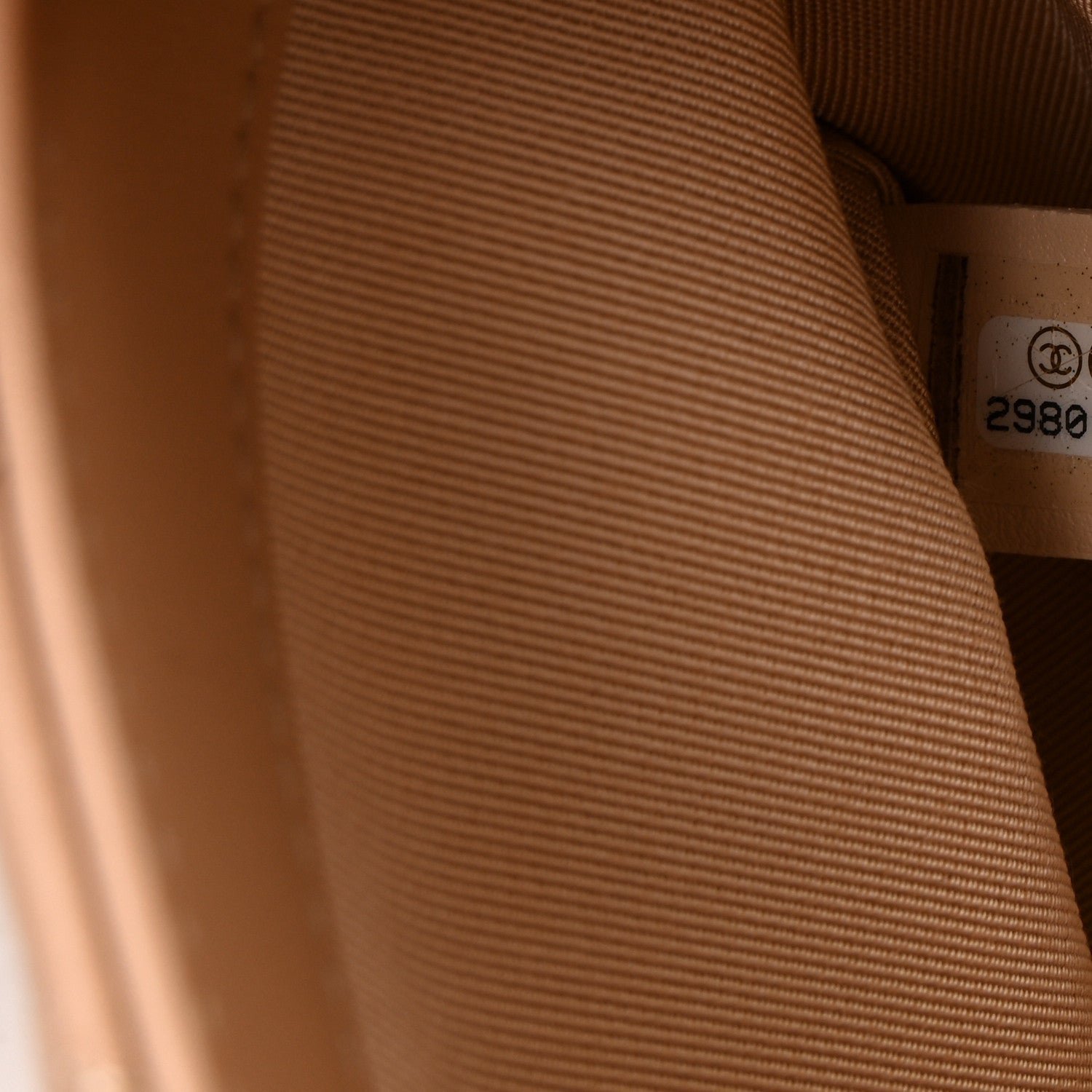 This specific model is crafted from beige quilted calfskin leather, featuring the House’s signature diamond quilting for a soft, structured feel. The defining design element is the “enchained” motif, characterized by multiple rows of decorative gold-tone (or ruthenium) metal chains draped across the front flap. This design was a centerpiece of the 2014 “Art School” themed runway, blending classic elegance with a rebellious, modern edge.