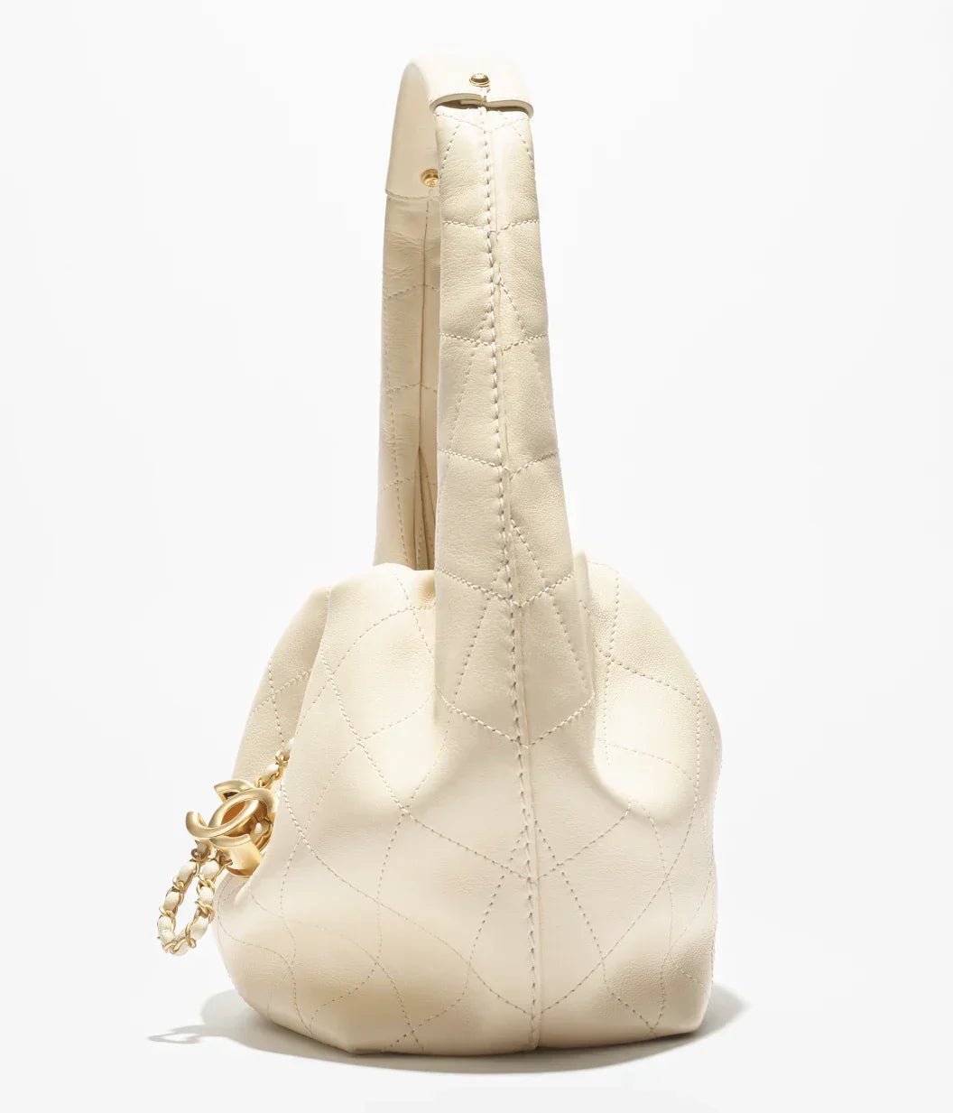 This specific model is crafted from buttery-soft white lambskin leather. It features a classic diamond quilting pattern that extends across the body of the bag. The signature design element is the gold-tone CC drawstring closure, which allows the top of the bag to gather slightly, creating its distinctive “hobo” shape.