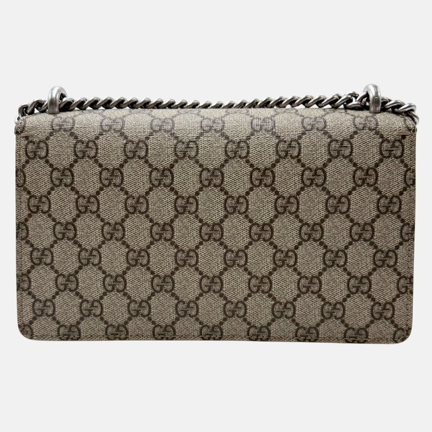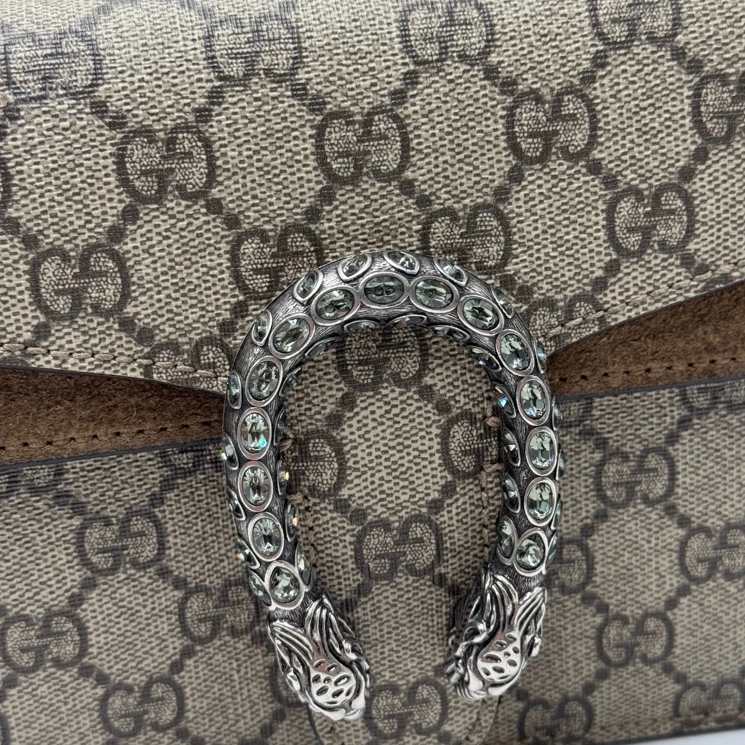 This Gucci Dionysus bag is crafted in the brand’s iconic beige and ebony GG Supreme coated canvas with brown suede trim. The structured silhouette is defined by its signature silver-toned tiger head spur closure, inspired by the Greek god Dionysus. Finished with a sliding chain strap that can be worn doubled on the shoulder or extended crossbody, the bag balances vintage Gucci monogram with modern detailing.