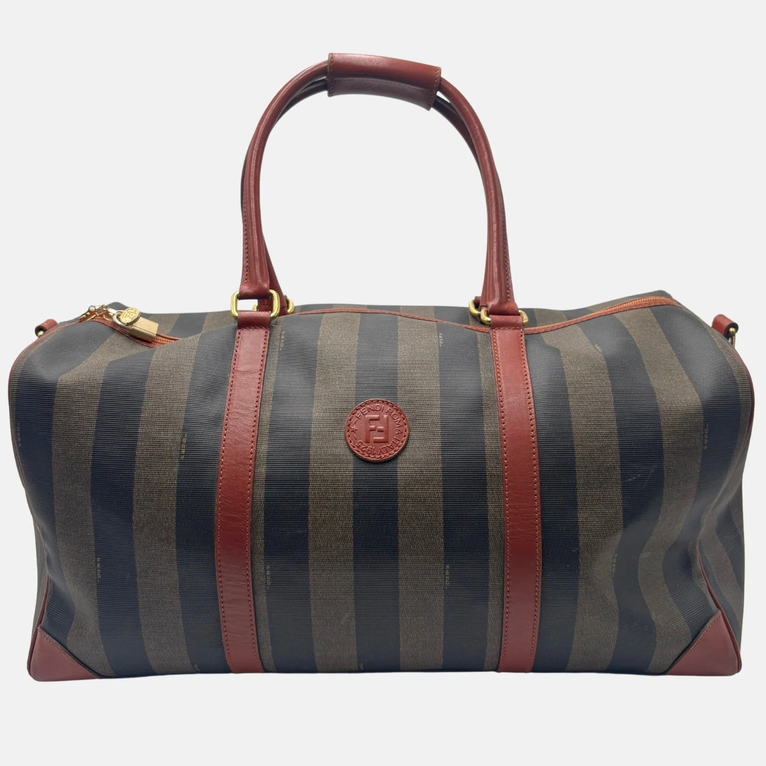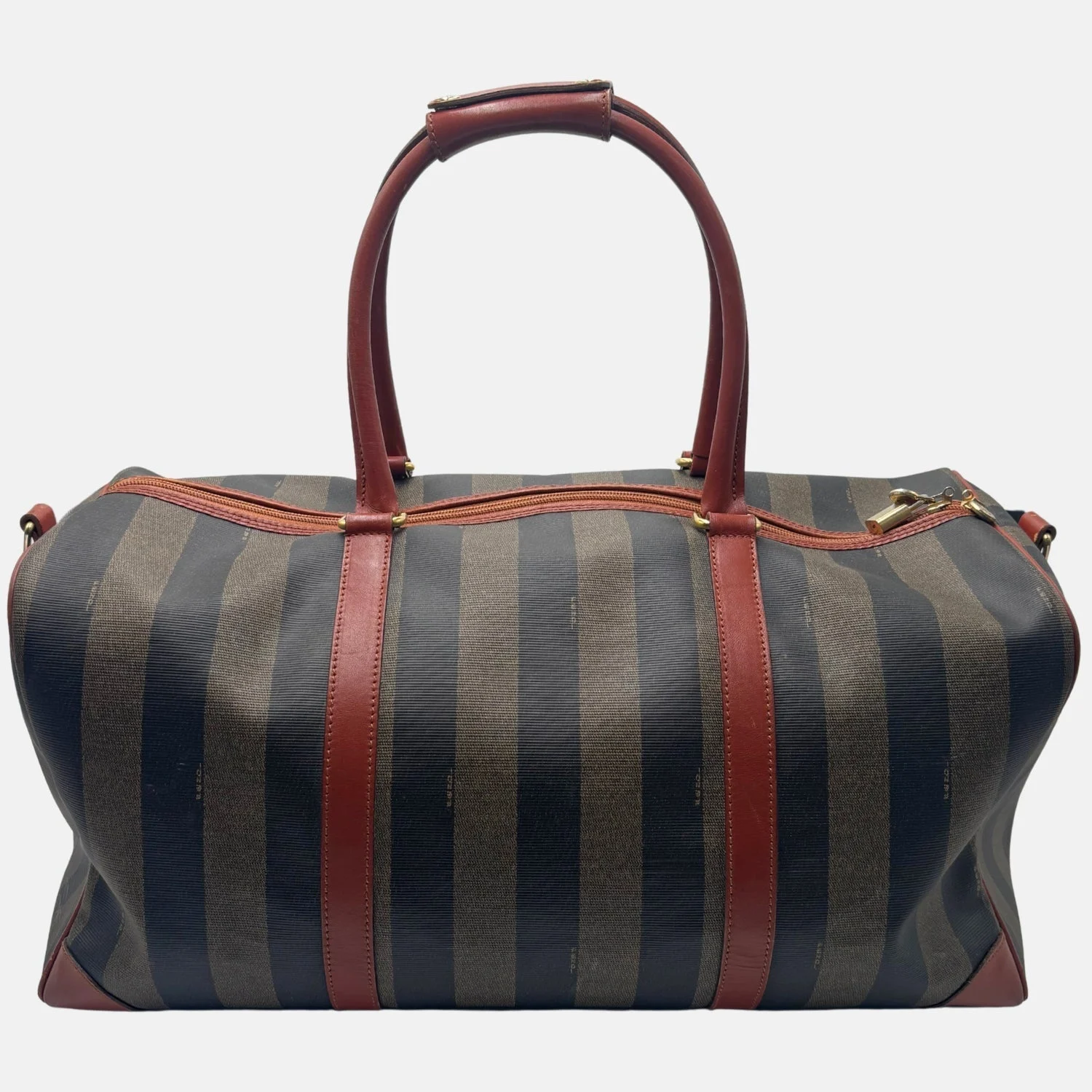 The Duffel Pequin Striped Coated Canvas by Fendi is a vintage travel essential that reflects the house’s iconic design codes. Crafted from durable coated canvas with the signature Pequin stripe pattern, it is accented with rich leather trim and gold-tone hardware. The structured silhouette features rolled leather handles and a top zip closure with an engraved Fendi pull. Spacious and practical, the lined interior provides ample room for clothing and essentials, making it the perfect choice for weekend trips or as a stylish carry-on.