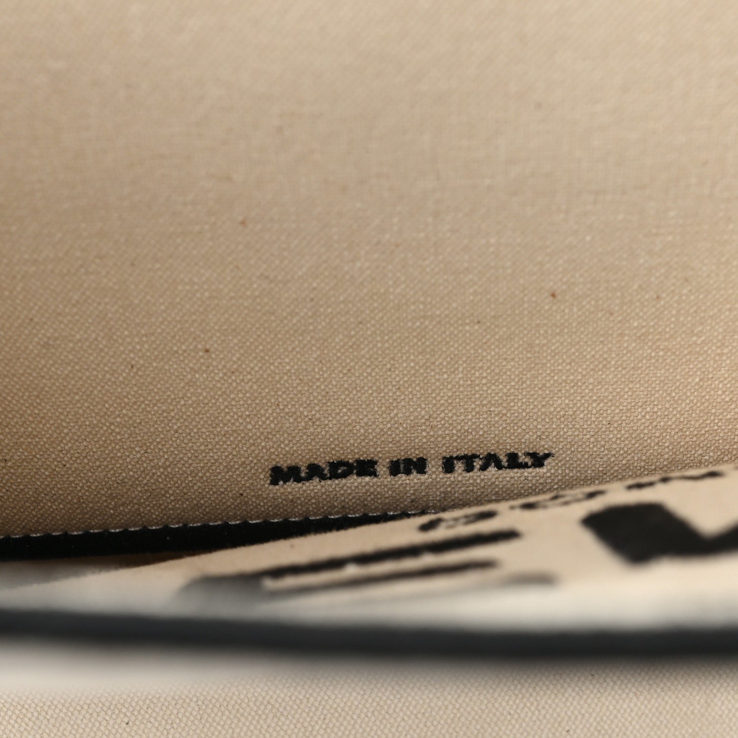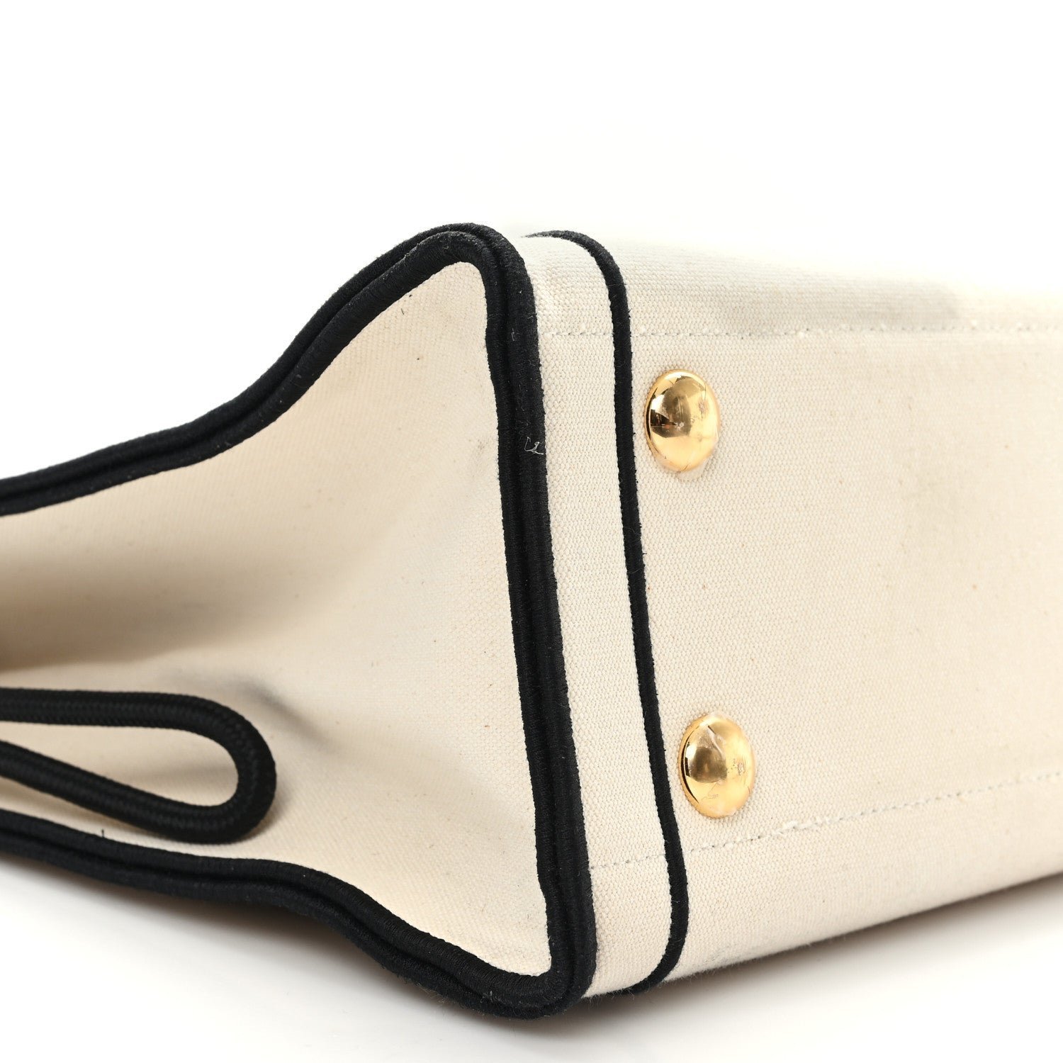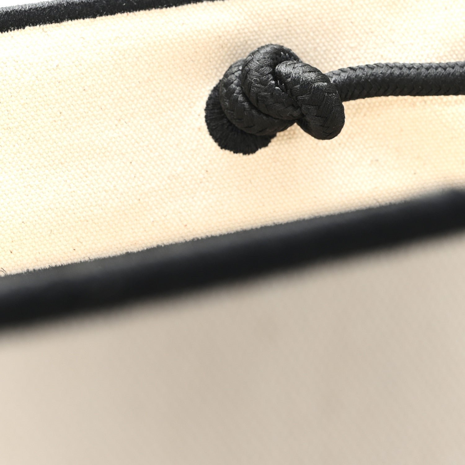 | Material | Natural cream fabric (canvas) with black nylon or leather trim. |