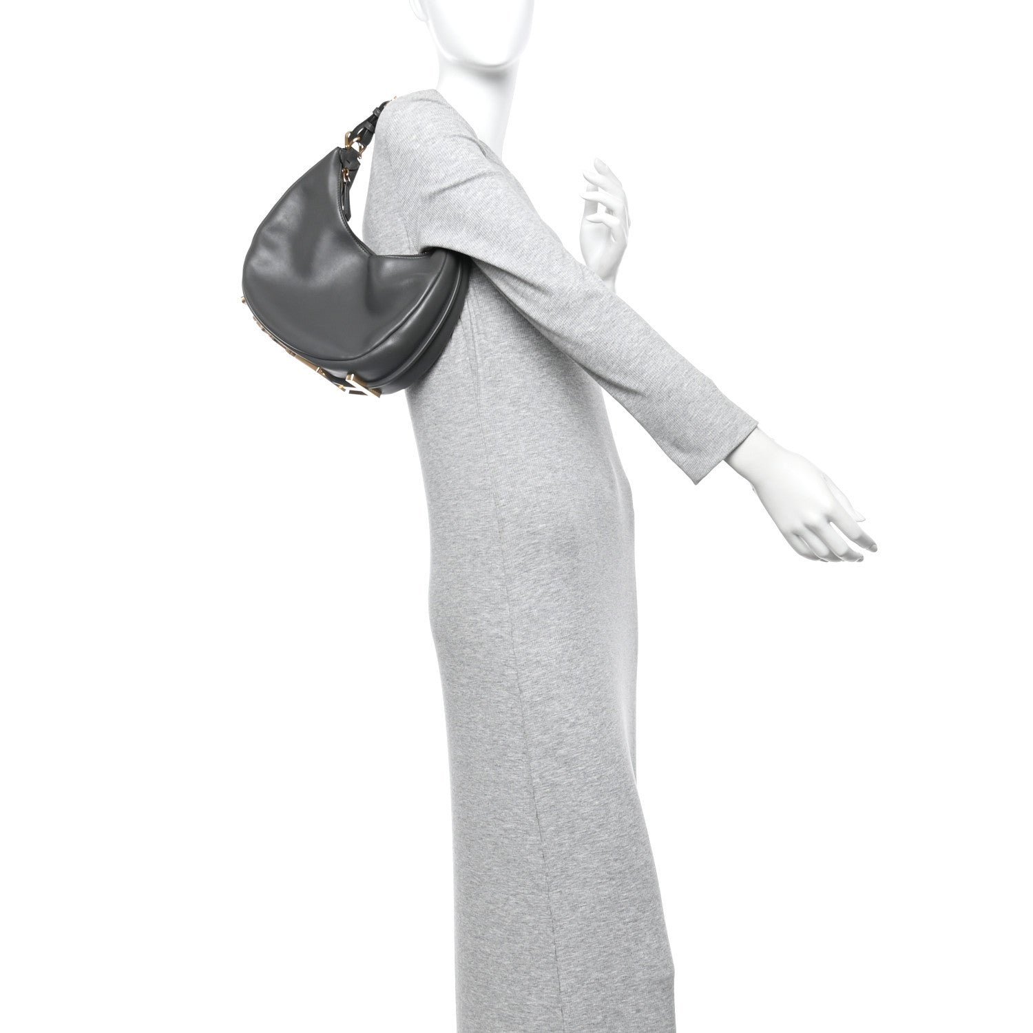 The Small Fendigraphy is a versatile hobo bag defined by its clean, crescent silhouette and structured design. This iteration is meticulously crafted from Anthracite calfskin leather, a deep grey shade that serves as a modern alternative to classic black.