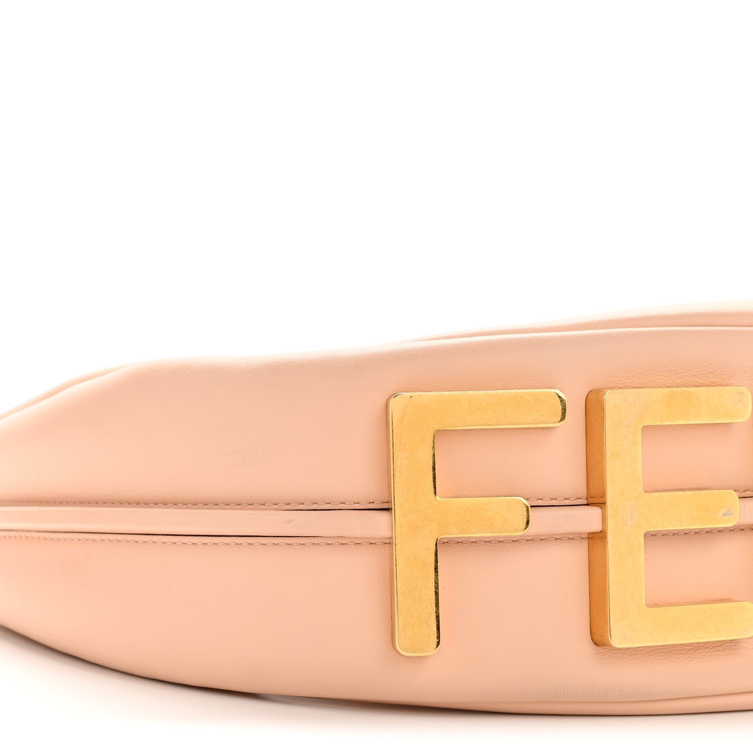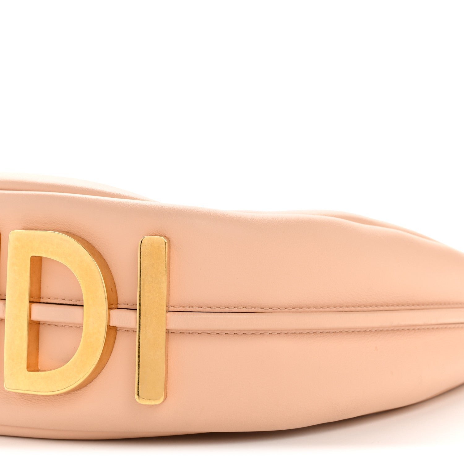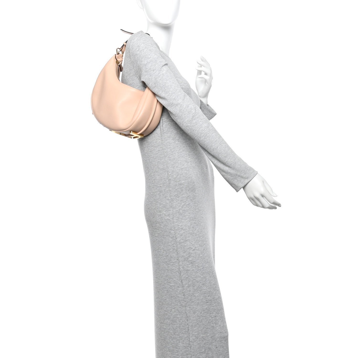 The Small Fendigraphy is a chic hobo bag characterized by its architectural shape and refined aesthetic. This iteration is crafted from Light Rose Vitello Grace leather, a soft, pastel pink that complements its minimalist design.