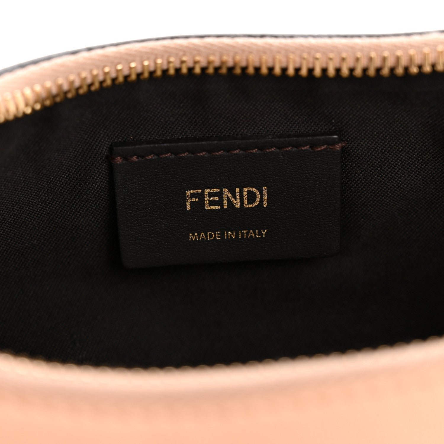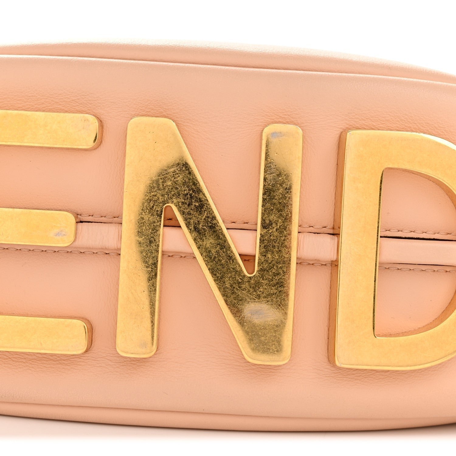 The bag’s most striking feature is the oversized vintage gold-finish metal FENDI lettering on the base, which is clearly visible when the bag is carried under the arm. It features a zip closure that opens to a spacious, fabric-lined internal compartment designed for daily essentials. For versatile carrying, the bag includes an adjustable, detachable handle and specialized hooks that allow for the attachment of a separate shoulder strap for crossbody wear.