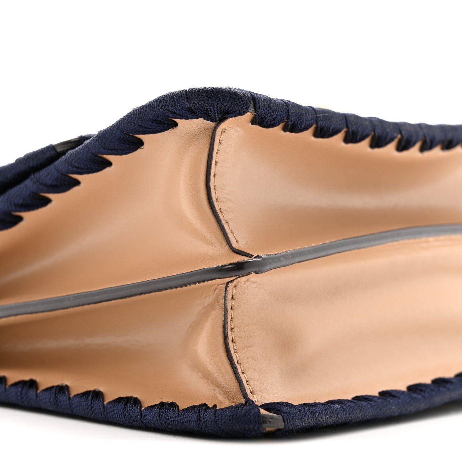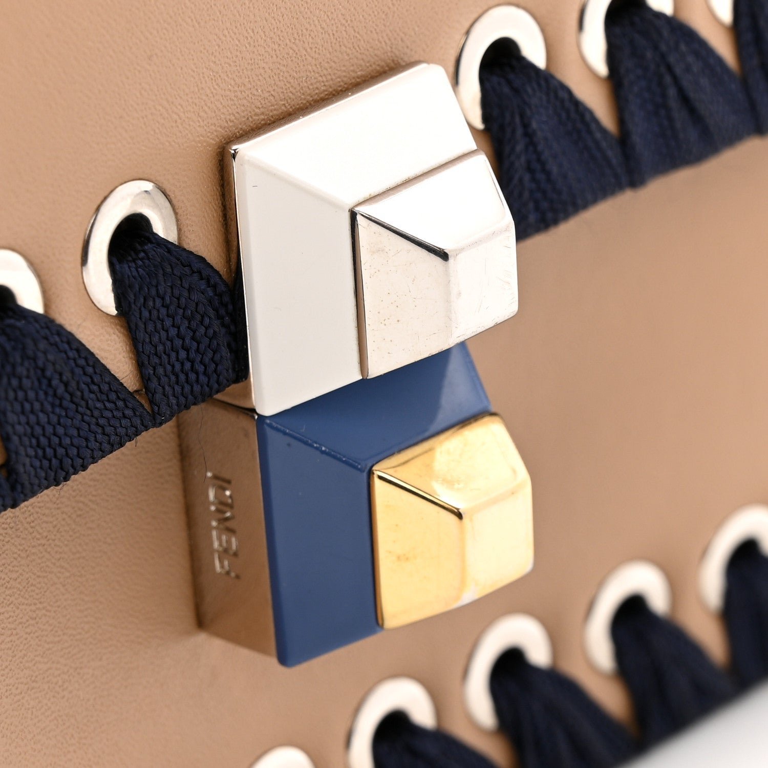 The bag is defined by its front flap, which features artisanal lace-up ribbon detailing in a deep Navy blue, threaded through polished metal eyelets. The design is further accented by signature multicolor plexiglass pyramid studs and a dual-stud push-lock closure. Designed for maximum versatility, it features a sliding chain shoulder strap with a leather shoulder guard, allowing it to be worn at two lengths: long for crossbody wear or doubled up for a short shoulder drop.