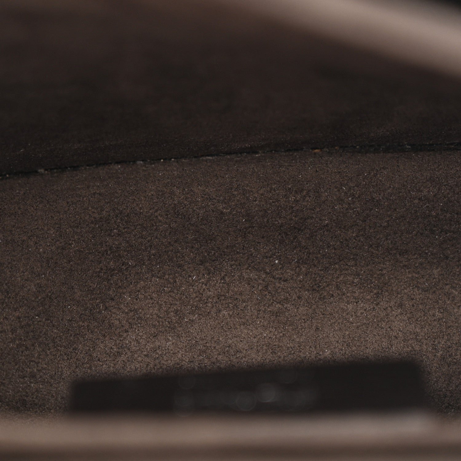 Handle/Strap: Sliding chain-link shoulder strap with a leather shoulder guard for comfort.