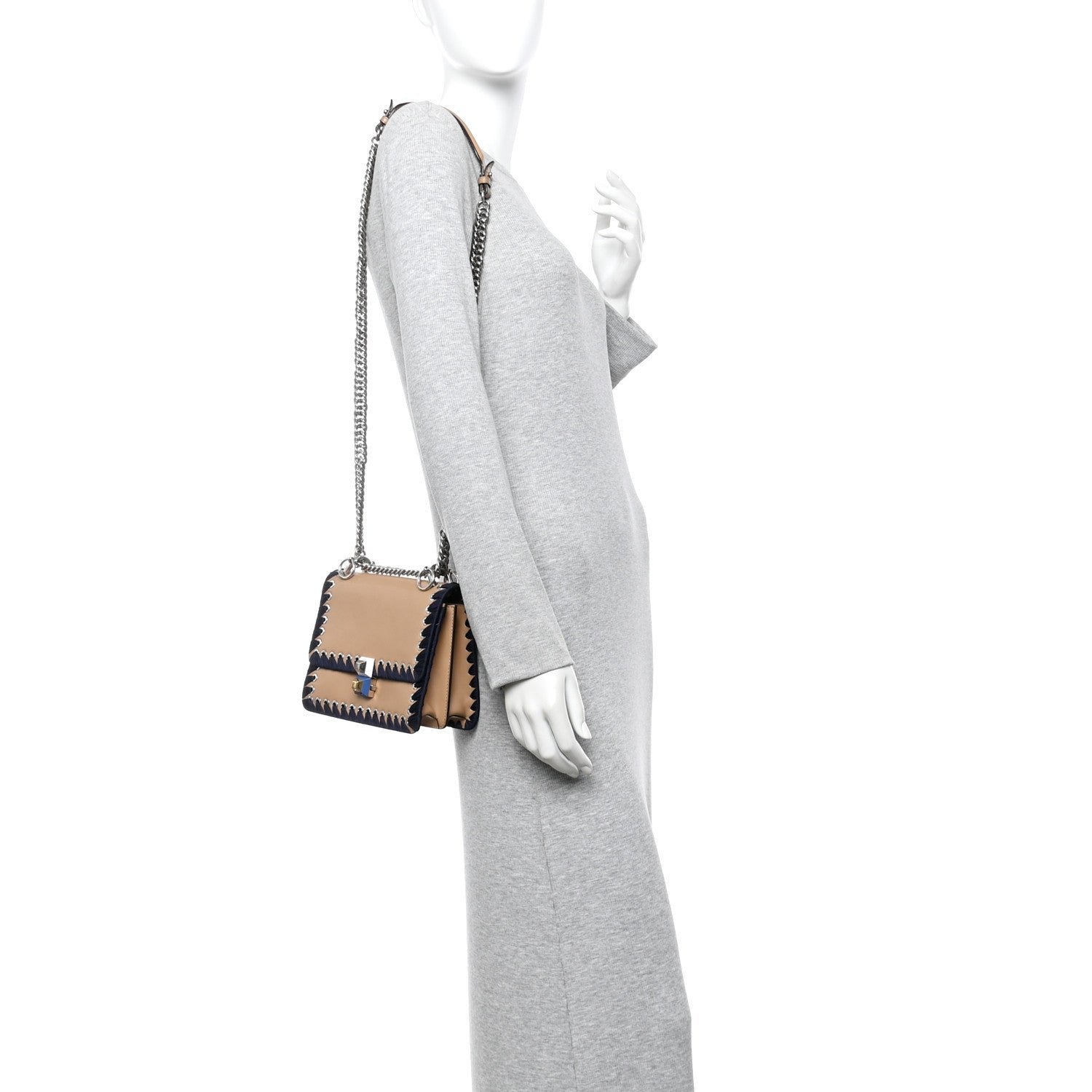 The Small Kan I is a structured and sophisticated shoulder bag that serves as a canvas for Fendi’s boldest creative expressions. This exceptional iteration is crafted from Vitello Liberty Lucido a premium, high-shine (glossy) calfskin leather in the classic Cuoio tan hue.