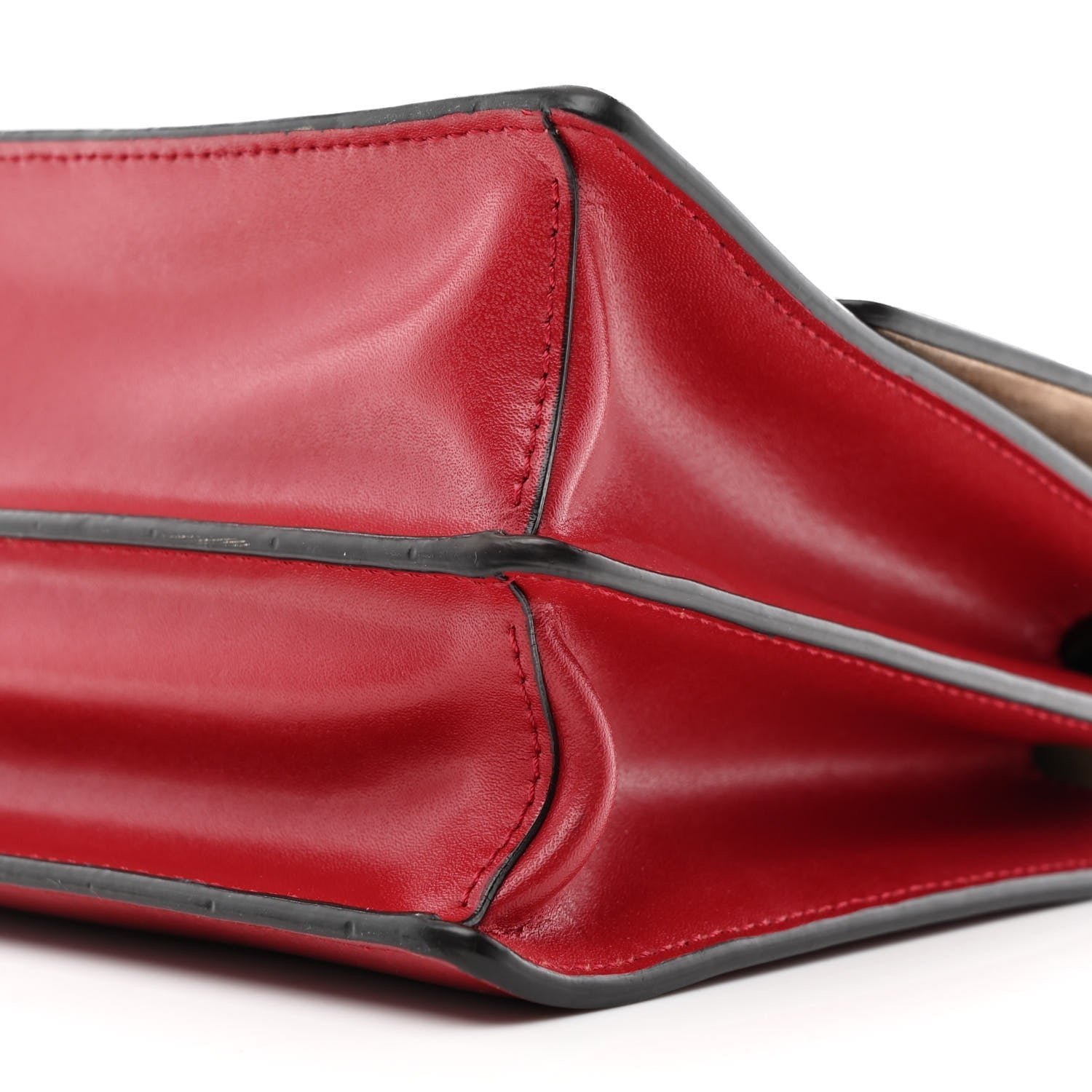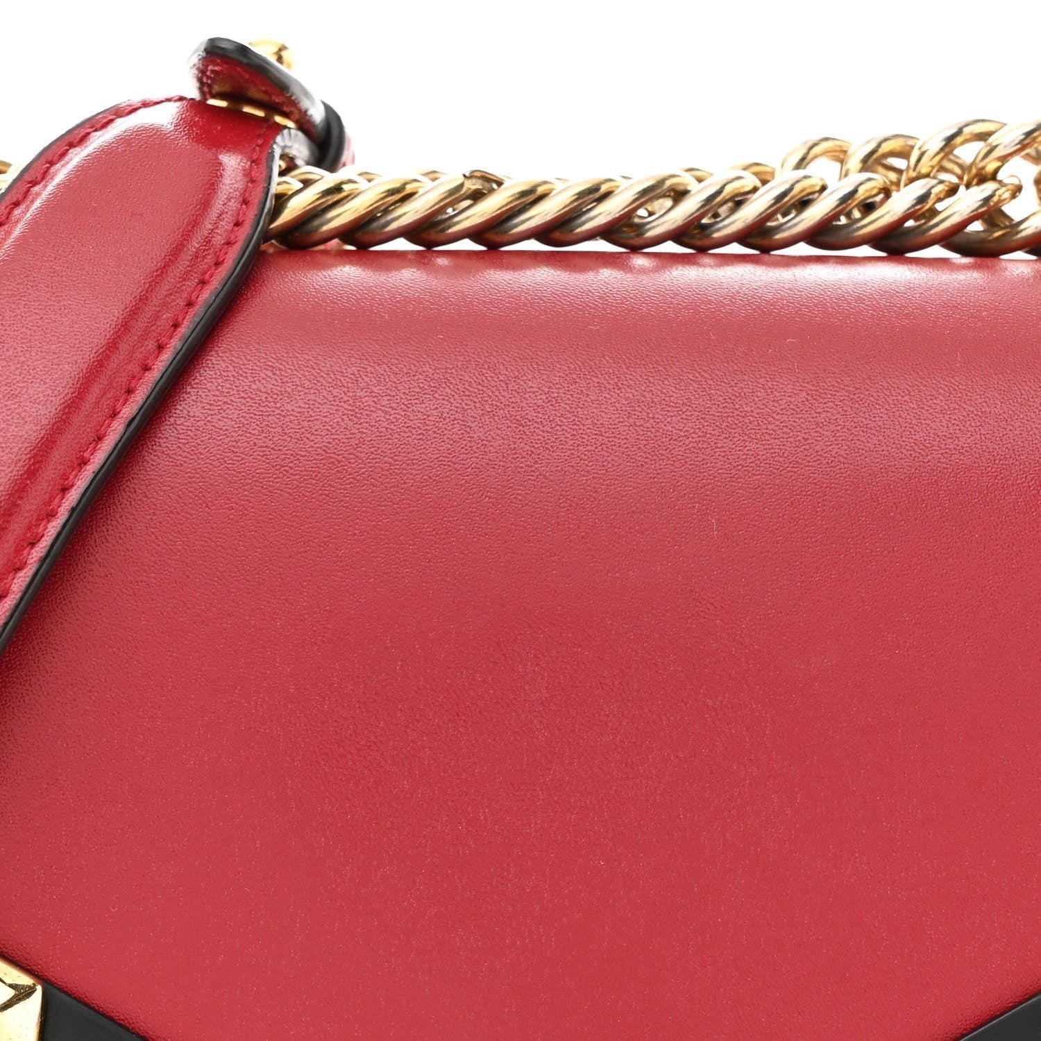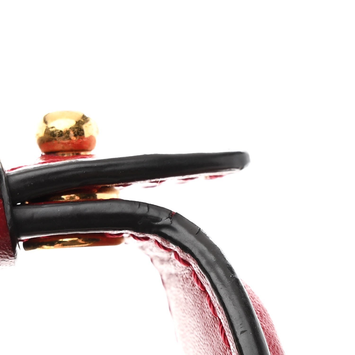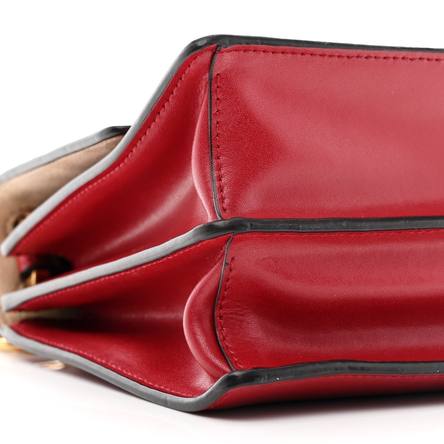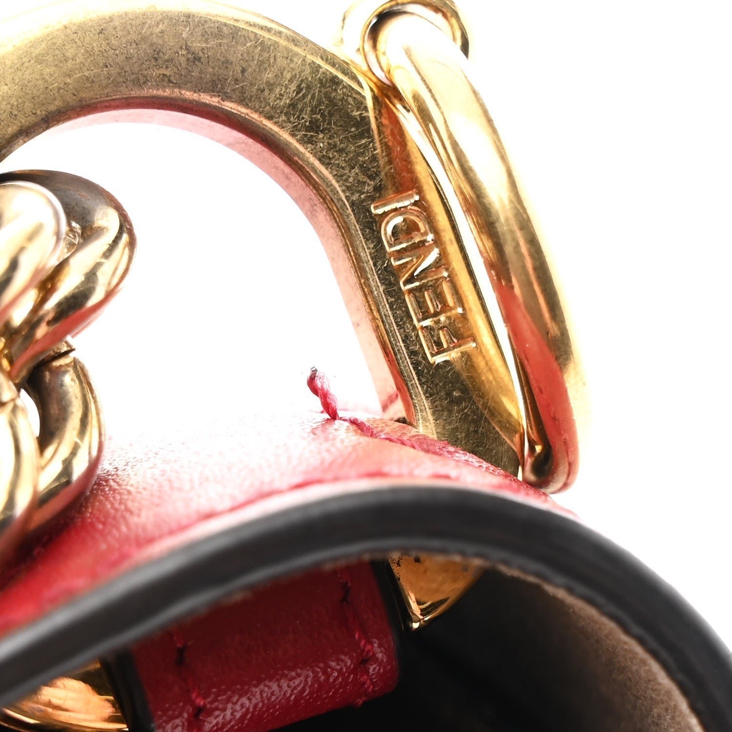 The Small Kan I is a structured masterpiece that serves as a canvas for Fendi’s boldest creative expressions. This “Monster Eyes” iteration is crafted from premium Vitello Liberty (calfskin) leather in a vibrant Fragola red, providing a striking backdrop for the bag’s iconic “Faces” detailing.