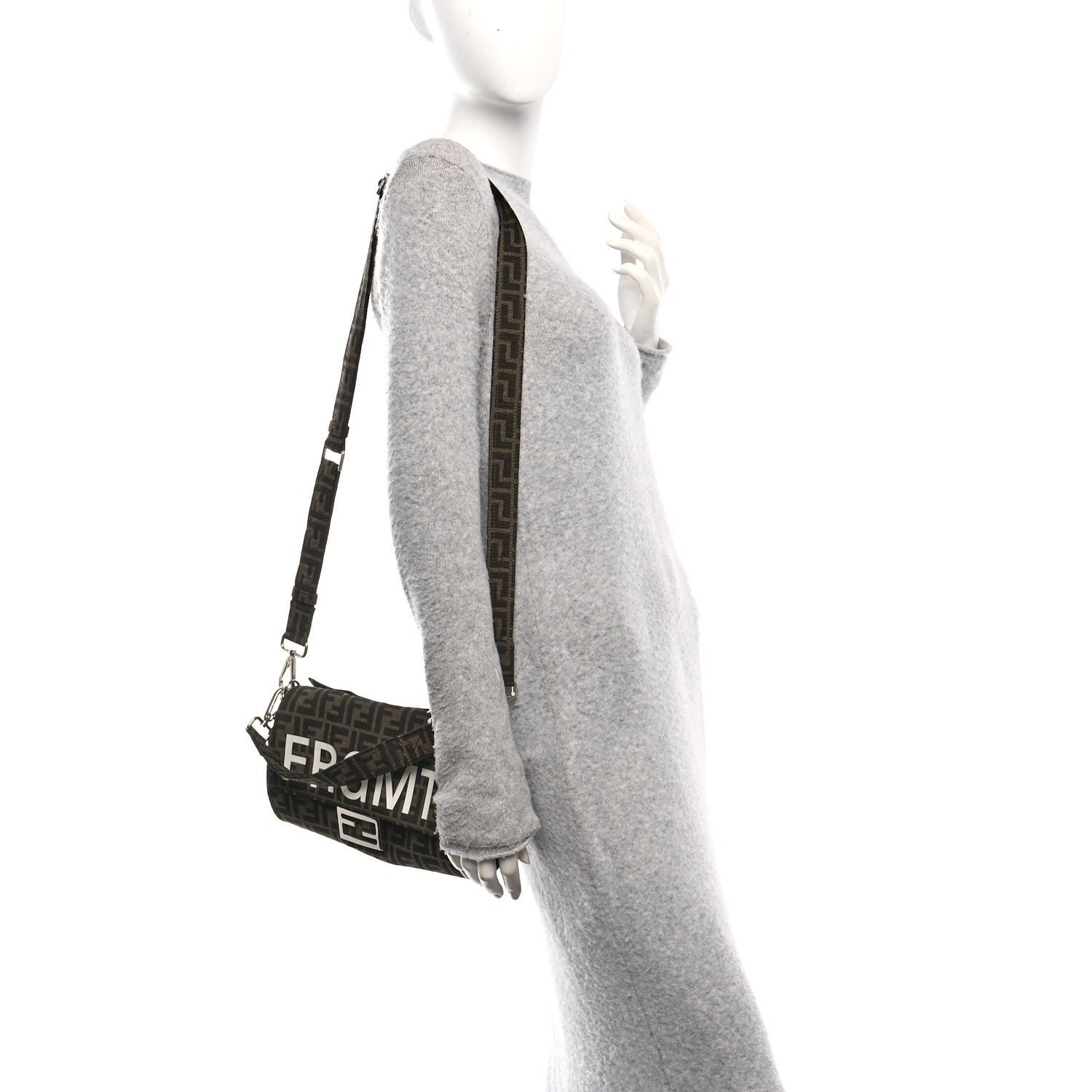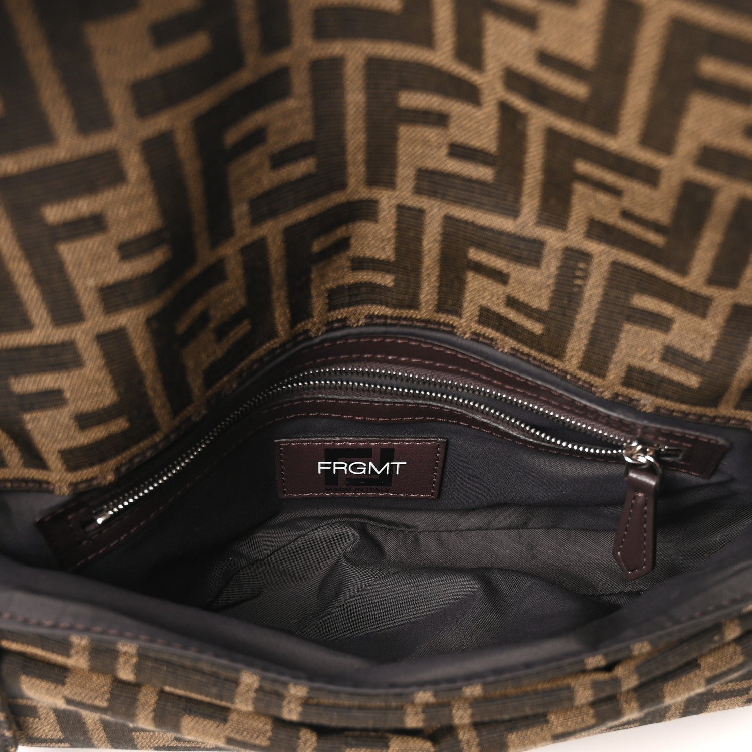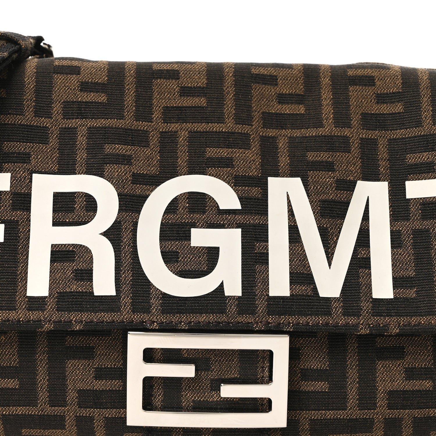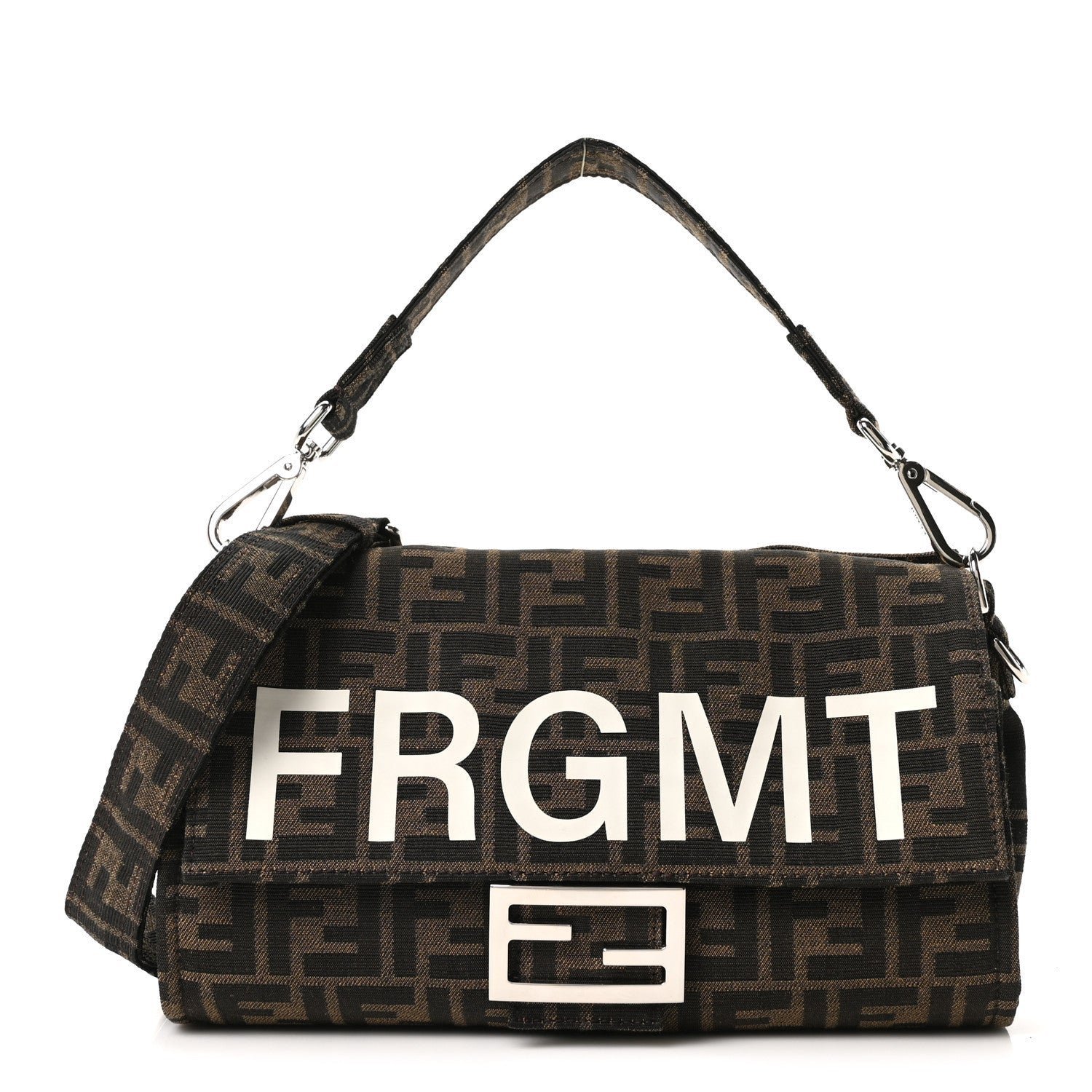Crafted from the signature FF jacquard fabric in Tobacco and Moro (dark brown), the bag is distinguished by a bold “FRAGMENT” logo overlay embroidered across the front flap. The bag is finished with polished silver-finish metalware and features a versatile carrying system, including a detachable top handle and a leather shoulder strap.