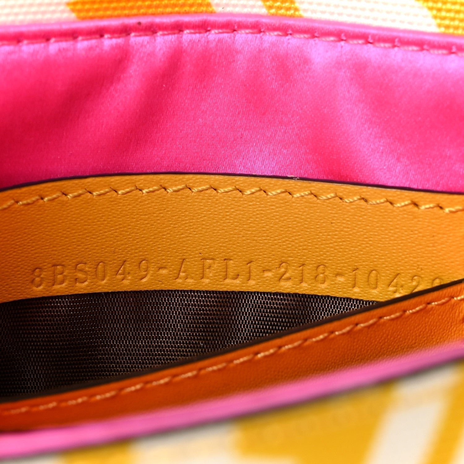 Crafted from glazed canvas (coated canvas) with a high-shine finish, the bag showcases a striking Mimosa yellow and white palette. The slim, vintage-inspired silhouette is complemented by an adjustable leather top handle and the signature gold-finish FF magnetic clasp. The interior is finished with a luxury fabric lining and a practical zippered pocket.