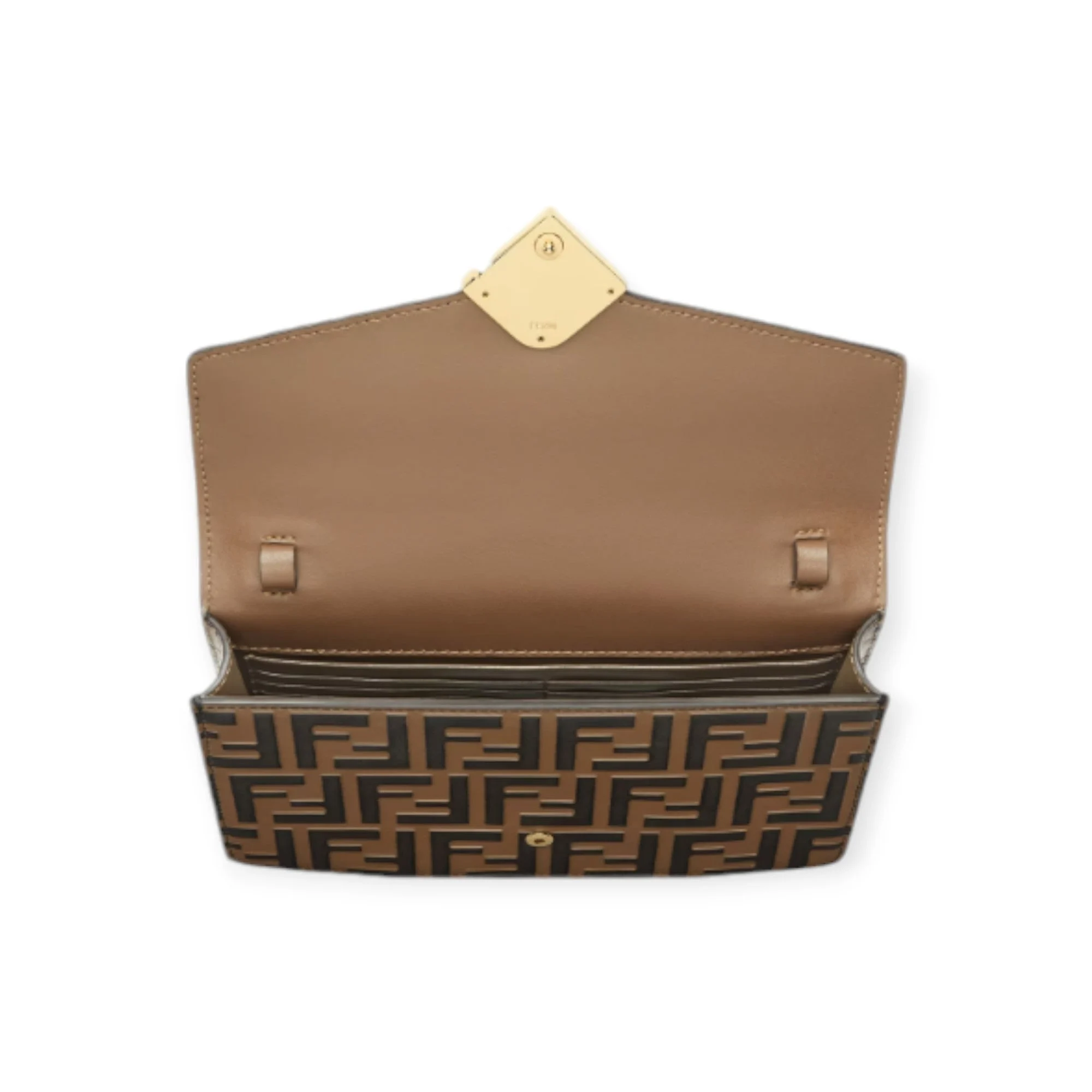 FF Diamonds compact wallet with geometric flap and diagonal FF logo. Interior with single compartment, flat pocket and six slot card holder. Adjustable leather and chain shoulder straps, both removable. Made of brown leather with embossed black FF print. Gold-finish metalware.