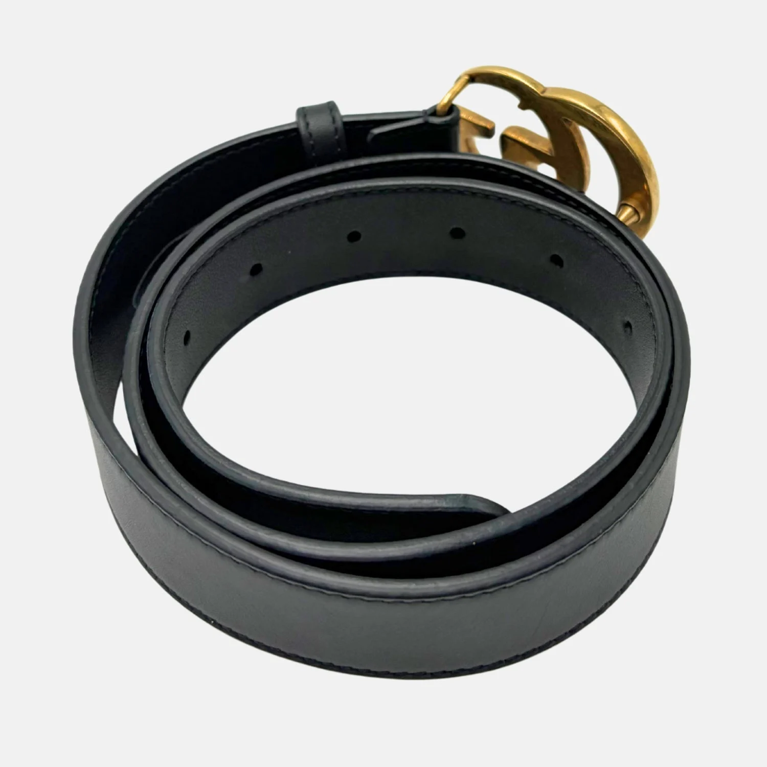 This Gucci GG Marmont belt is crafted from smooth black leather and finished with the iconic antiqued gold-tone Double G buckle. A timeless accessory that adds a polished designer touch to both casual and elevated looks.