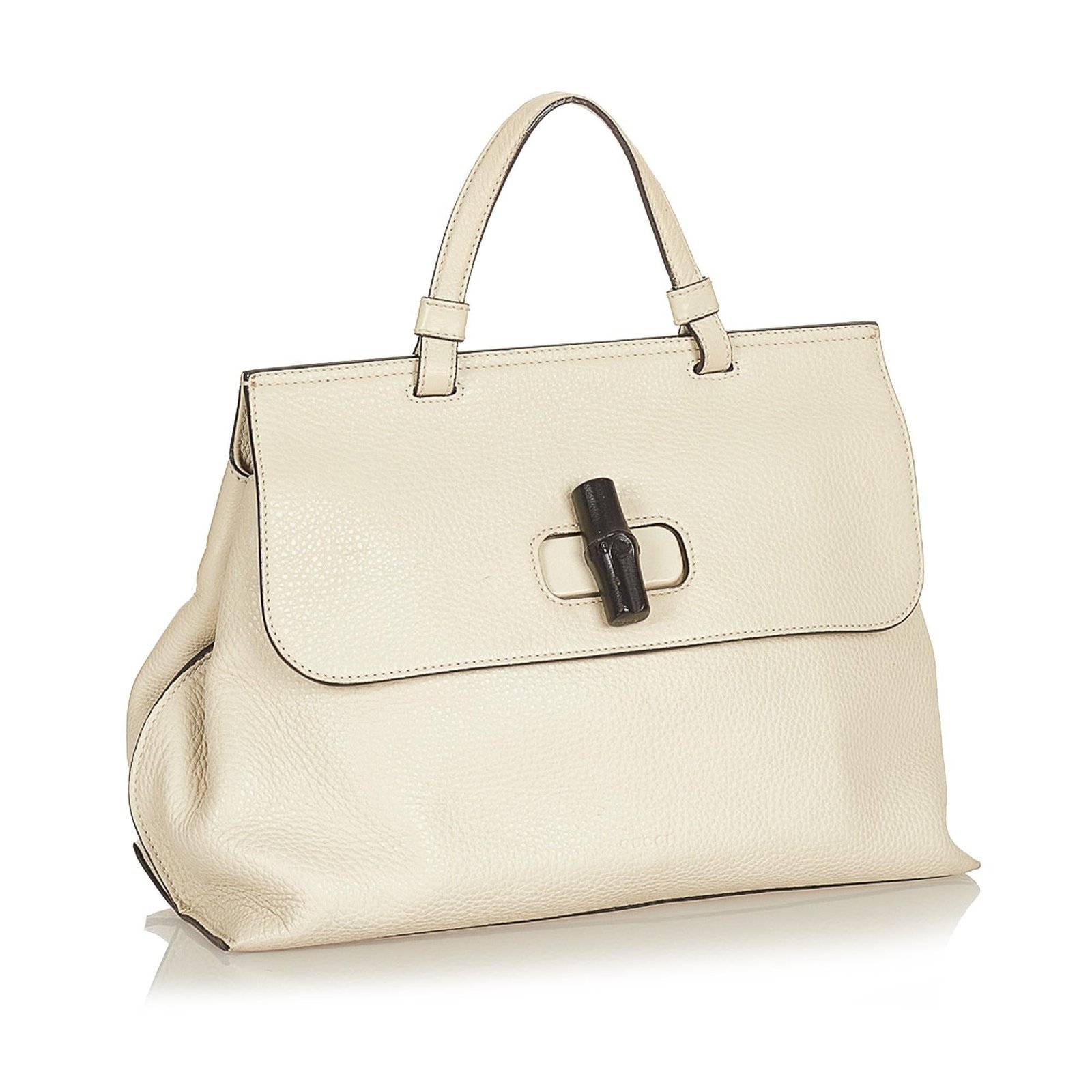 The Gucci Bamboo Daily Leather Satchel is a refined everyday bag crafted in sleek white leather, designed to balance elegance with practicality. Featuring Gucci’s iconic bamboo detailing, this satchel offers a structured silhouette that transitions effortlessly from day to evening.