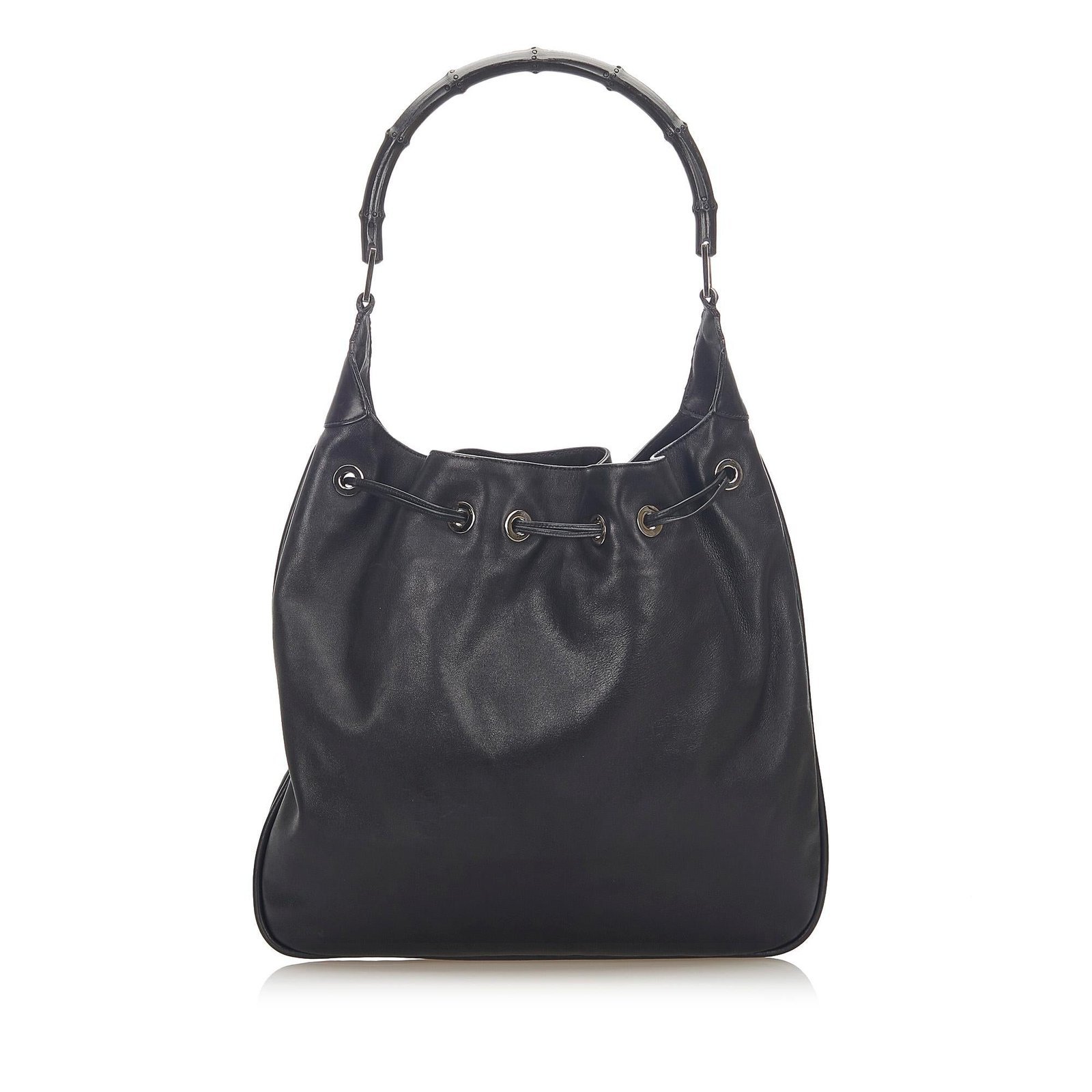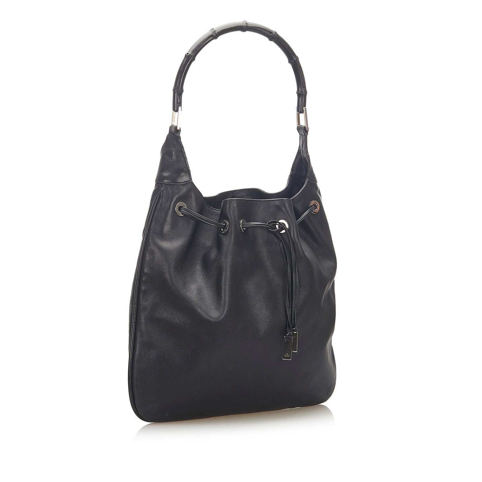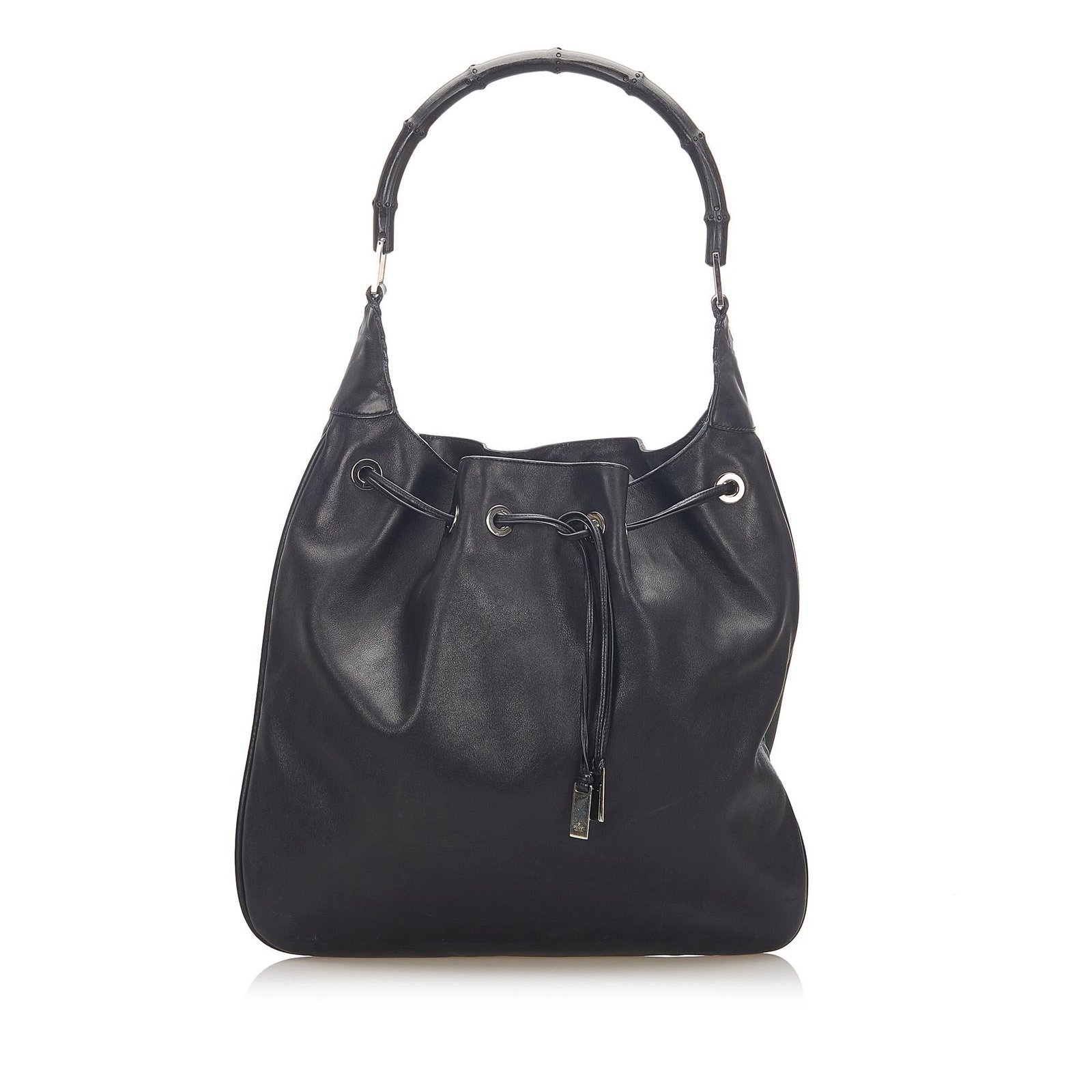 The Gucci Bamboo Drawstring Leather Shoulder Bag is a sophisticated and versatile accessory that reflects Gucci’s iconic craftsmanship. Crafted from smooth black leather and pony-style calfskin, this shoulder bag features signature bamboo detailing, adding a timeless and distinctive touch.