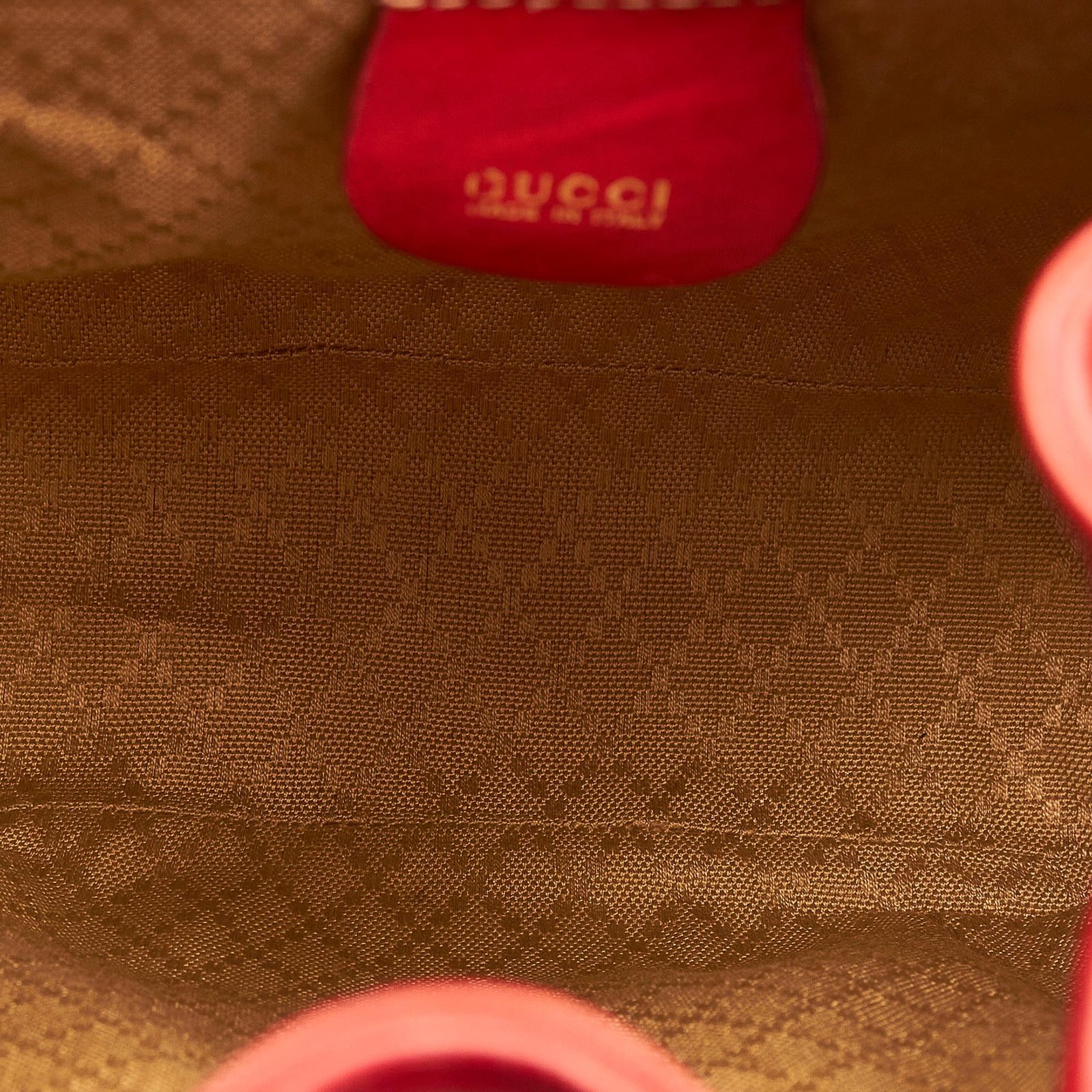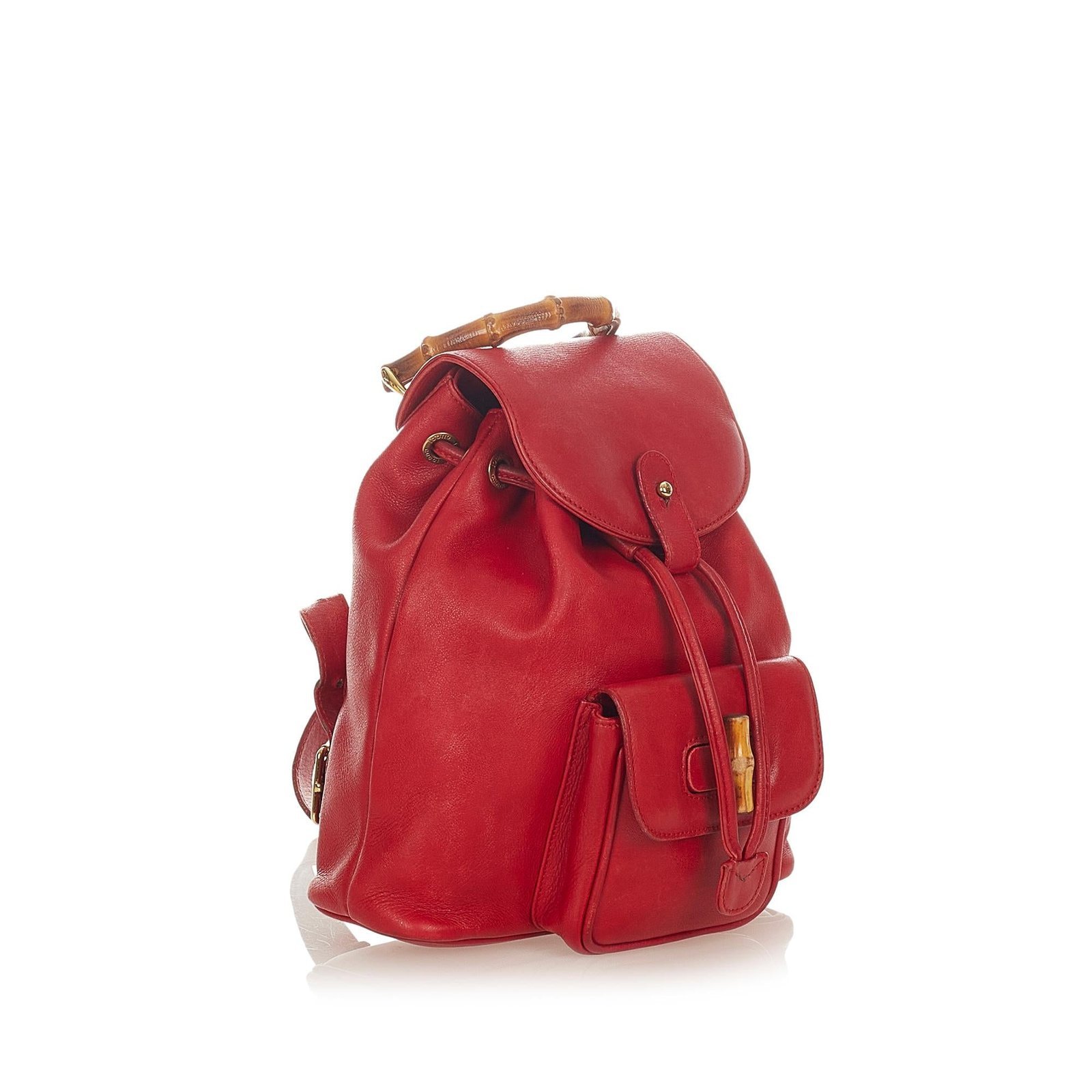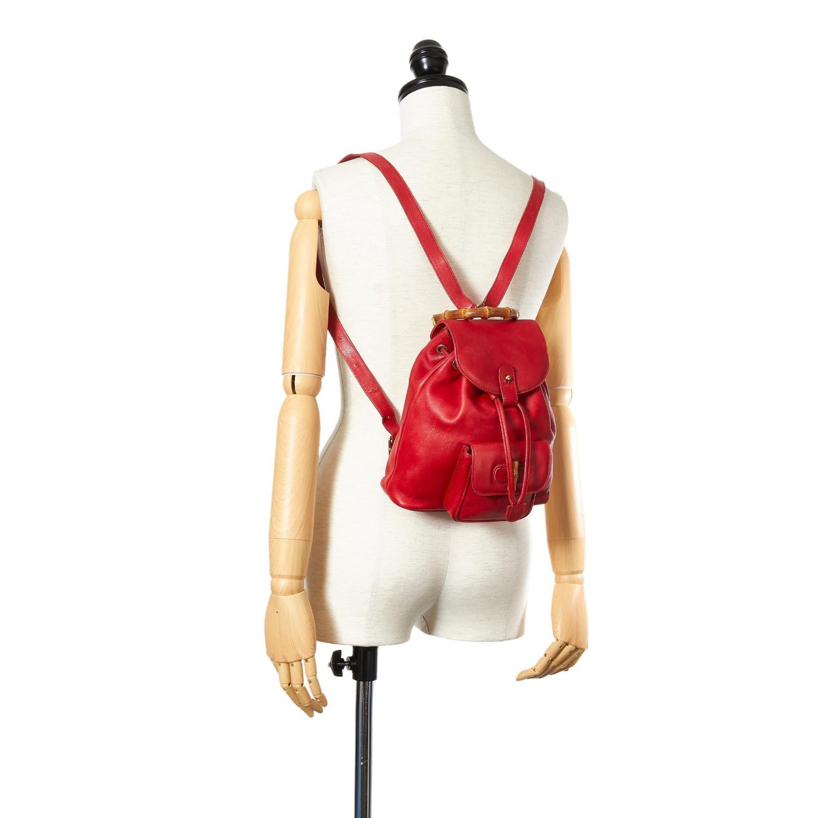 The Gucci Bamboo Leather Drawstring Backpack is a stylish and versatile accessory that blends iconic Gucci design with functional elegance. Crafted from red leather and pony-style calfskin, it features signature bamboo accents, including a bamboo twist lock closure and a bamboo top handle, adding a distinctive and refined touch.