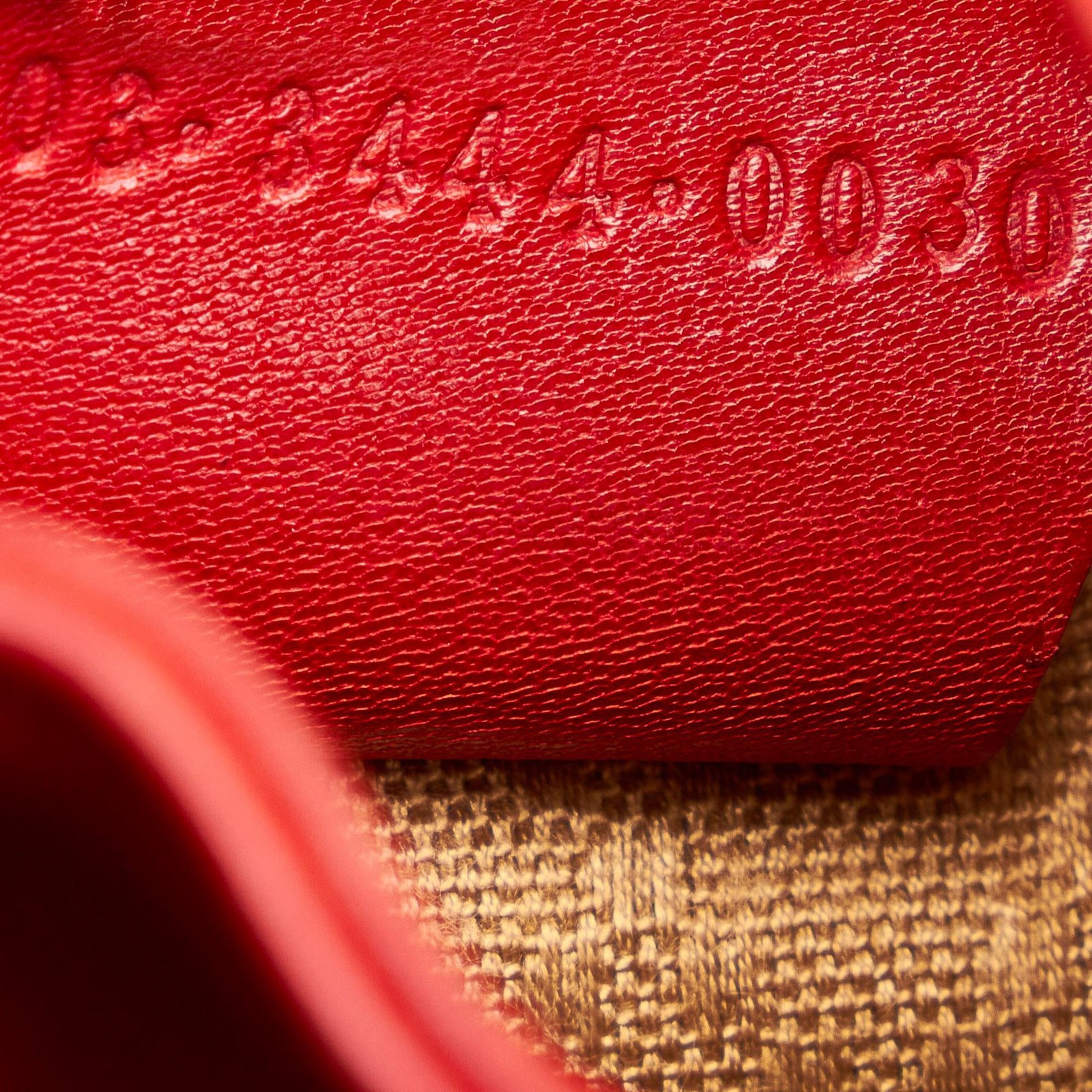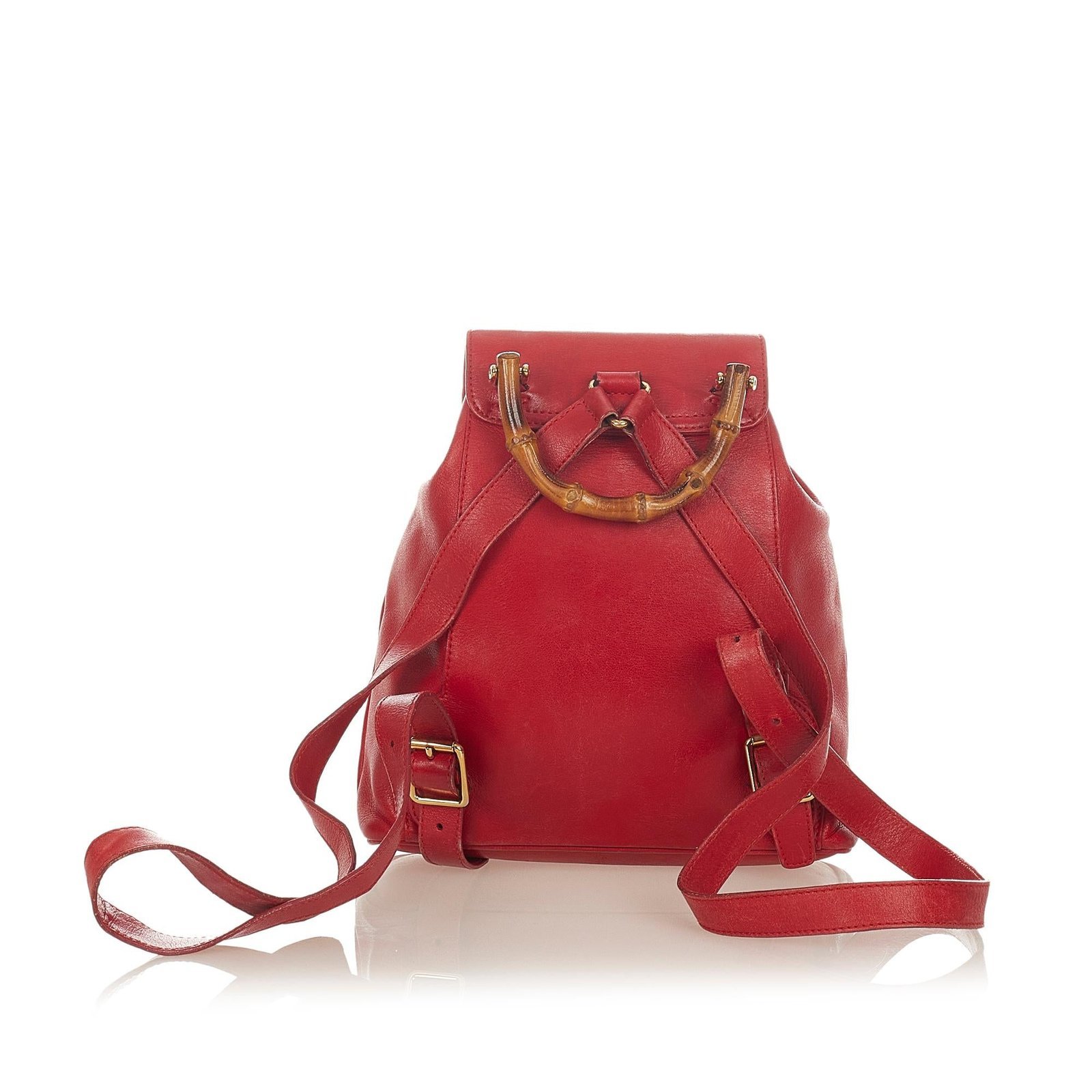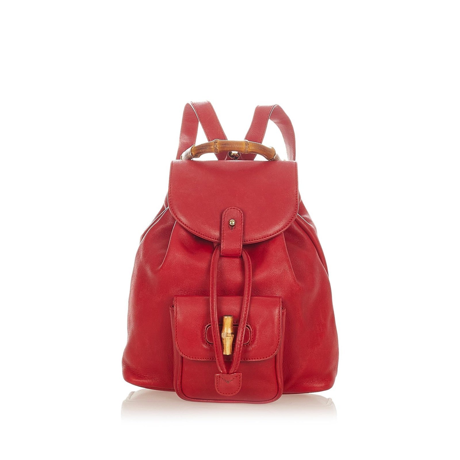 The Gucci Bamboo Leather Drawstring Backpack is a stylish and versatile accessory that blends iconic Gucci design with functional elegance. Crafted from red leather and pony-style calfskin, it features signature bamboo accents, including a bamboo twist lock closure and a bamboo top handle, adding a distinctive and refined touch.