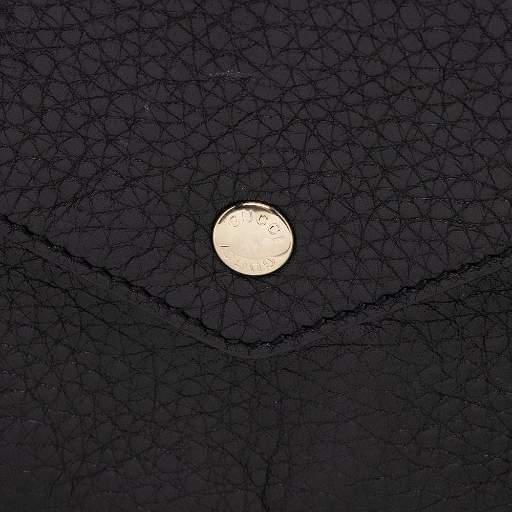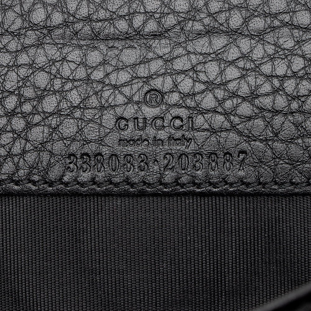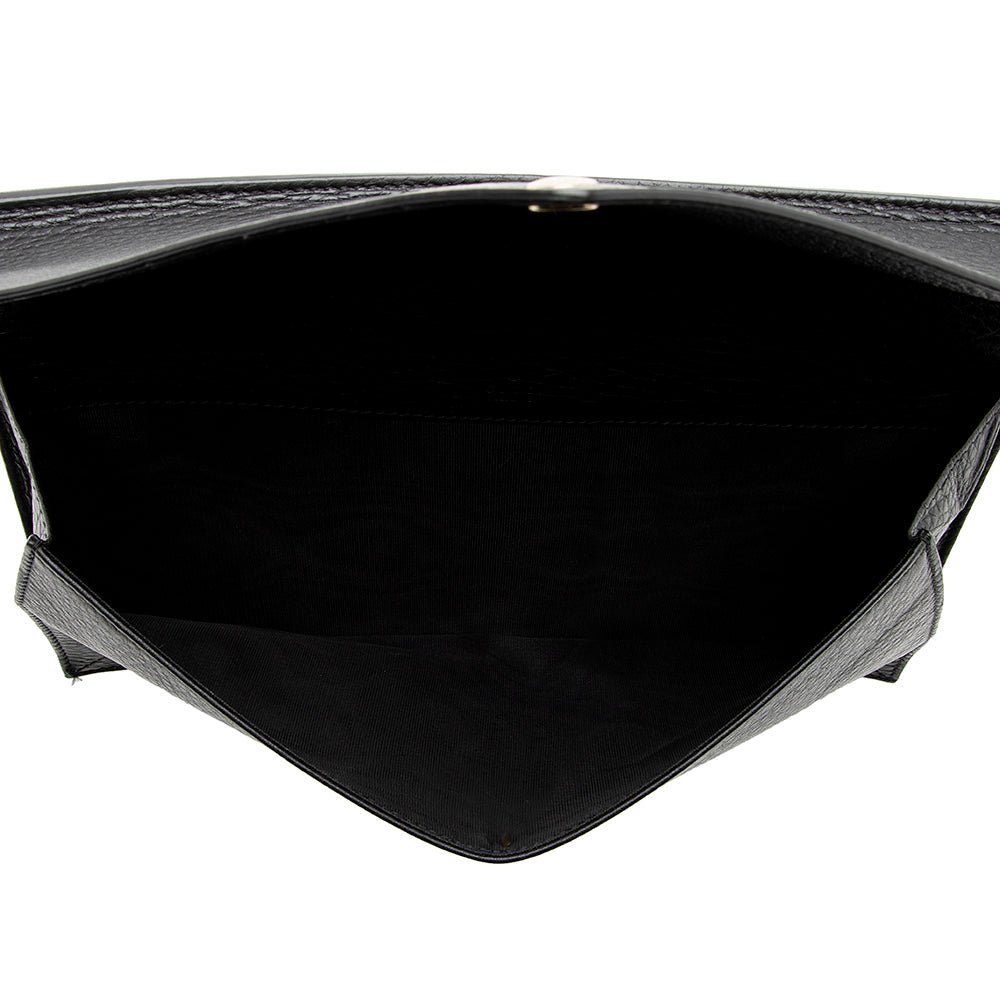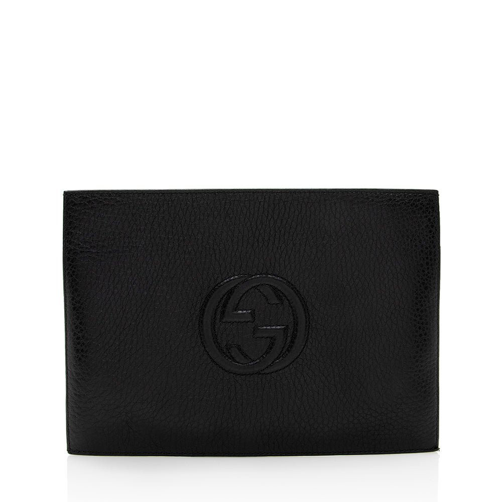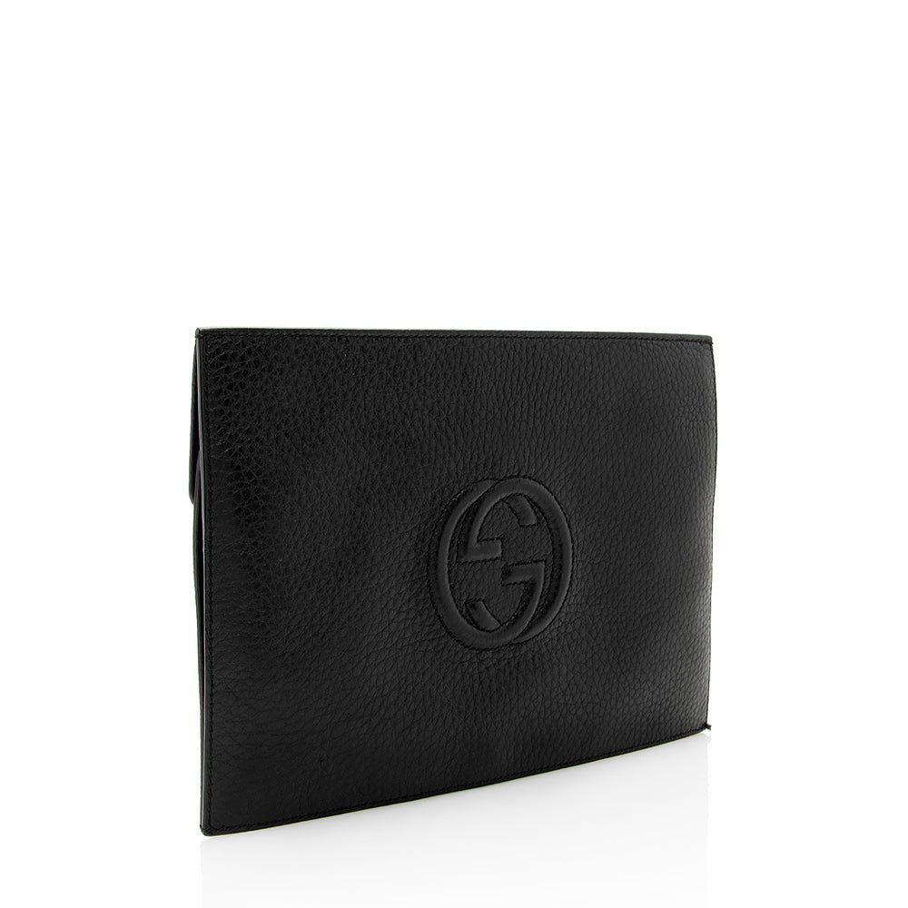The Gucci Calfskin Soho Clutch Bag is a sleek and sophisticated accessory perfect for both day and evening occasions. Crafted from black grained leather, it features the iconic stitched GG logo on the front, showcasing timeless Gucci elegance.