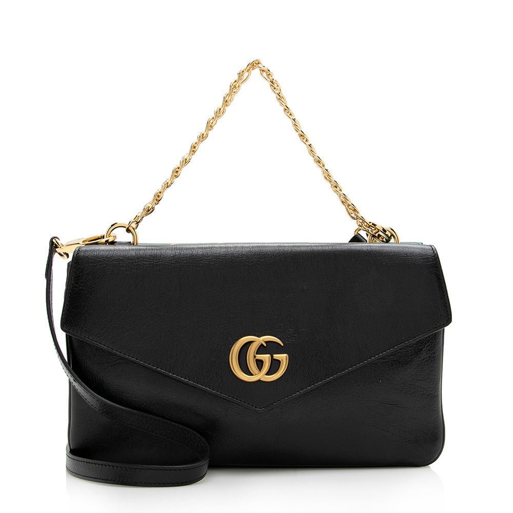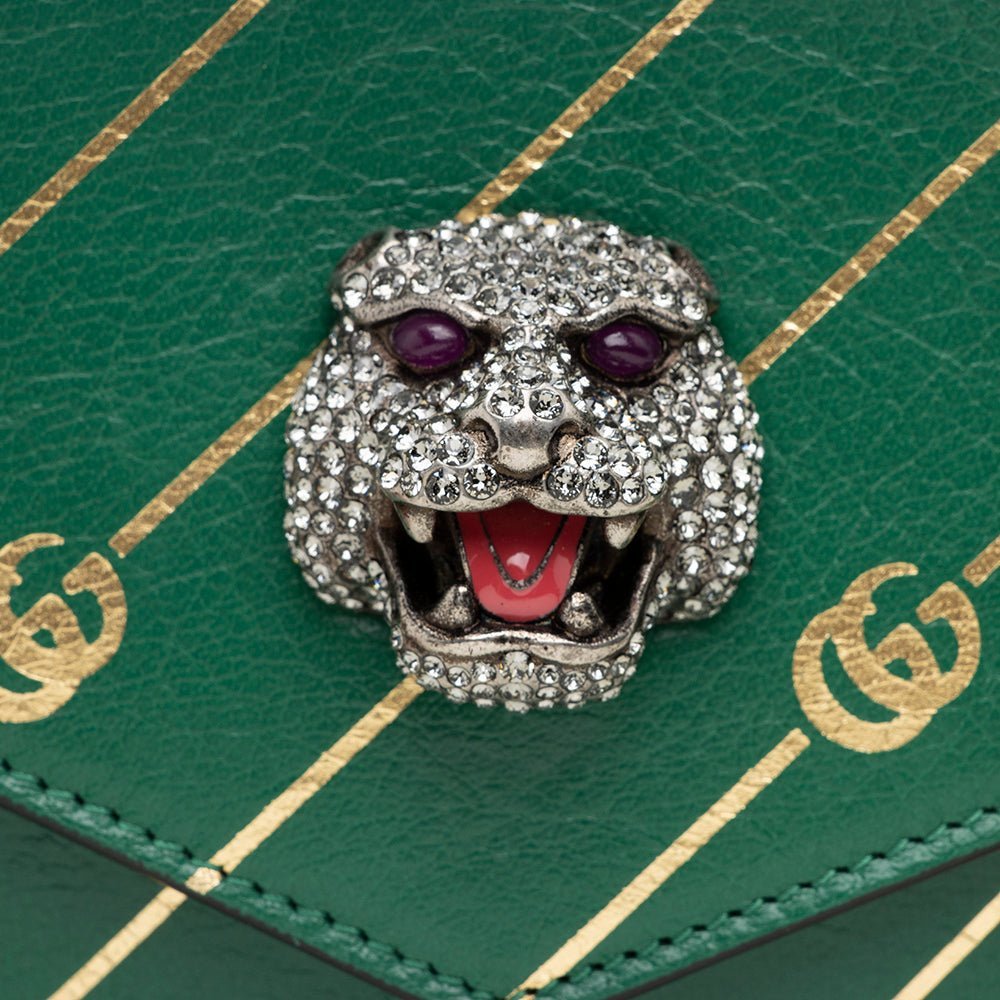 The Gucci Calfskin Thiara Double Shoulder Bag is a statement piece that effortlessly blends bold artistry with classic sophistication. One side showcases the iconic double G emblem set against a green leather background, while the other side dazzles with a multicolored crystal feline atop a double G striped pattern. Perfect for day-to-night wear, this bag brings style and personality to any outfit.