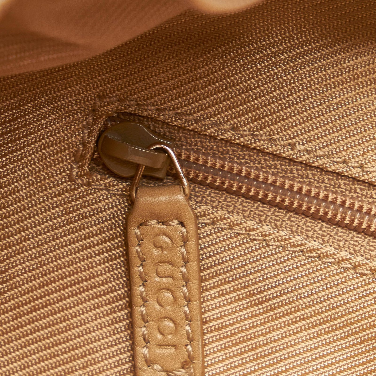 - Brown and beige canvas exterior with leather trim
