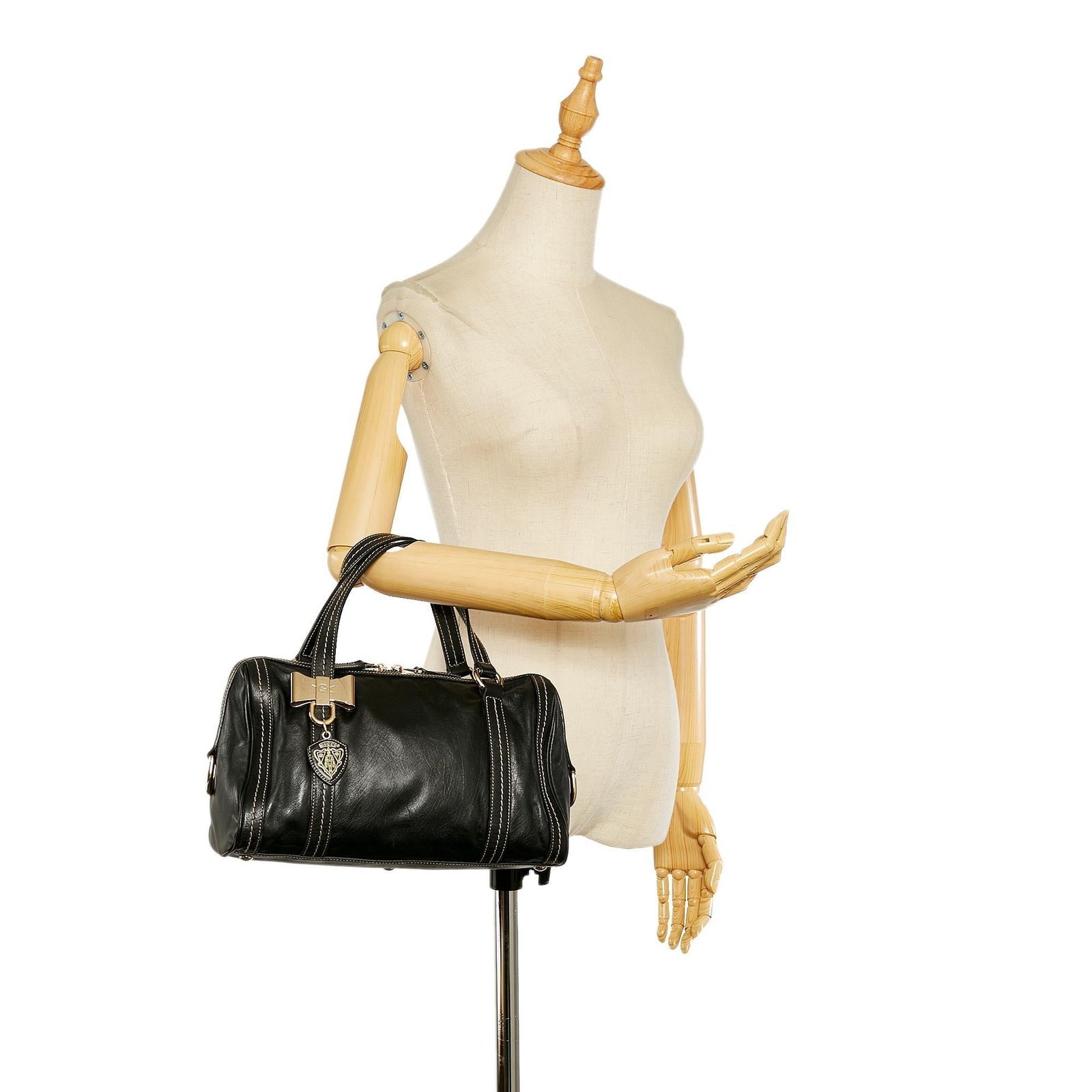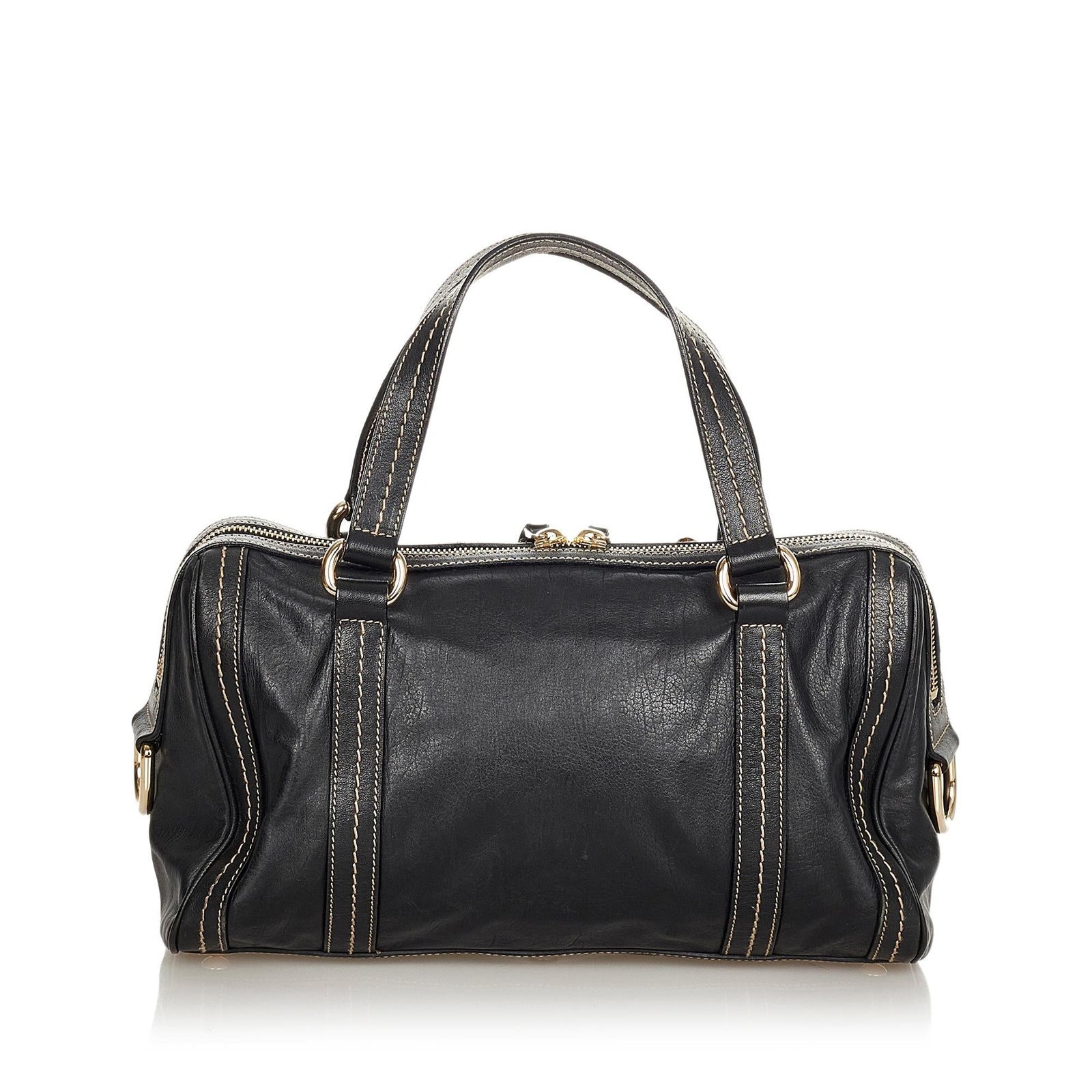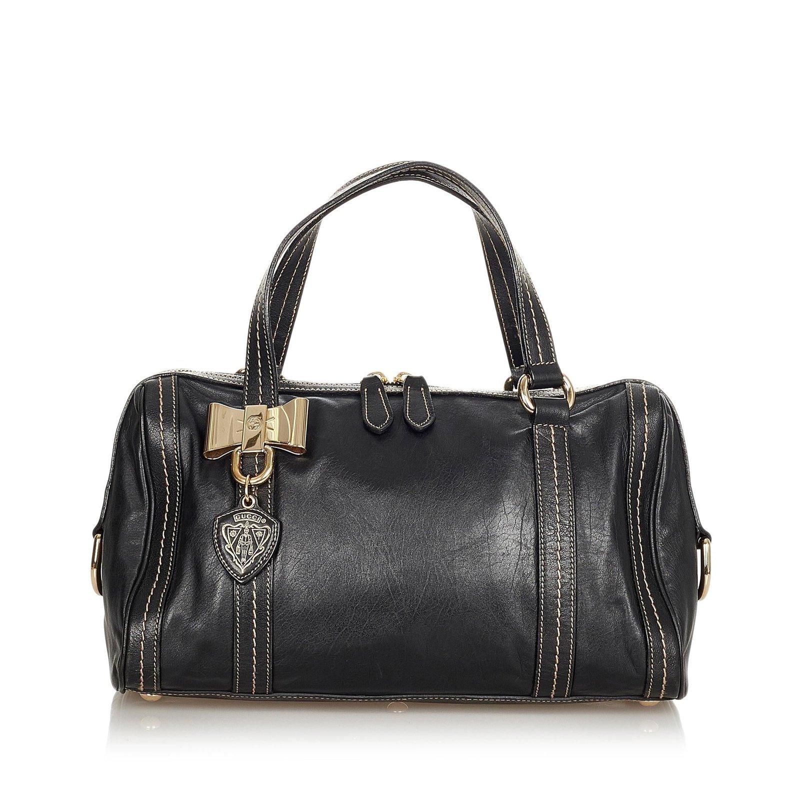 The Gucci Duchessa Leather Handbag is a refined and elegant accessory that embodies timeless craftsmanship. Crafted from black leather with calf accents, this handbag features a structured Boston-style silhouette with flat leather straps for comfortable handheld carry. Polished hardware adds a touch of sophistication.