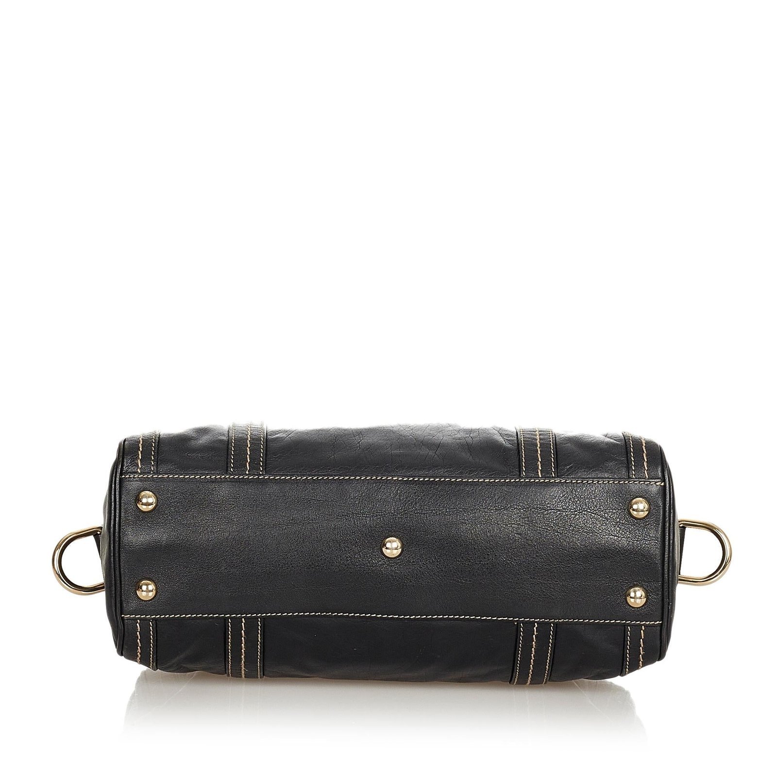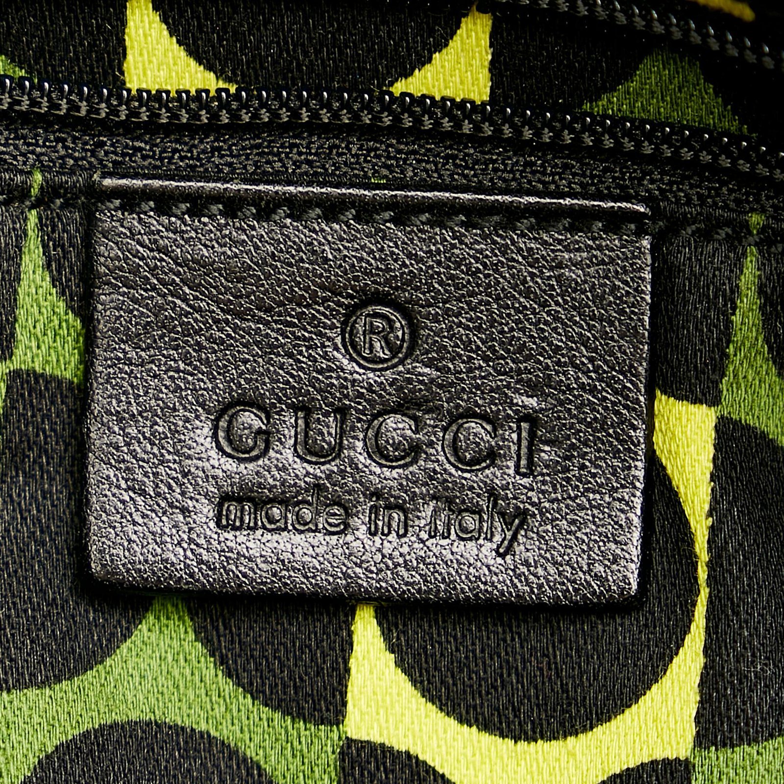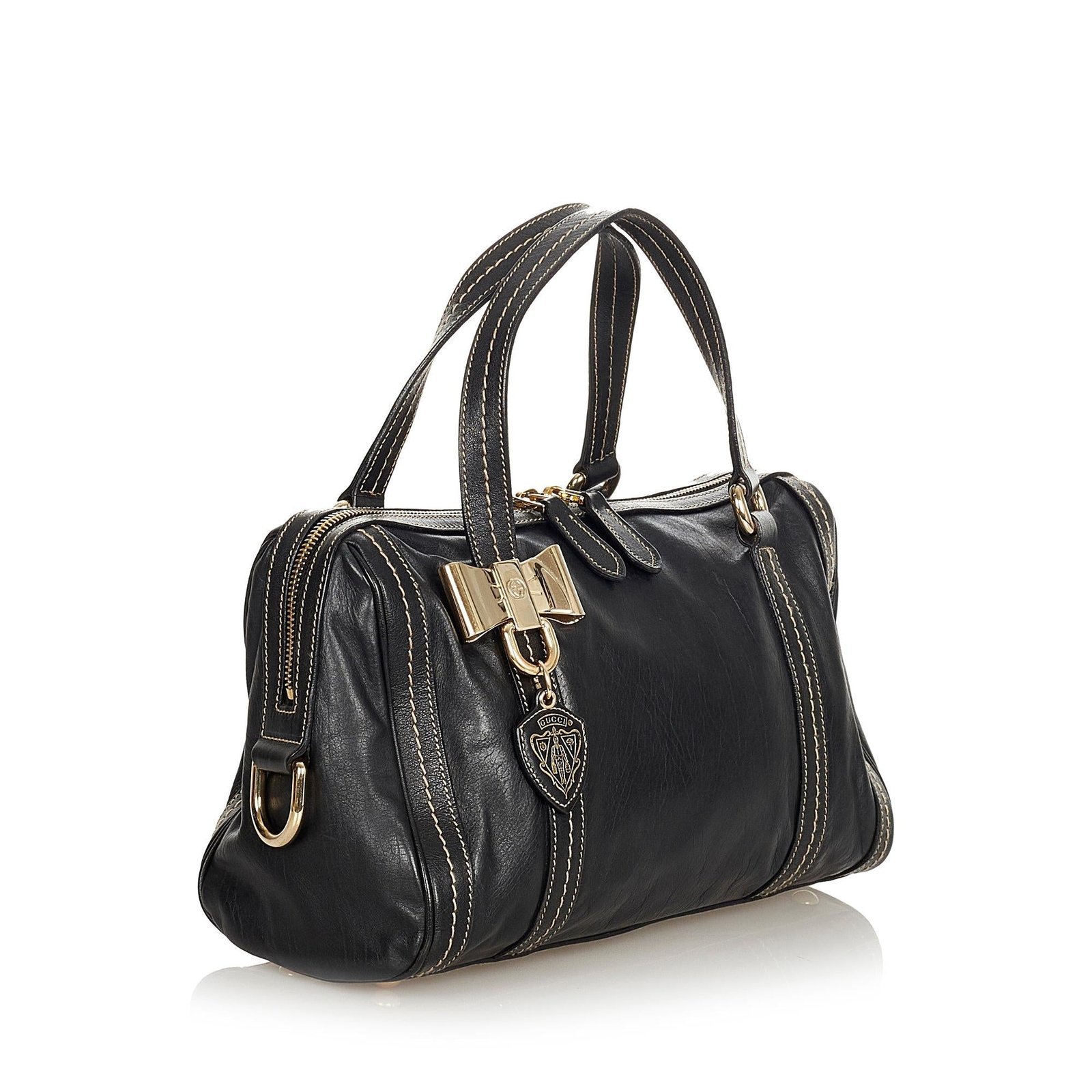 The Gucci Duchessa Leather Handbag is a refined and elegant accessory that embodies timeless craftsmanship. Crafted from black leather with calf accents, this handbag features a structured Boston-style silhouette with flat leather straps for comfortable handheld carry. Polished hardware adds a touch of sophistication.