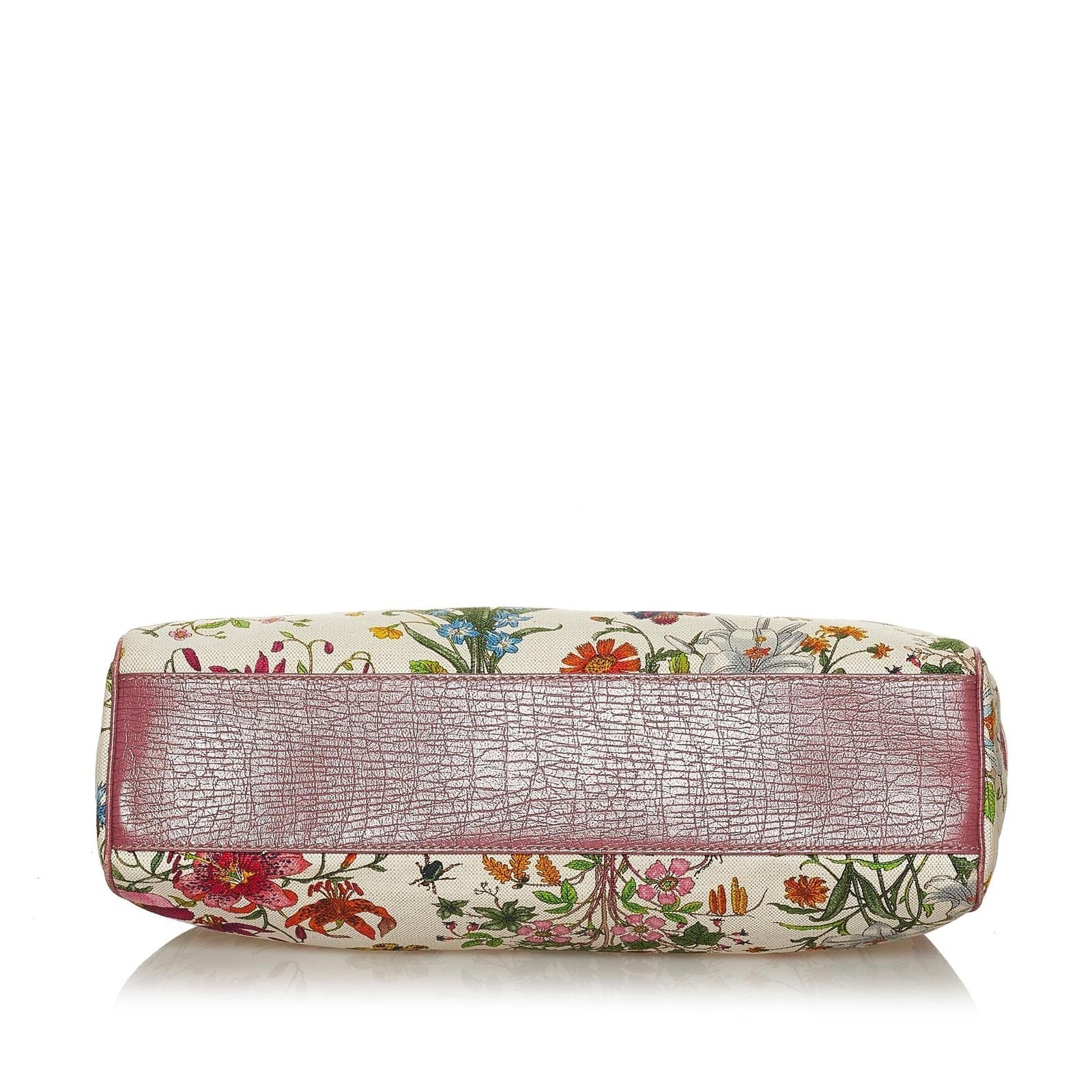 - White multi-color floral printed canvas exterior with leather and calf accents