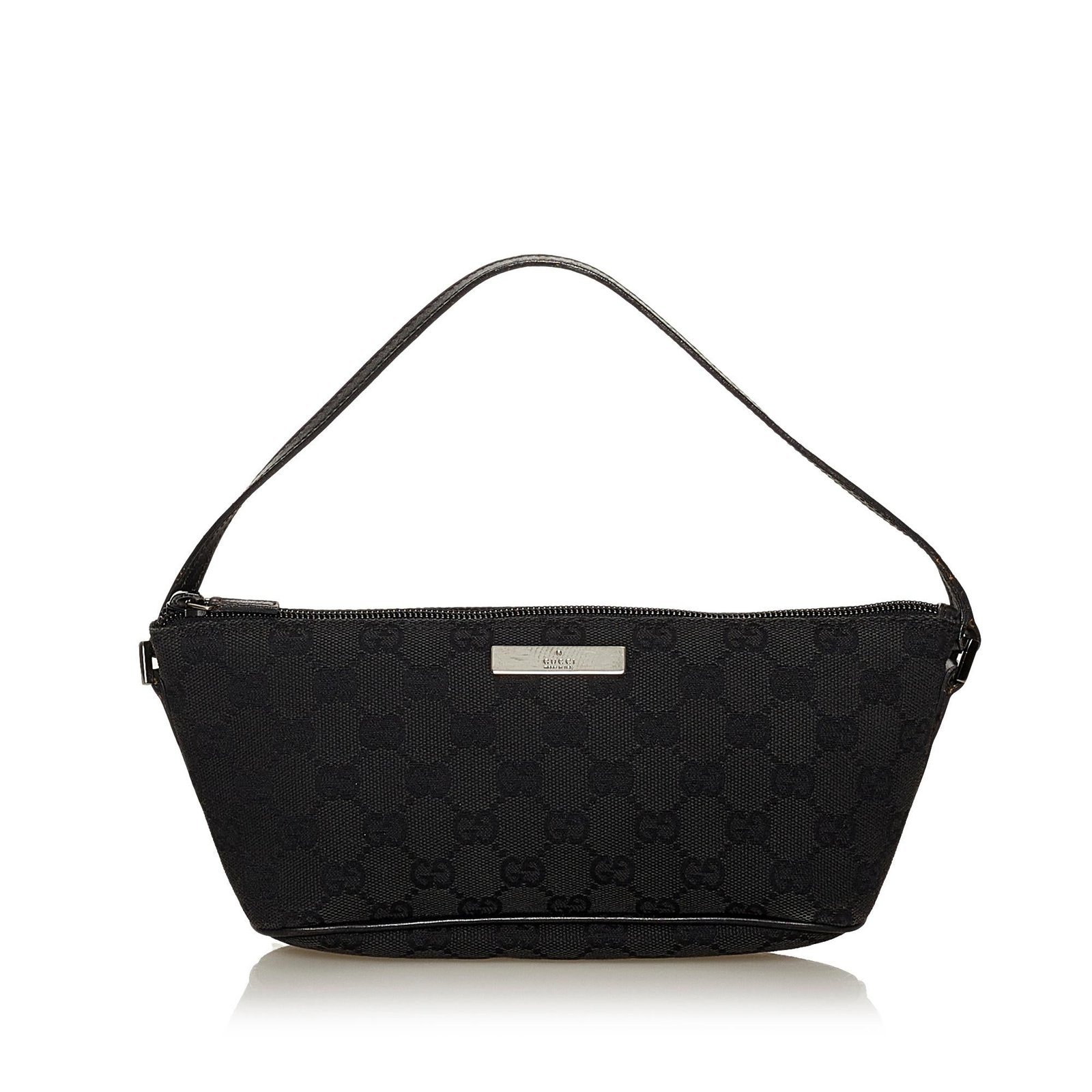 The Gucci GG Canvas Boat Baguette is a refined and versatile bag, crafted from GG canvas and smooth leather in a classic black hue. Its compact yet structured silhouette exudes understated elegance, making it a perfect accessory for both casual outings and sophisticated occasions. The top handle allows for comfortable hand-carry, while the interior is thoughtfully lined to keep your essentials organized and easily accessible.