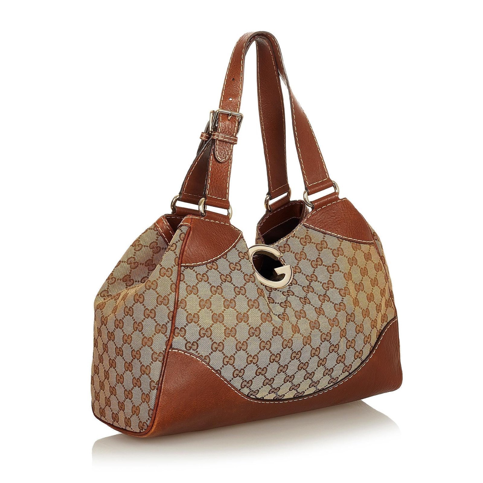 The Gucci GG Canvas Charlotte Shoulder Bag is a sophisticated and versatile accessory, crafted from GG canvas, leather, and calfskin in a rich brown hue. Its structured shoulder silhouette exudes timeless elegance while offering practical functionality for everyday use. The top handle provides comfortable hand-carry, and the interior is thoughtfully lined to keep your essentials organized and easily accessible.
