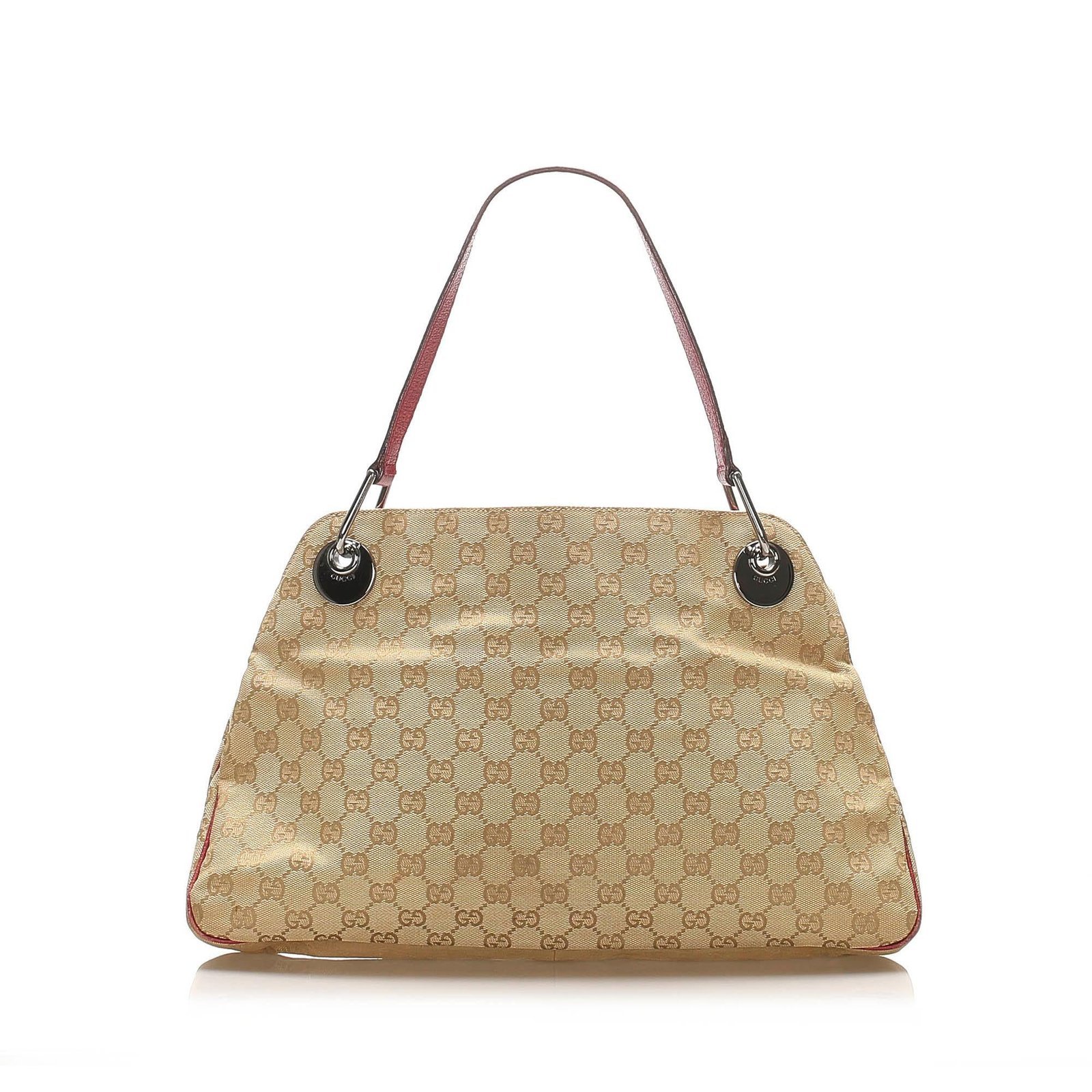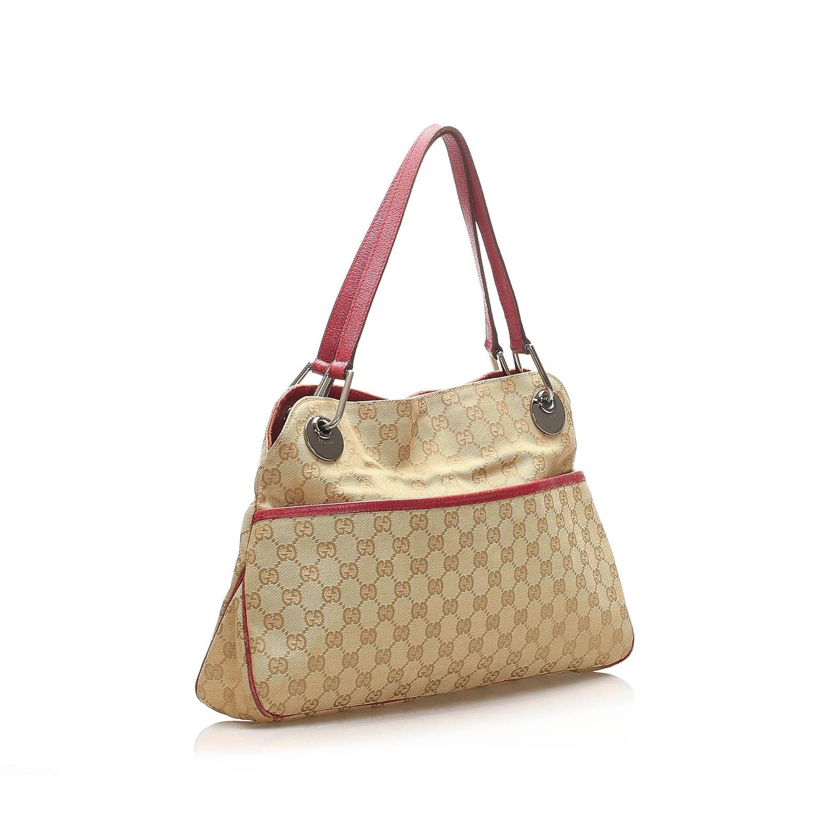 The Gucci GG Canvas Eclipse Shoulder Bag is a chic and versatile accessory, crafted from GG canvas and smooth leather in a sophisticated brown and red palette. Its medium-sized structured silhouette exudes timeless elegance while offering practical functionality for everyday use. The single shoulder strap provides comfortable carry, and the interior is thoughtfully lined to keep essentials organized and easily accessible. Gold-tone hardware accents add a refined finishing touch to this classic design.