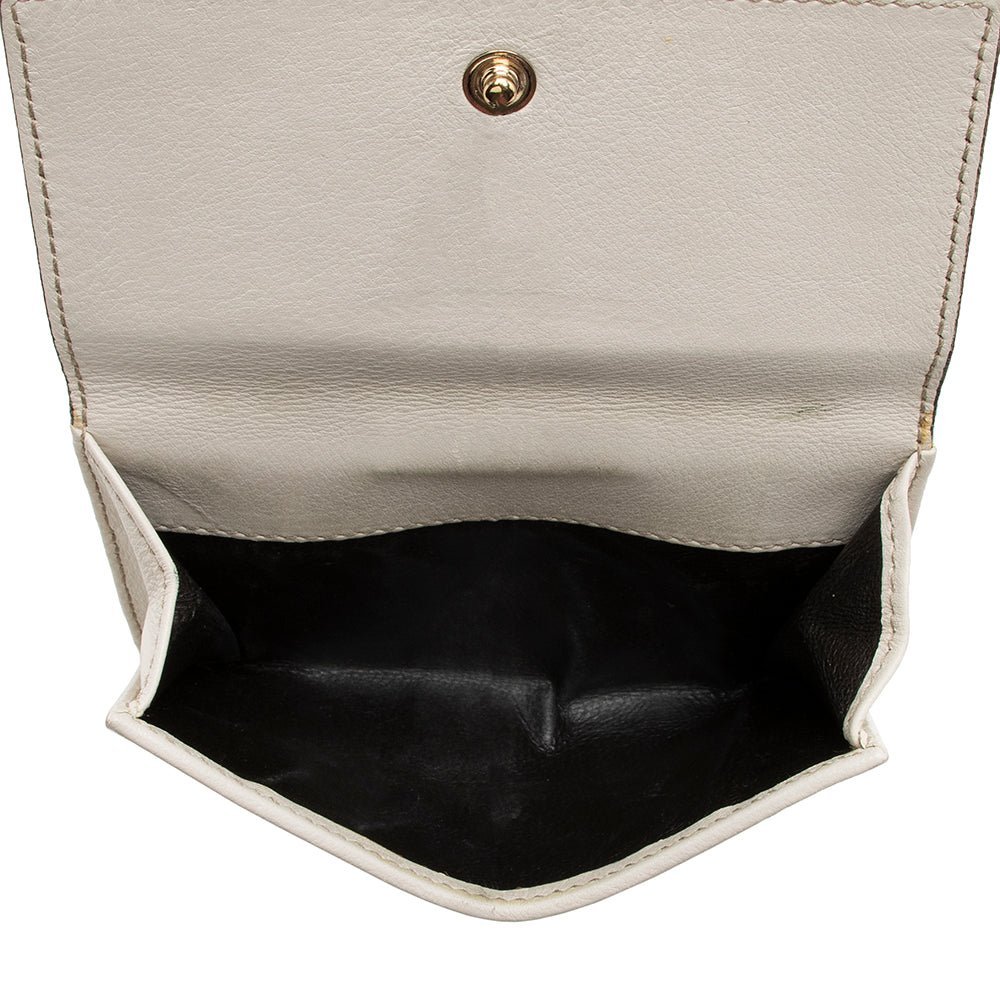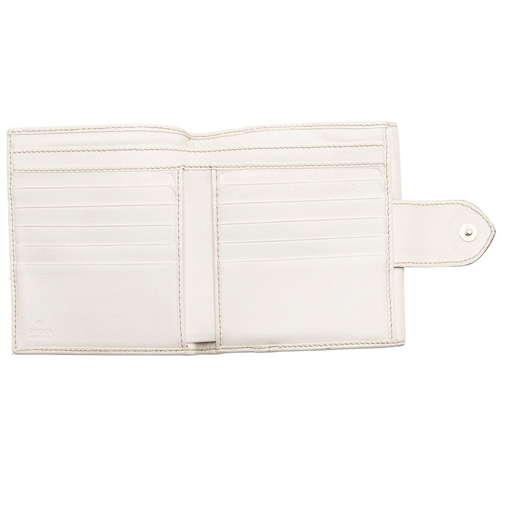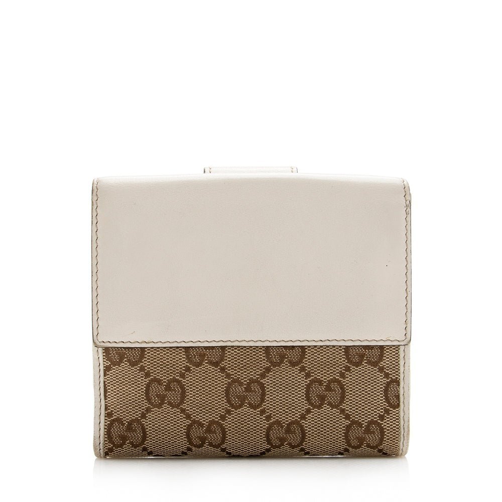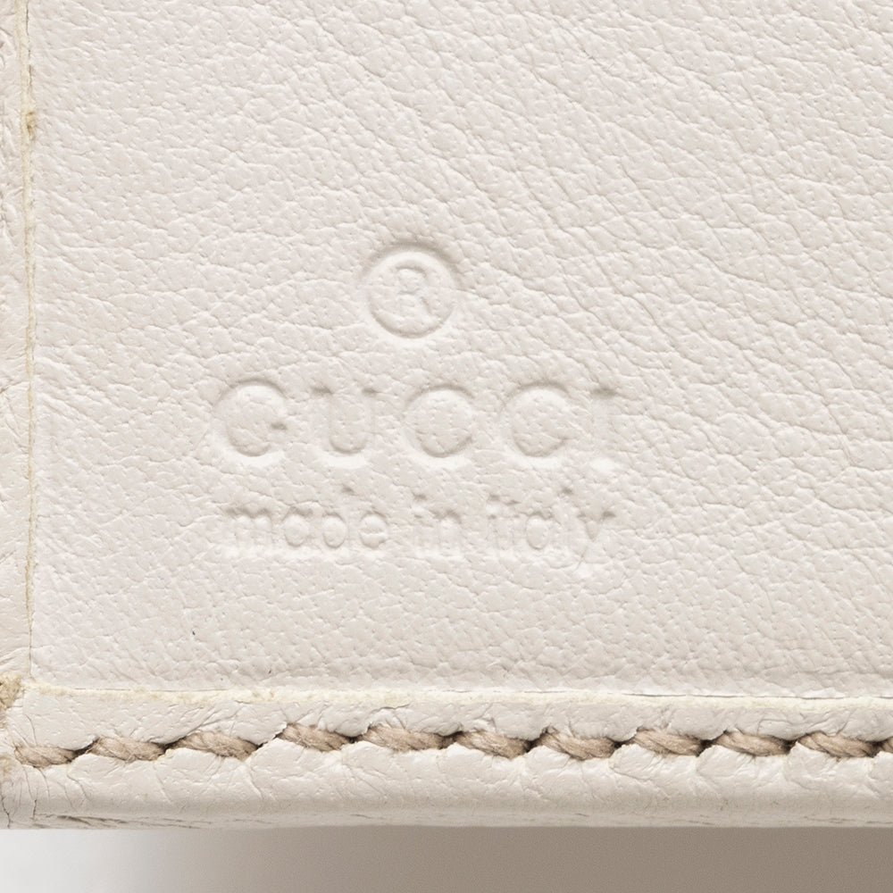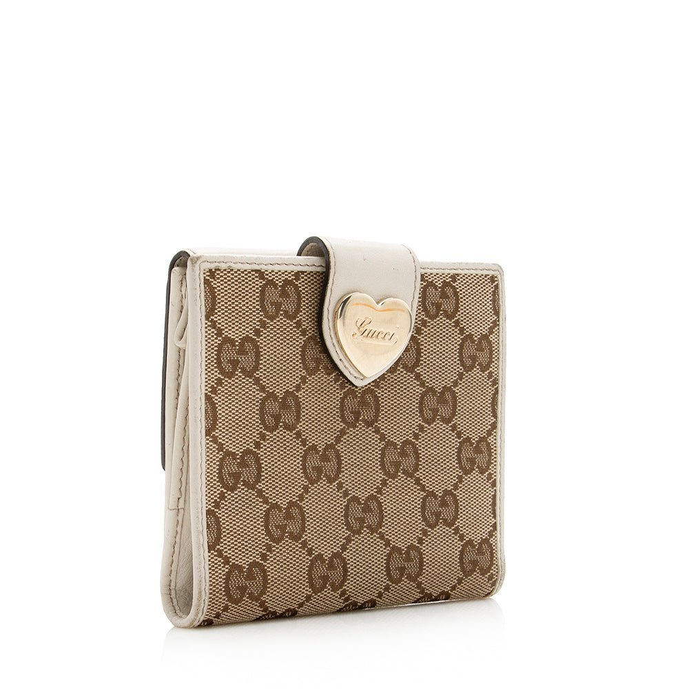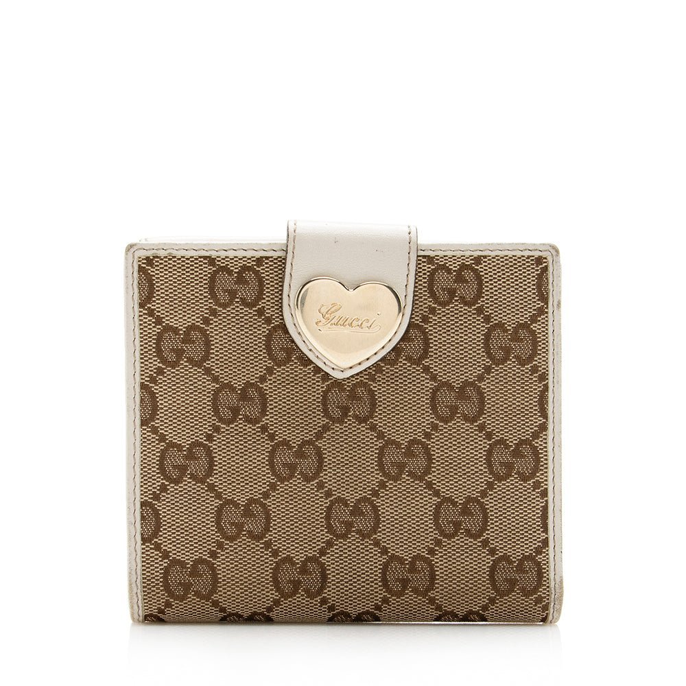 This Gucci compact wallet combines playful charm with luxury craftsmanship. Crafted from signature GG canvas with leather trim, it features a heart-shaped flap and gold-tone hardware for a refined finish. The leather-lined interior offers organized storage for cards and small essentials, making it a stylish and practical accessory for everyday use.
