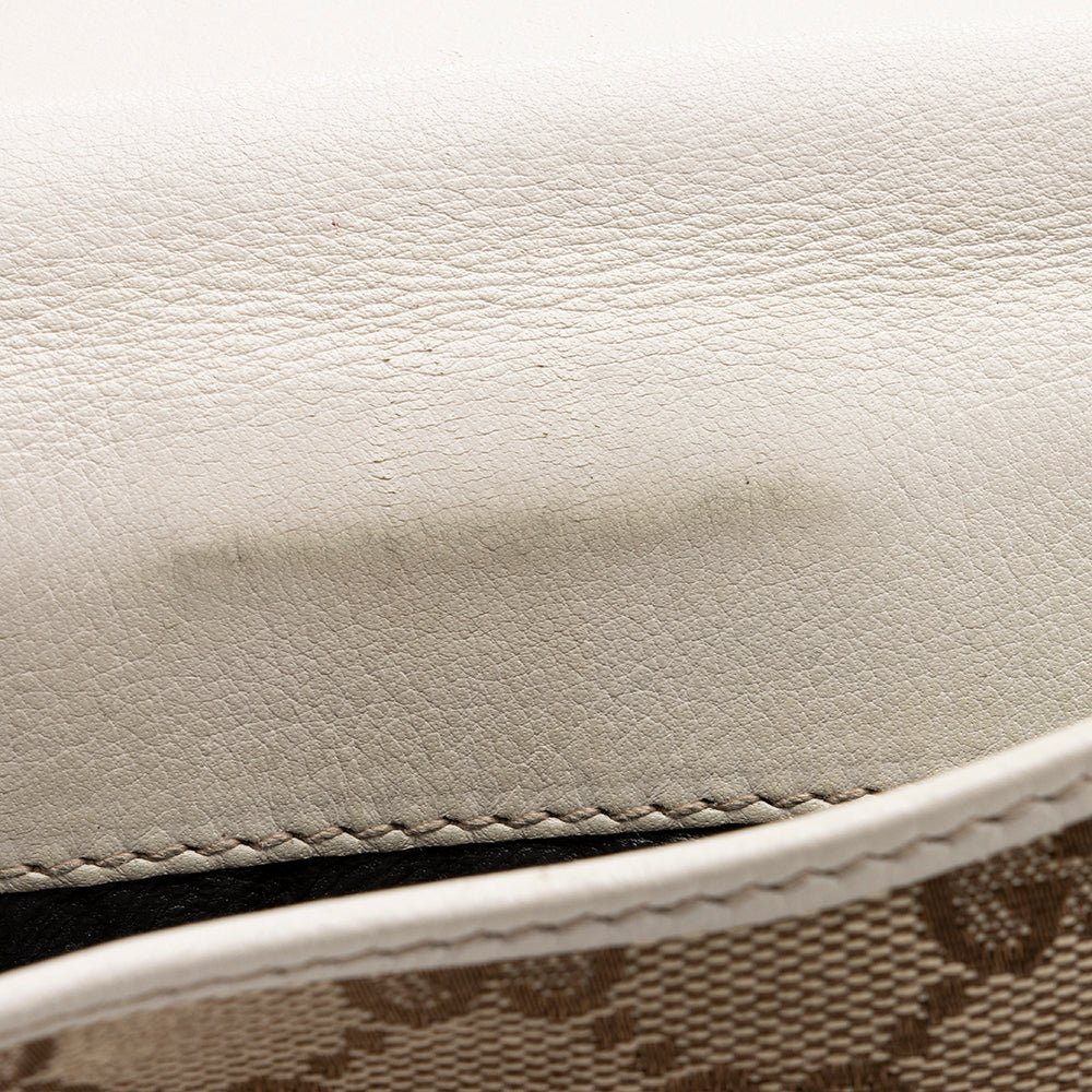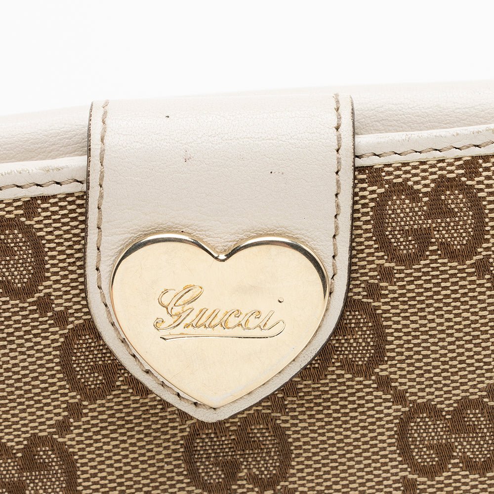 - GG canvas and leather construction with heart-flap design