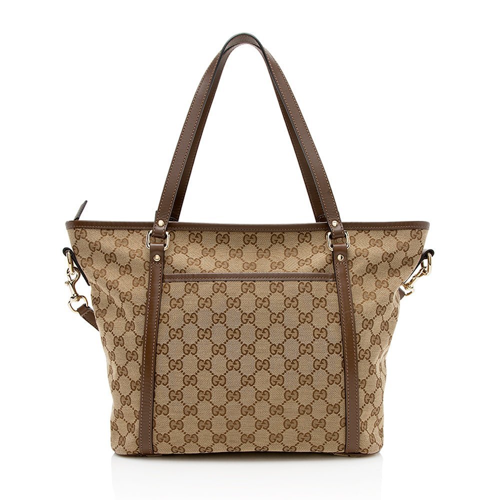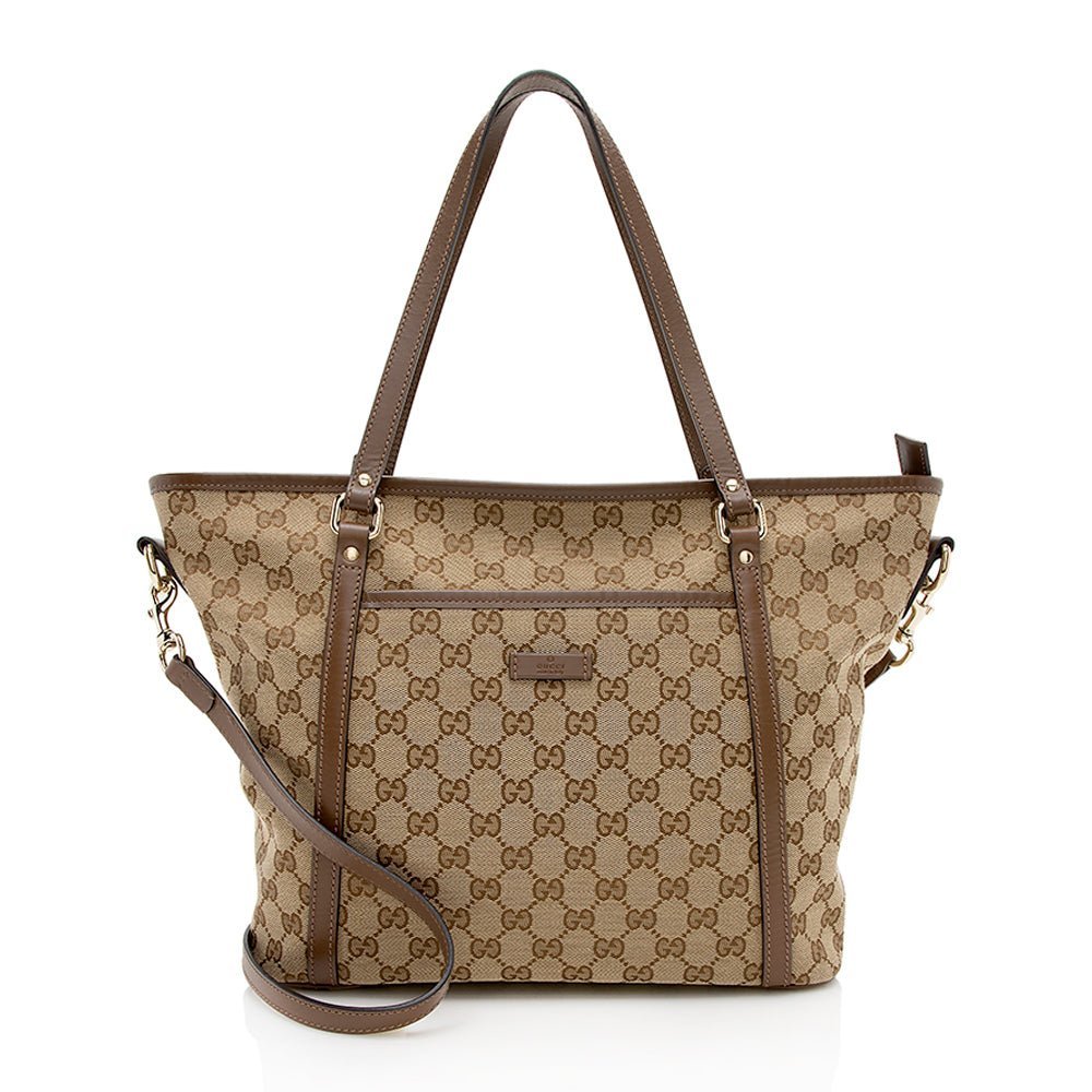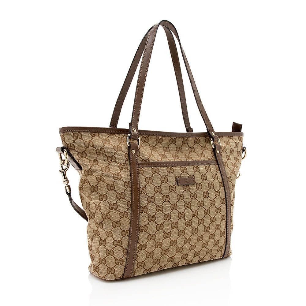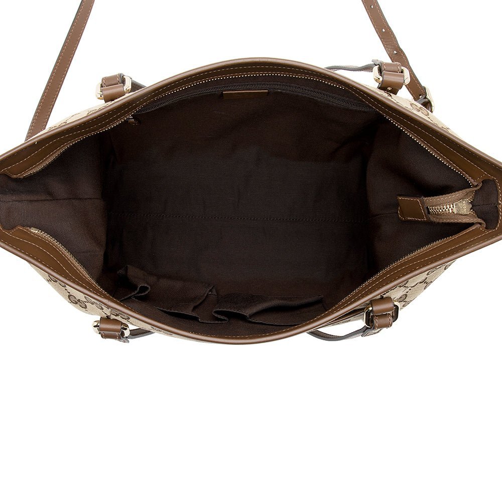 Elevate your everyday look with this Gucci medium tote, a timeless blend of style and practicality. Crafted from durable GG canvas in a sophisticated beige and brown color combination, it is complemented by subtle gold-tone hardware that adds a touch of luxury.