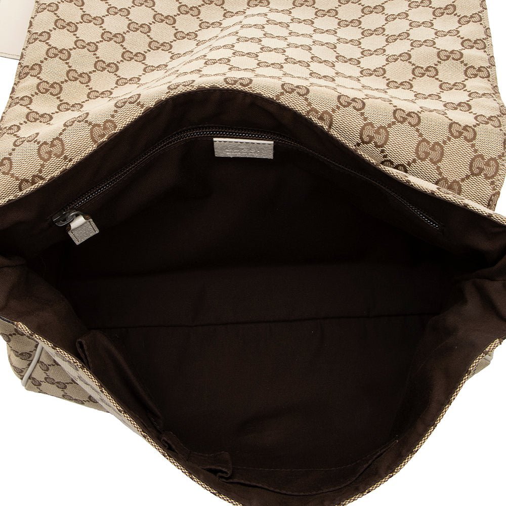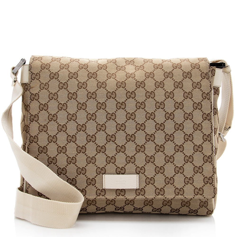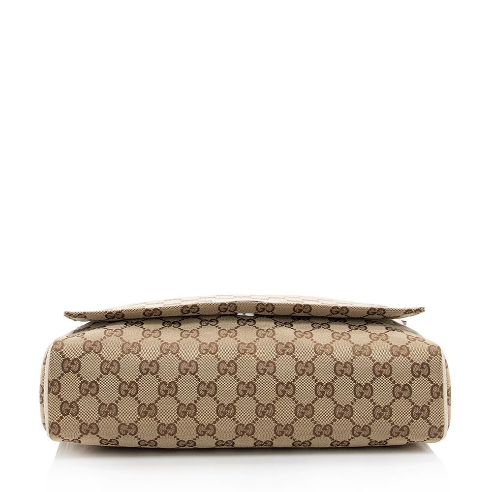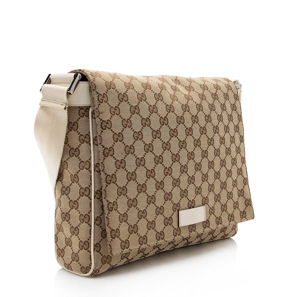 This Gucci messenger bag is crafted from signature GG canvas with smooth leather trim, combining both durability and timeless style. Designed for convenience and versatility, it features an adjustable flat shoulder strap with a leather shoulder guard for comfortable wear throughout the day.