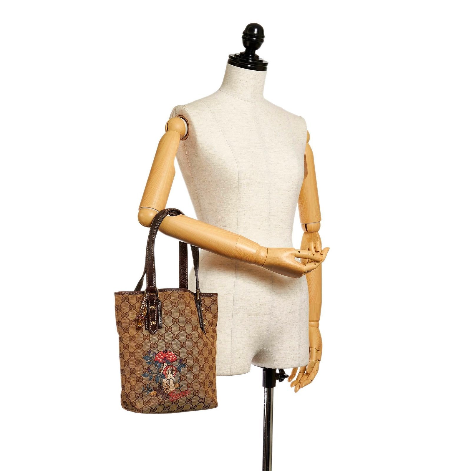 This playful Gucci tote bag is crafted from the brand’s signature GG canvas and adorned with colorful mushroom embroidery, making it a fun and stylish addition to any wardrobe. The bag features two leather top handles for comfortable carrying and a canvas-lined interior that offers practical space for daily essentials.